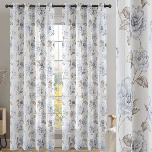 Antique charm blooms from the Belgrave Floral Grommet Curtain Panel. With a soft semi-sheer design, each white polyester curtain panel features climbing blue and light taupe blossoming rose vines for a lush garden-inspired look. Sold individually, each panel hangs via 1.5" dia. brushed silver metal grommets and measures 52"Wx84"L. Machine washable. Imported.