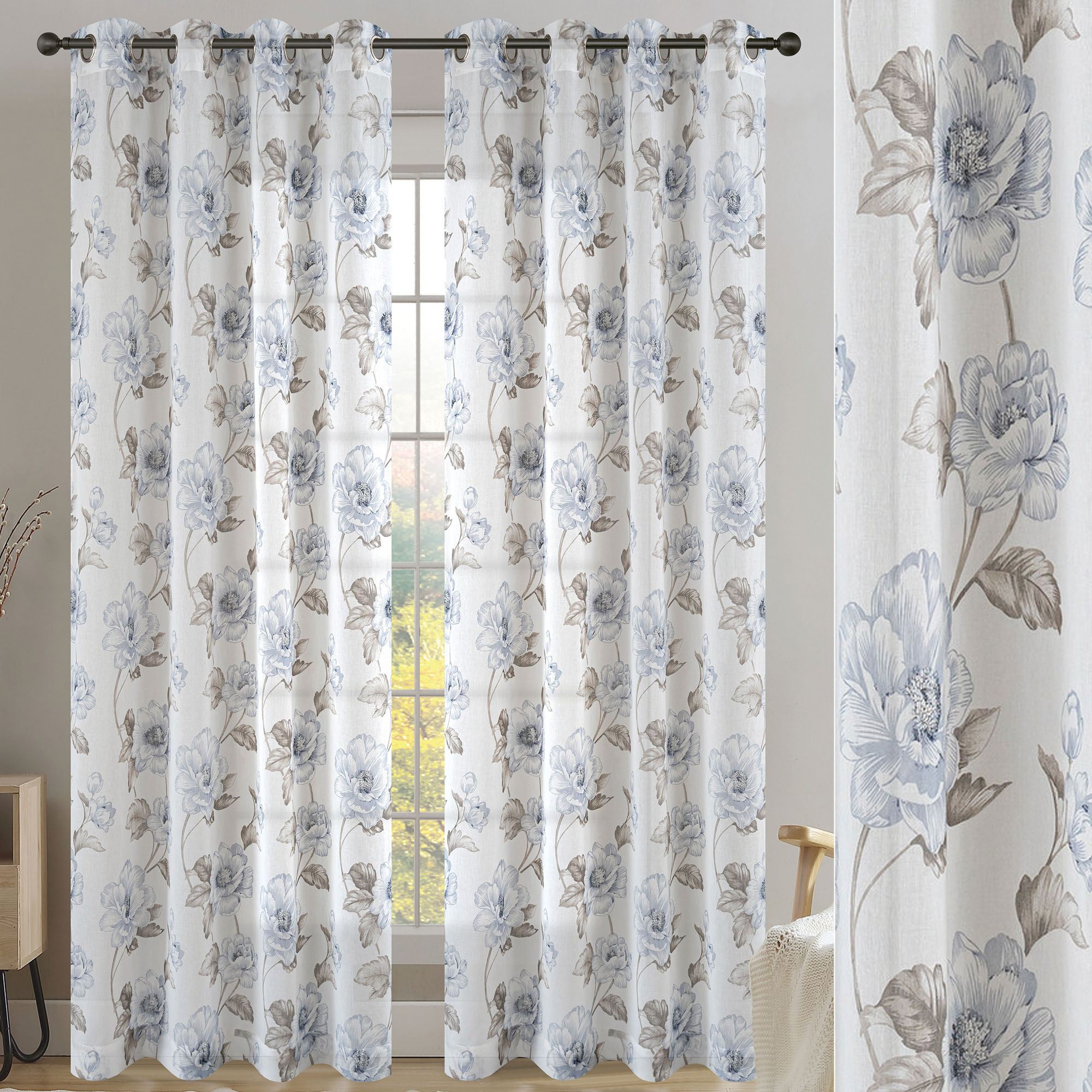Belgrave Blue and Light Taupe Rose Vine Floral Semi Sheer Grommet Curtain Panel
