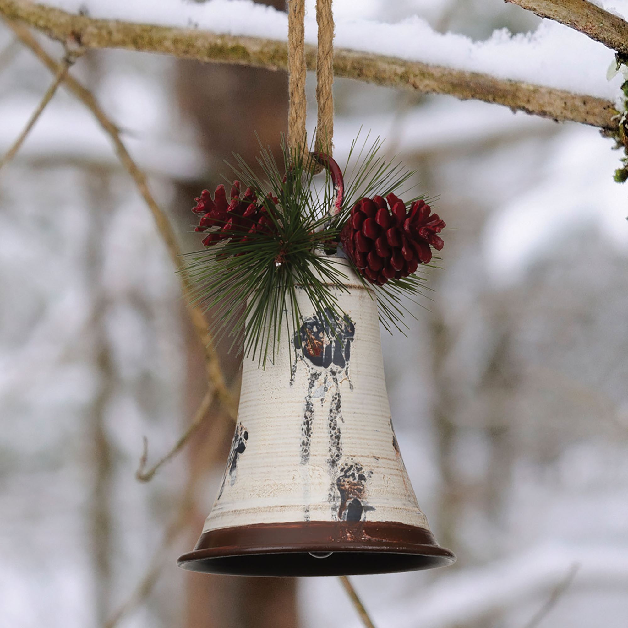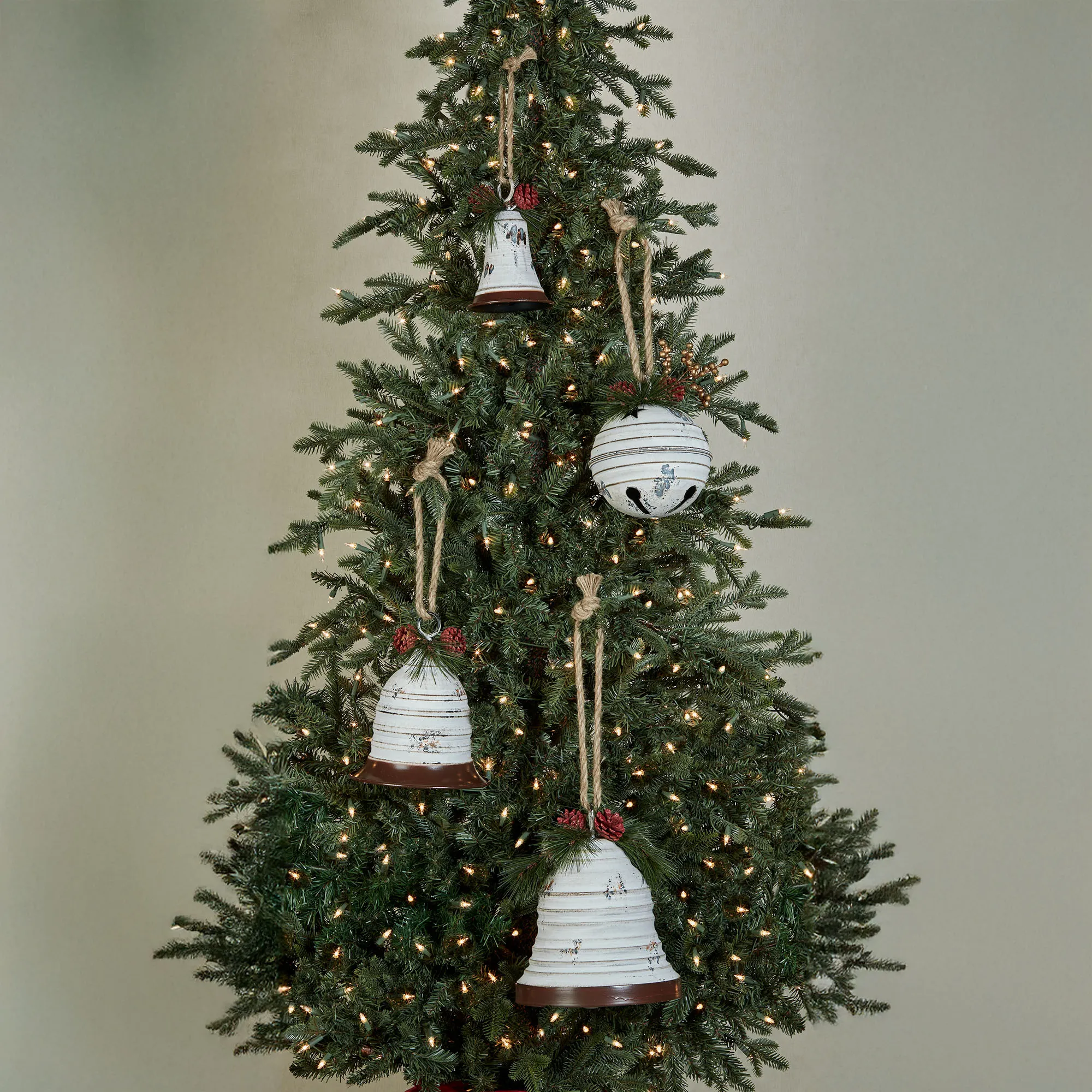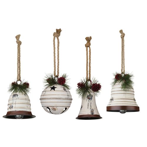 Strike a beautiful note inside or outside your home year round with the Bell Ornament. Finished in distressed, antique white and brown, each metal accent features a rustic winter charm detailed with faux pine needles, pine cones, and a jute rope hanger. Bell has a brown solid ball clapper; the other three have a silver jingle bell clapper. Ornaments are sold individually. Bell is 4.5"dia.x7"H. Beehive Bell is 7.5"dia.x9"H. Round Bell is 6.5"dia.x8"H. Holiday Bell is 9"dia.x10.5"H.