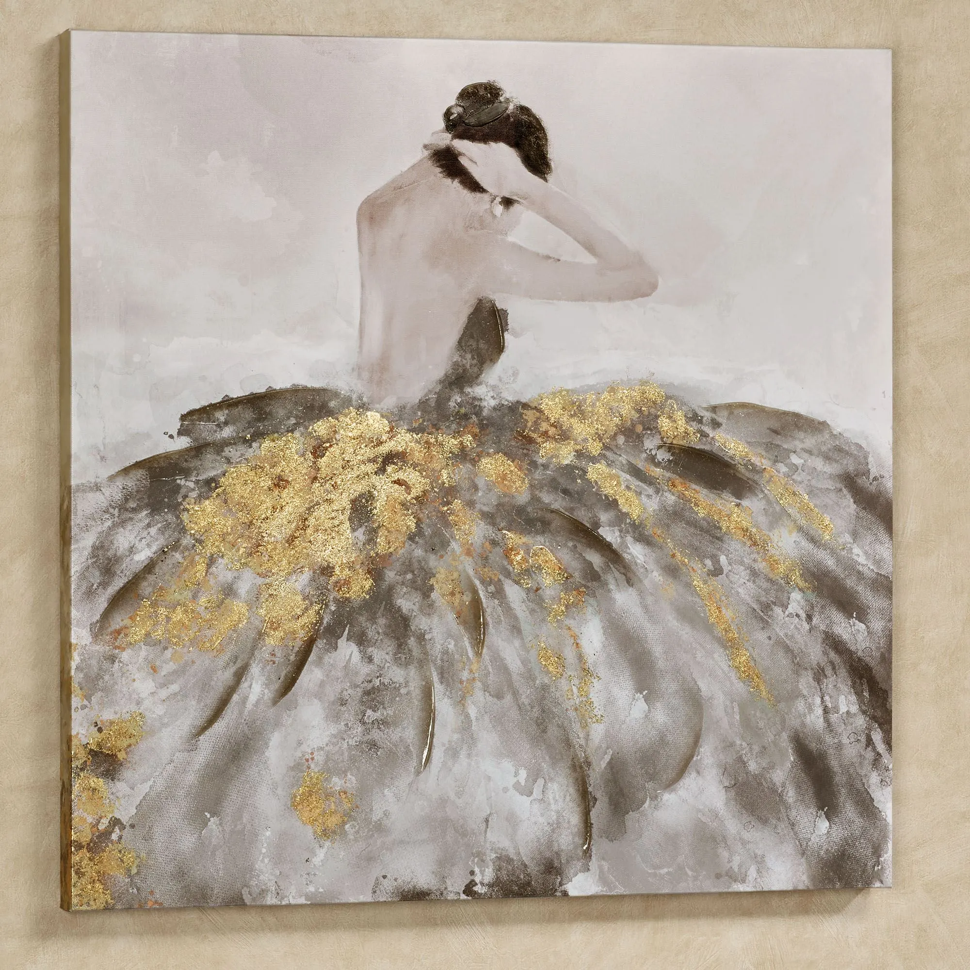 The Bella Ballerina adjusts her hair, perfecting her beautiful look for tonight's performance. Gallery-wrapped over a wood frame, the giclee canvas wall art features a view of the woman from behind as she wears her gorgeous gray gown. Handpainted colored gel embellishments and gold foil accents adorn the skirt for further glamour. Ballerina wall art measures 32"sq.x2"D.