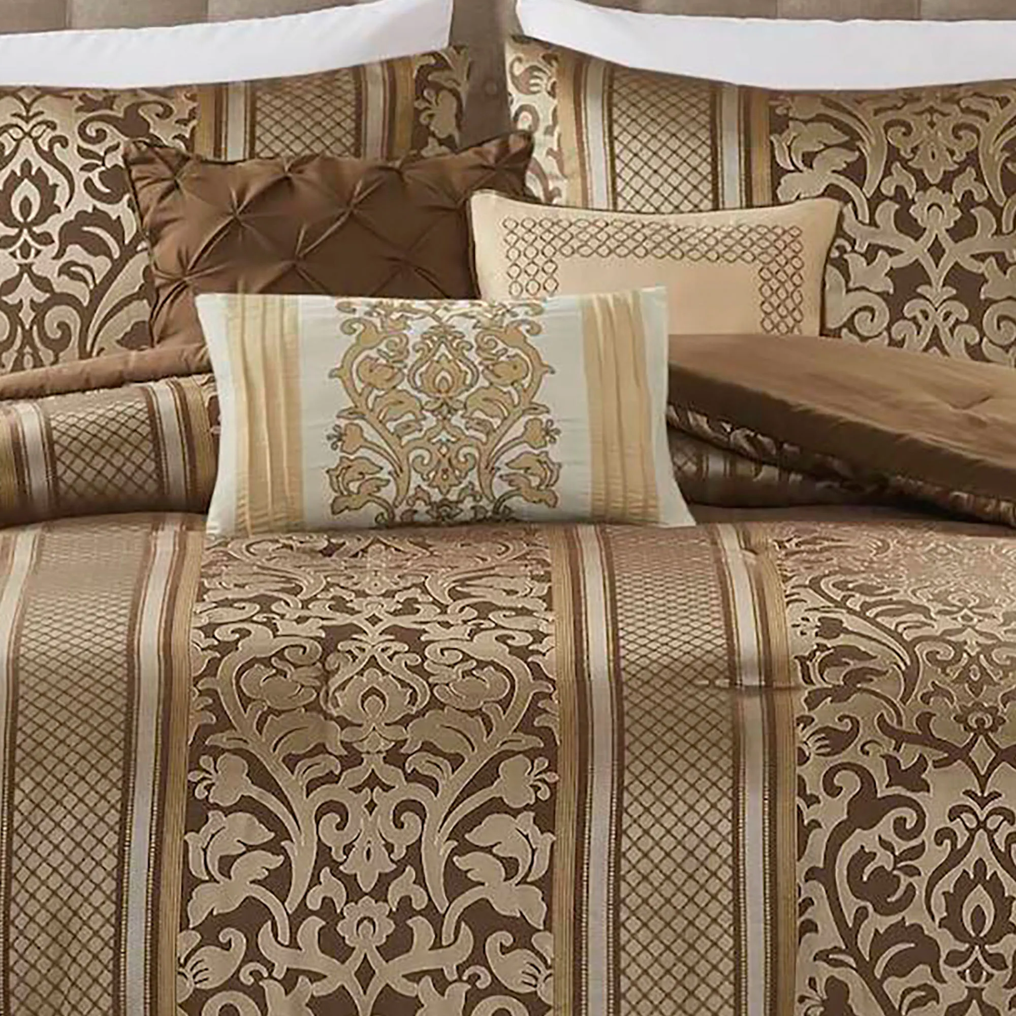 Refine your decor with the lavish Bella Bedding by Madison Park. The 6-piece Bed Set includes a comforter, 2 shams, and 3 accent pillows. The tailored, polyester comforter features woven-jacquard leaves alternating with stripes and geometric designs. Colors include beige, gold, and brown. Polyester microfiber backing is brown. Click on the Details tab to read about the other items. Fill is hypoallergenic polyester. Machine washable; spot clean the pillows. Imported.