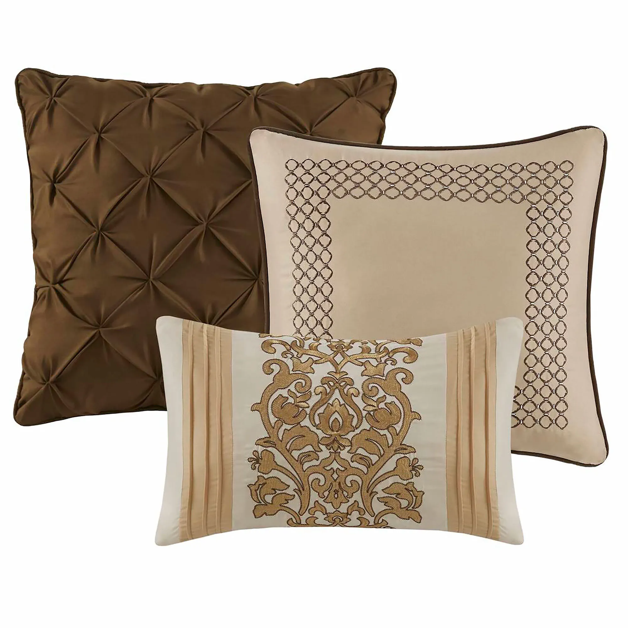 The 18" square pillow has all-over pintucks on brown and piped ends. The 16" square pillow has brown geometric embroidery on beige and piped ends. The tailored rectangle pillow has soft gold leaf embroidery on ivory and soft gold pleats on the sides.