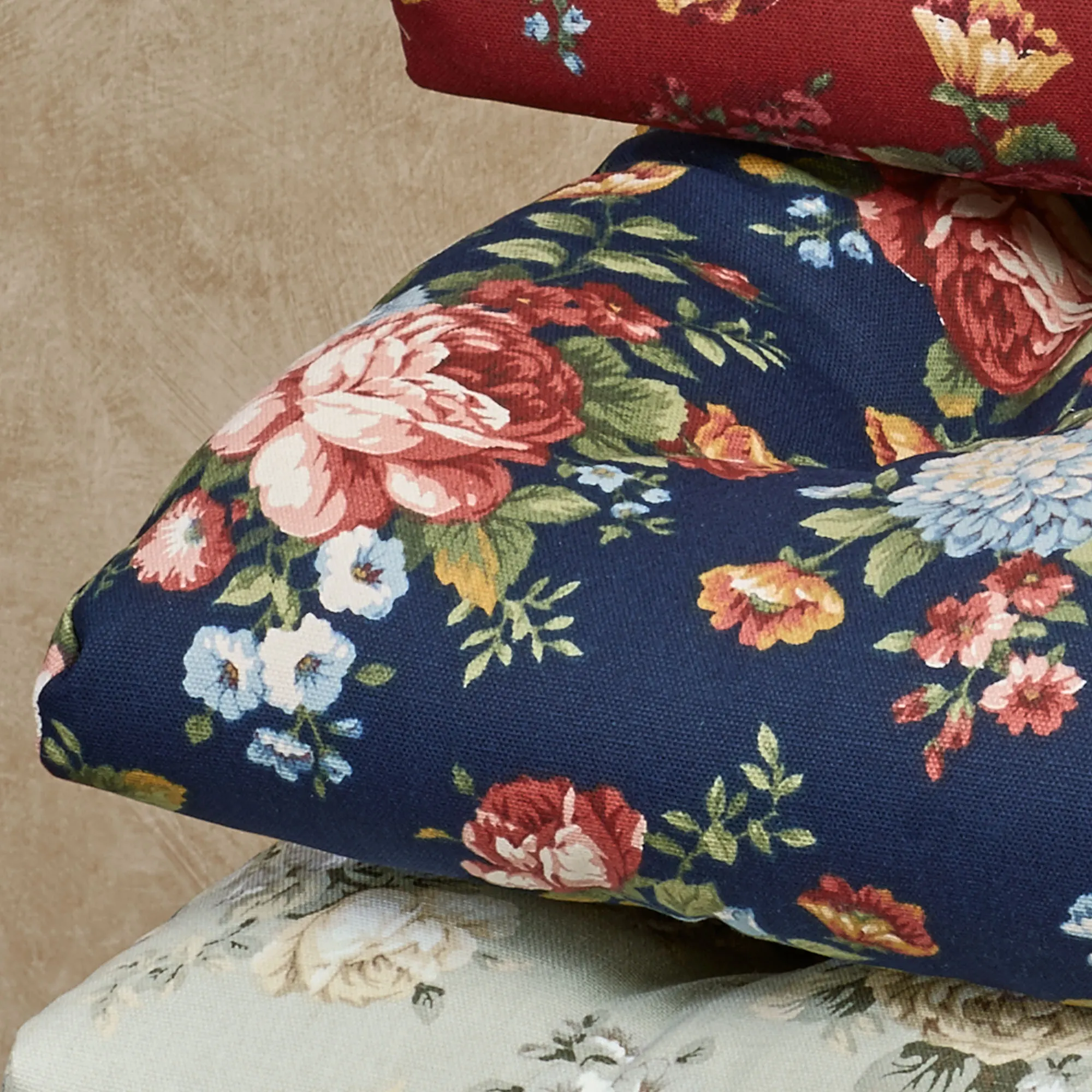 • Floral chair cushions have a nonskid bottom