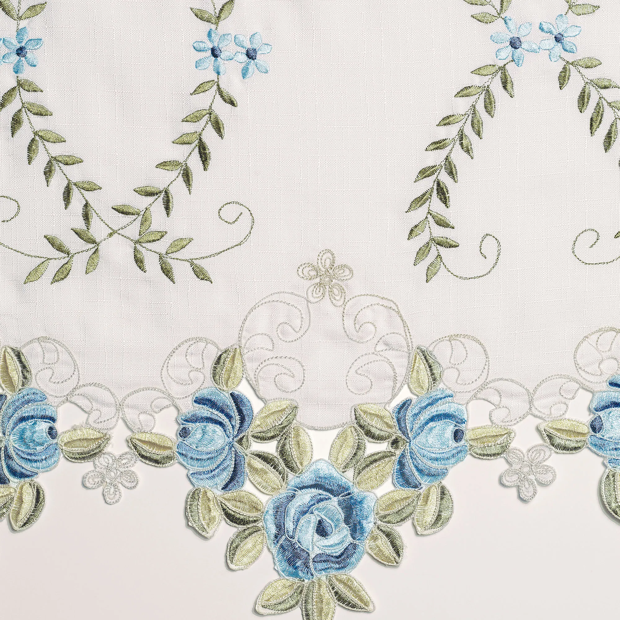 Bella Rose Embroidered Table Runner will add a delicate touch to your decor. This polyester table runner features intricate motifs of florals, scrolls, and garden green laurel leaves on a textured ivory or white ground. Table runner has embroidery and exquisite cutwork around the edges. 14"Wx48"L. Machine washable. Imported.