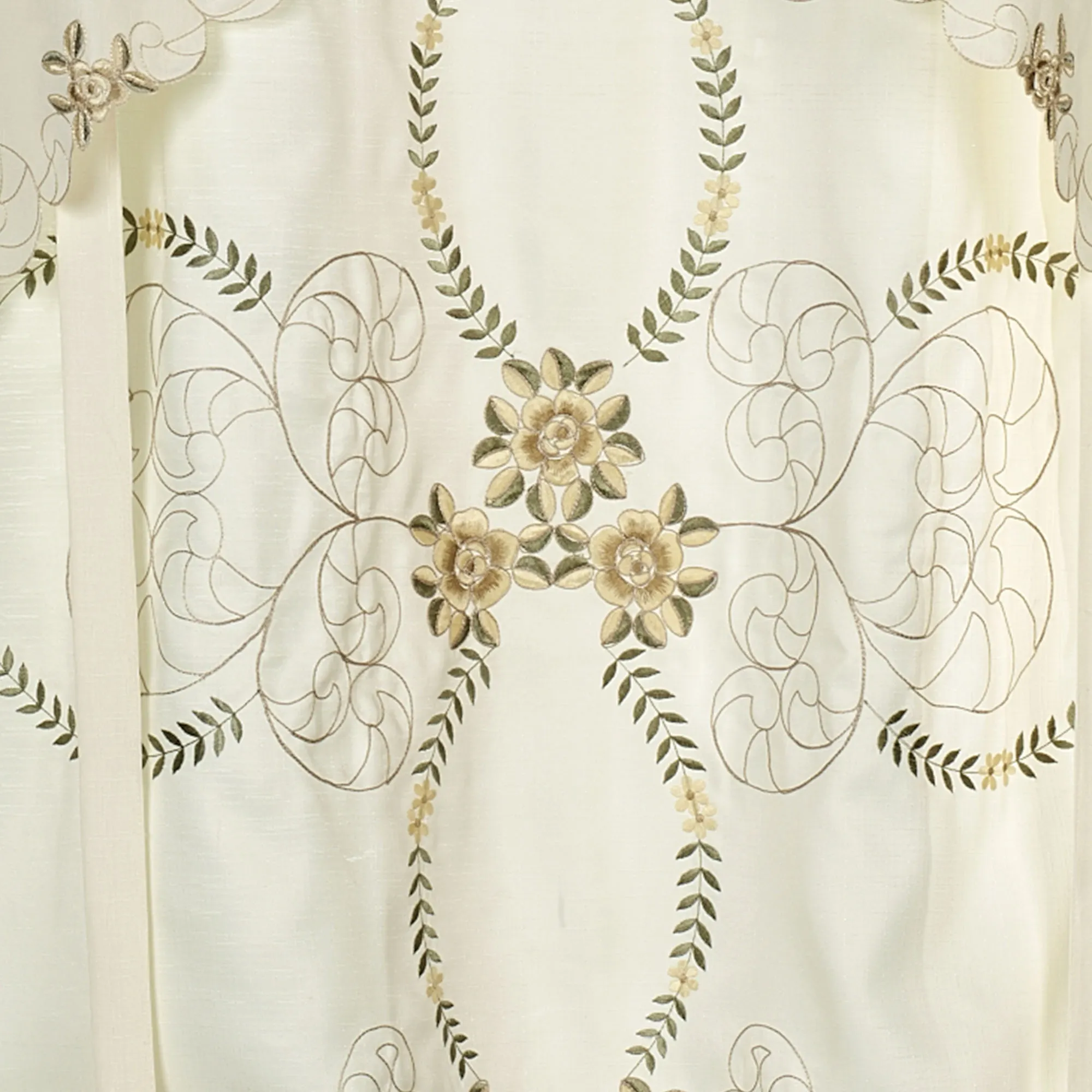 Charming Bella Rose will add a delicate touch to your window with its beautiful embroidery. An intricate floral motif of delicate florals, golden scrolls, and garden green laurel leaves graces the grounds. Polyester window accents have a 1.5" pocket to display your decorative rod. Specify Blue on White, Gold on Ivory, or Rose on Ivory.