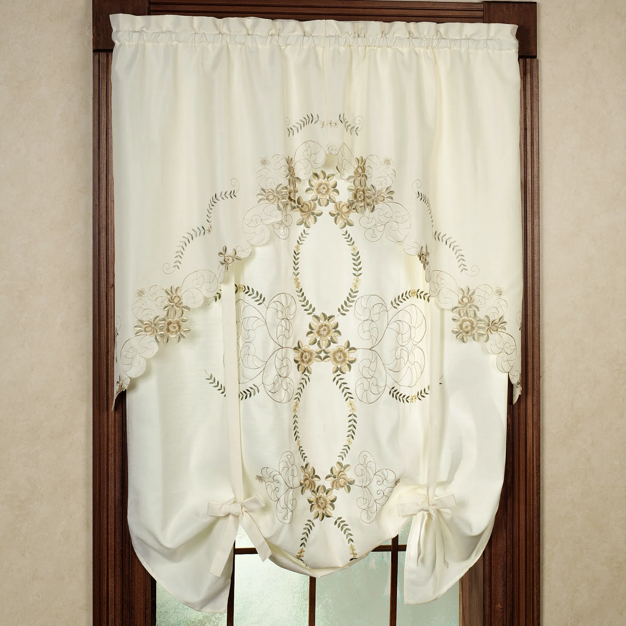 Bella Rose Tie-Up Shade will beautifully embellish your window with its delicate florals. An intricate floral motif of florals, golden scrolls, and green laurel leaves graces the grounds. Polyester window accents have a 1.5" rod pocket. Washable. Imported.