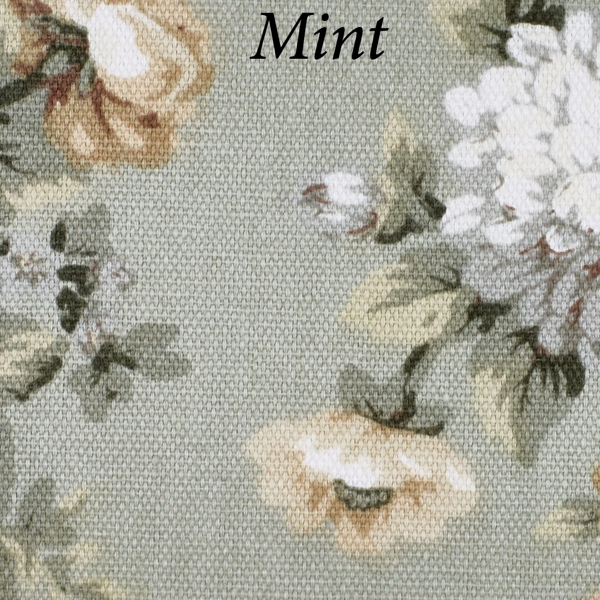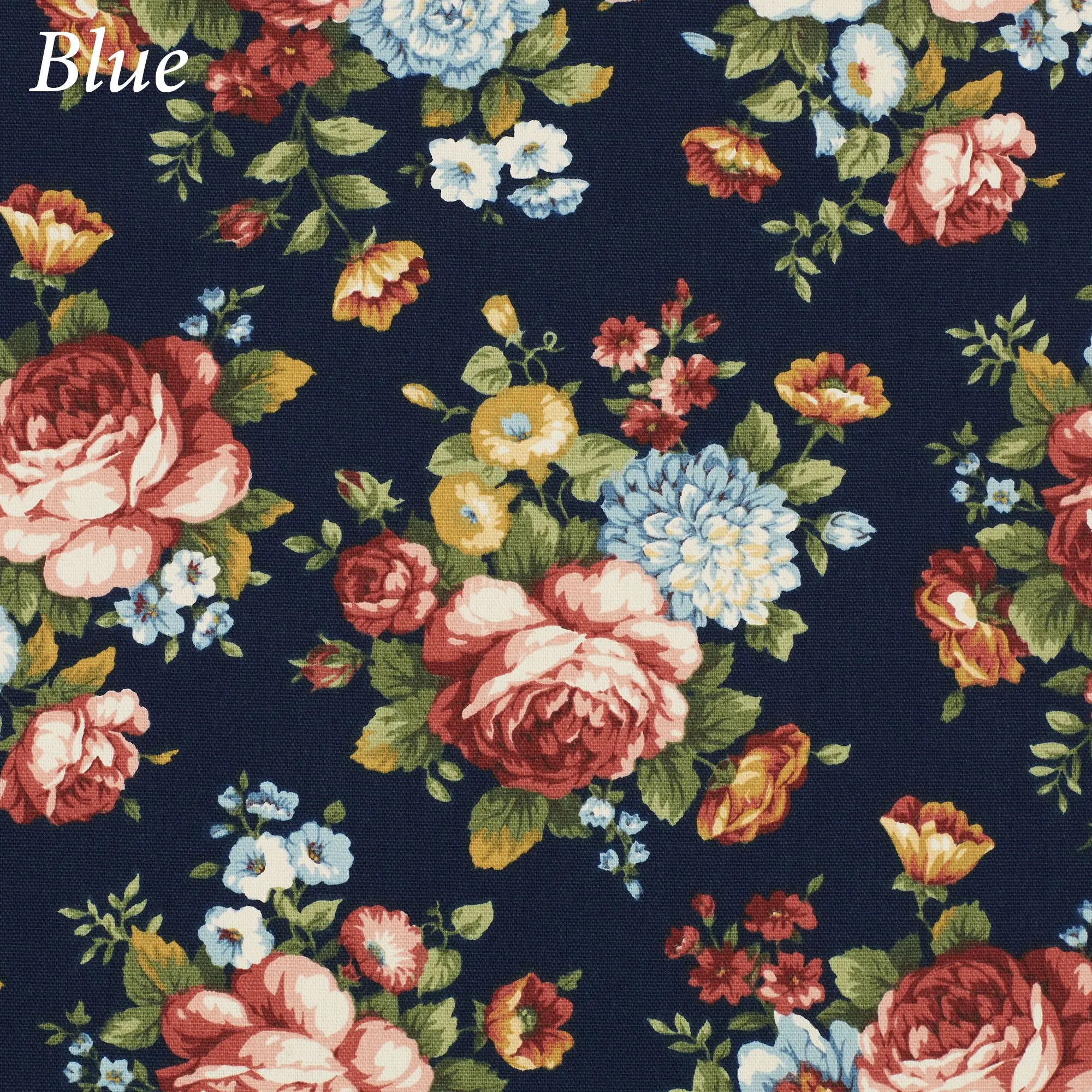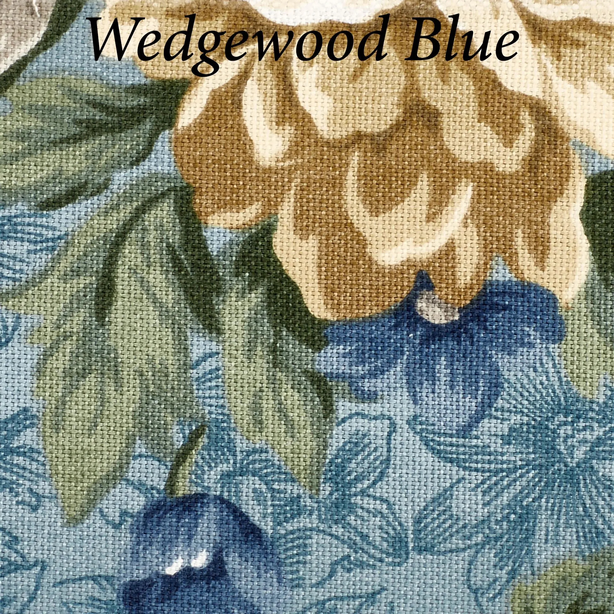 Blue and Red have flowers in garnet rose, burgundy, pink, light blue, light cream, and gold with leaves in shades of green. Mint has flowers in tan, natural, gray, and white with leaves in shades of green. Wedgewood Blue has flowers in harvest gold, steel blue, midnight blue, taupe, tan, and ivory with leaves in shades of green.