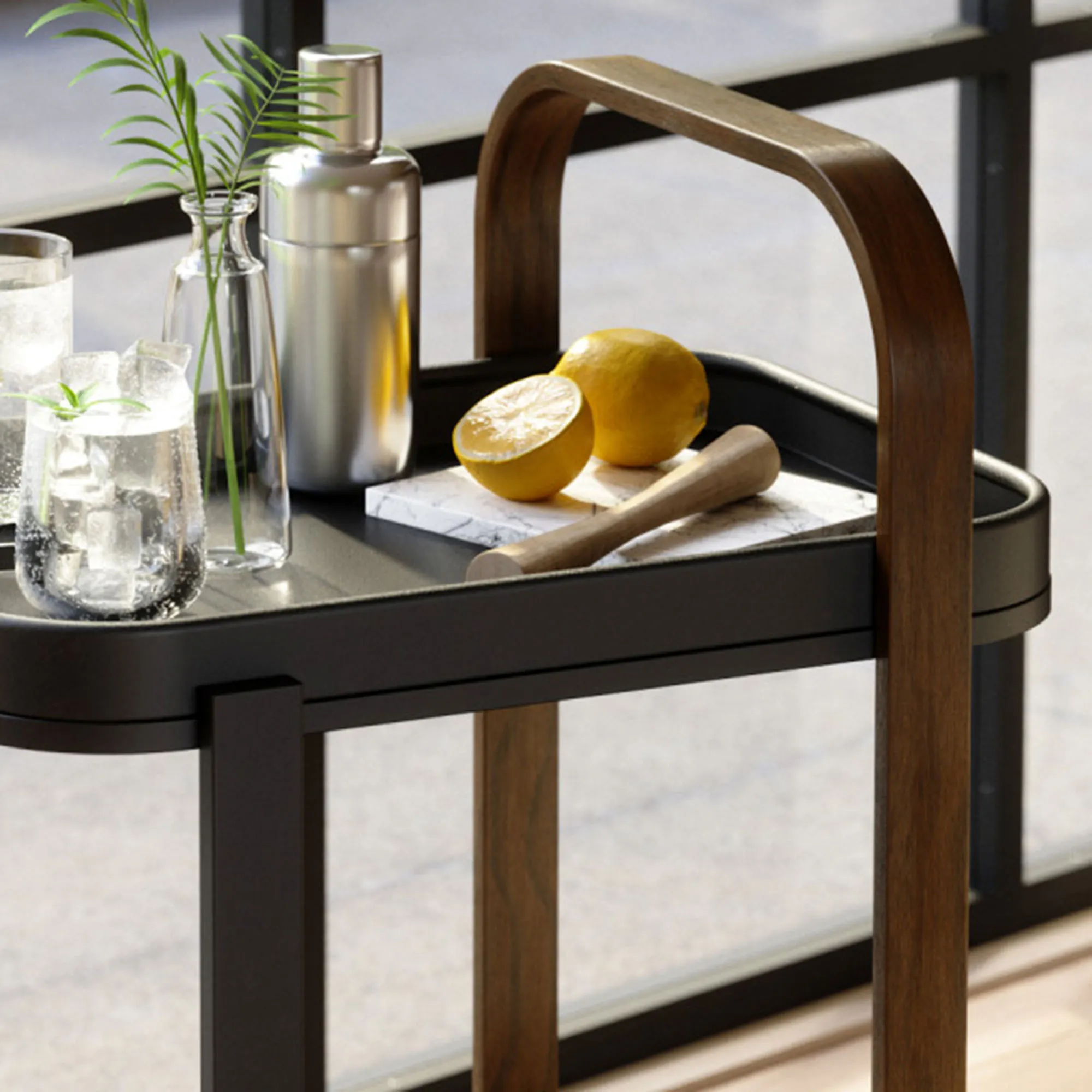 The Bellamy Serving Cart with Tray with metal, wood, and rubber.