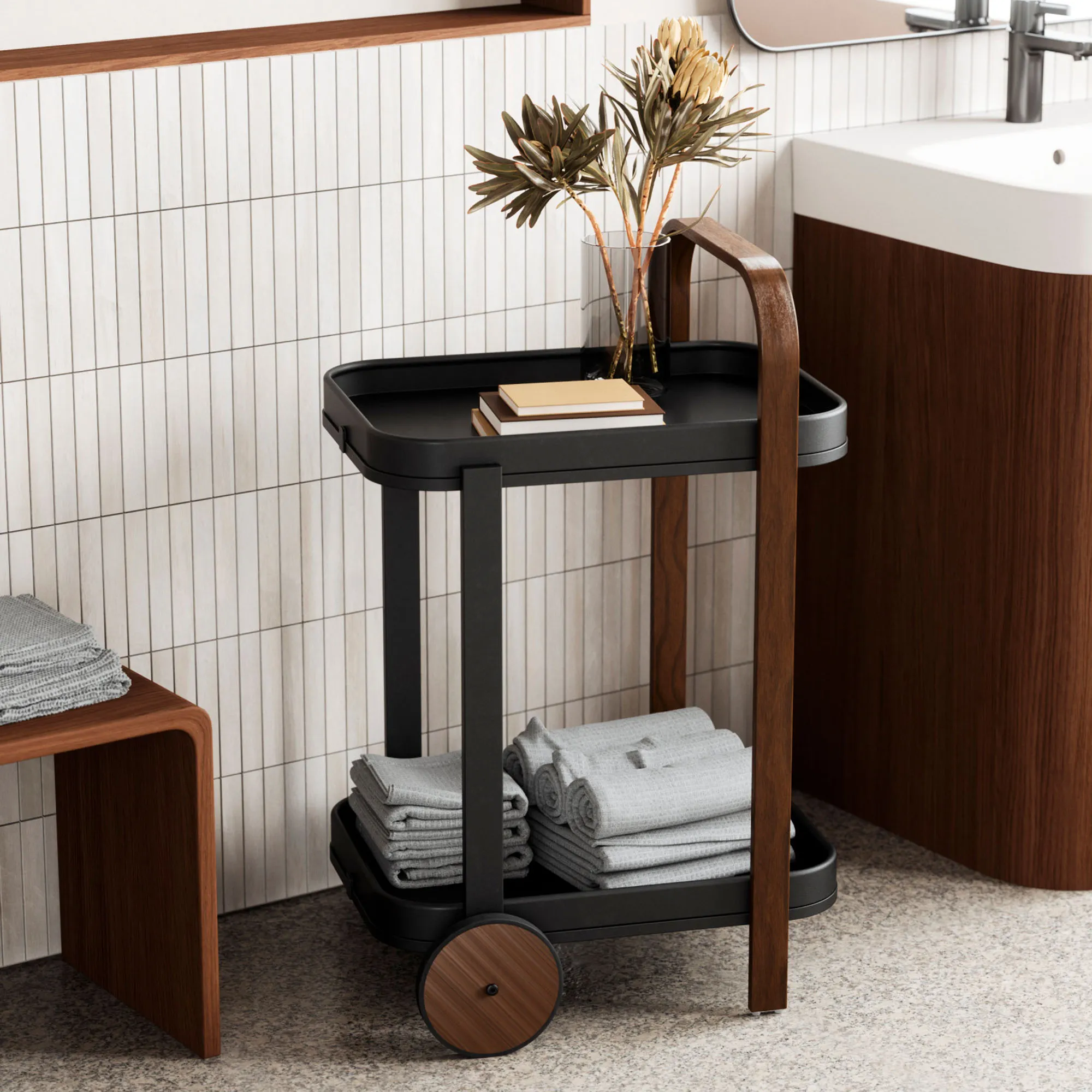 Upgrade your space with the charm and versatility of the Bellamy Black Serving Cart with Tray. With a tiered design, the black metal cart features two rimmed trays; a curved, dark brown wood handle; and two rubber-rimmed wheels. The top tray is removable for easy serving. Weight capacity is 30 lbs. Perfect for serving guests, displaying plants, or organizing a variety of items, the cart measures 17.5"Wx20"Dx31"H overall and weighs approx. 15 lbs.