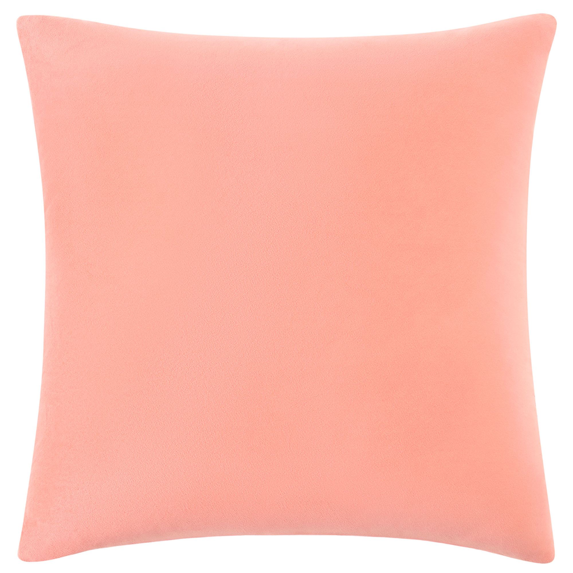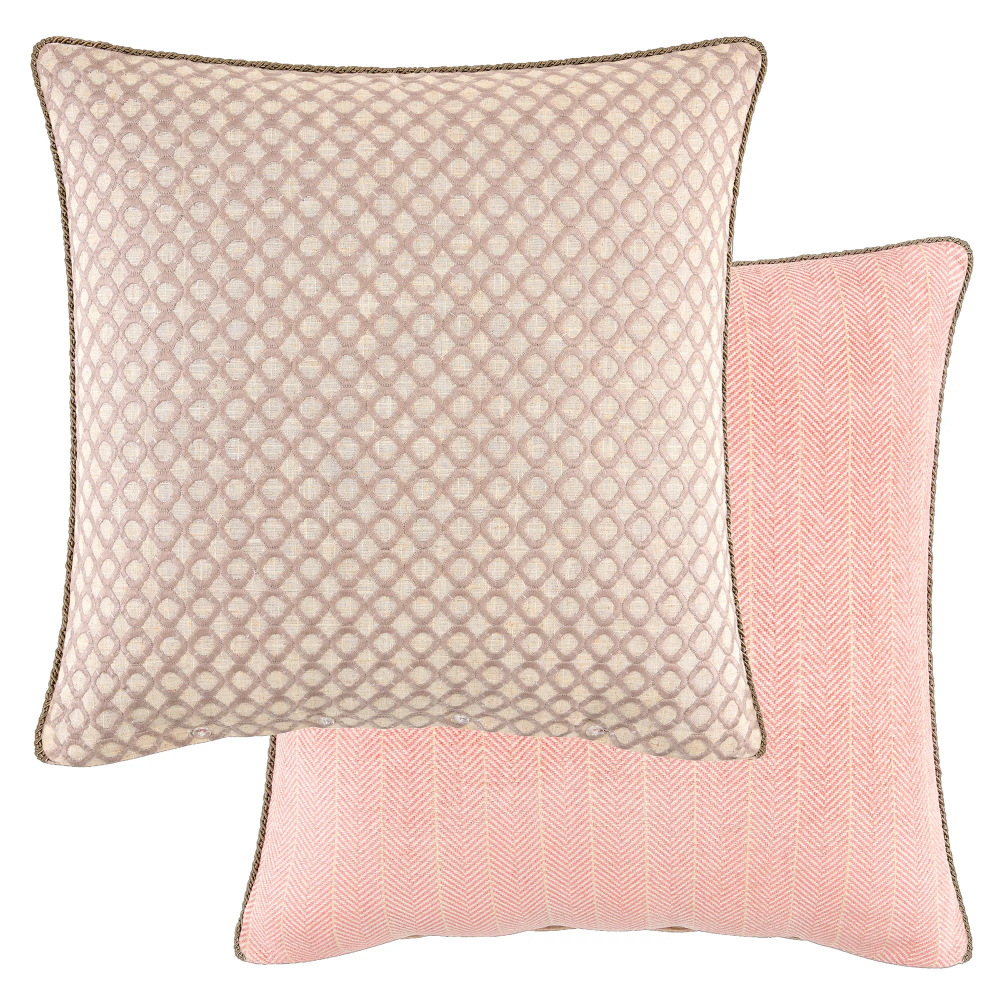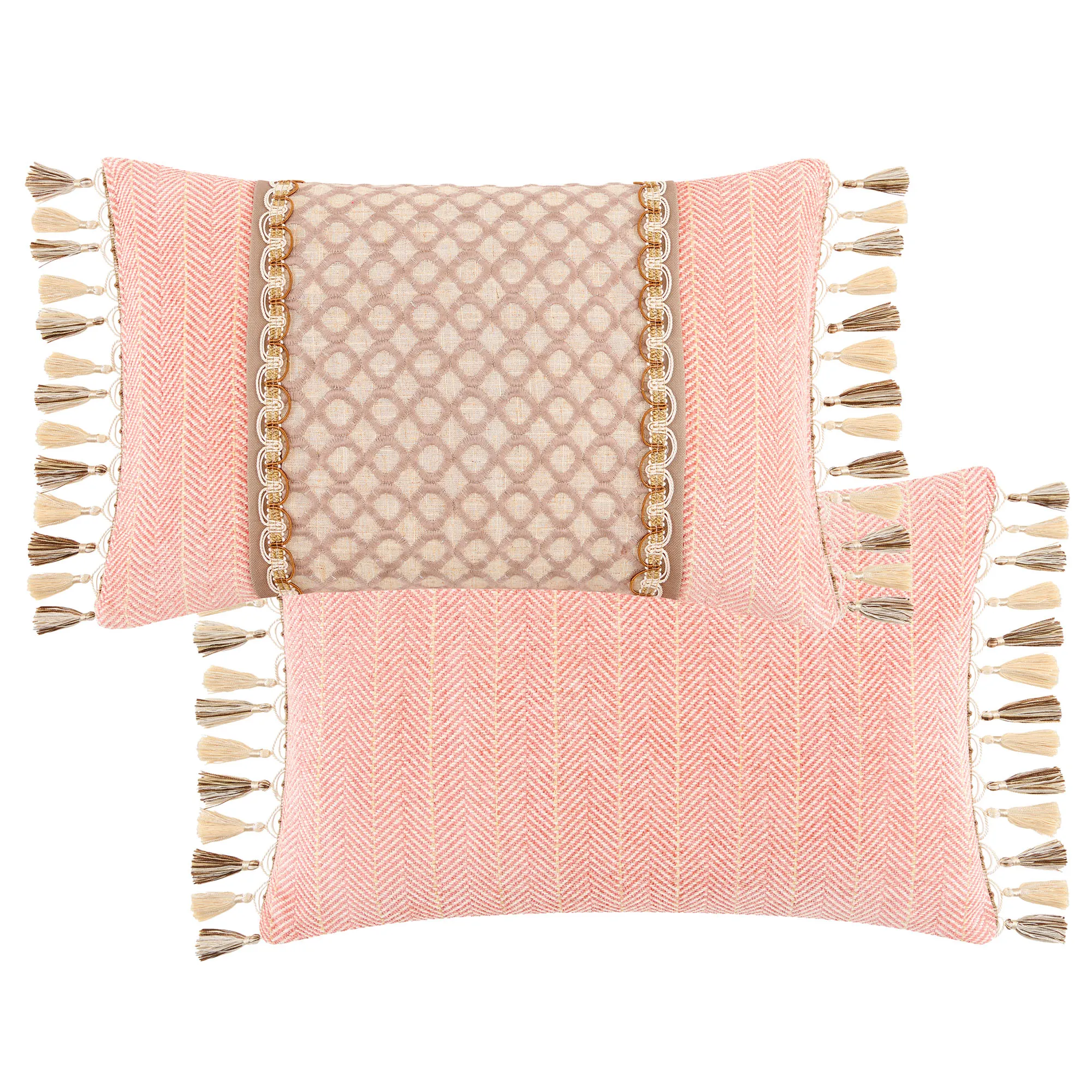 Pillows: Spot clean. The pieced, polyester/linen Rectangle has an embroidered pattern in the center, woven polyester chenille herringbone designs on the sides, and tassel trim on the length ends; reverses to woven polyester chenille herringbone designs. The tailored Square is coral polyester velvet, has a zipper closure, and is reversible.
