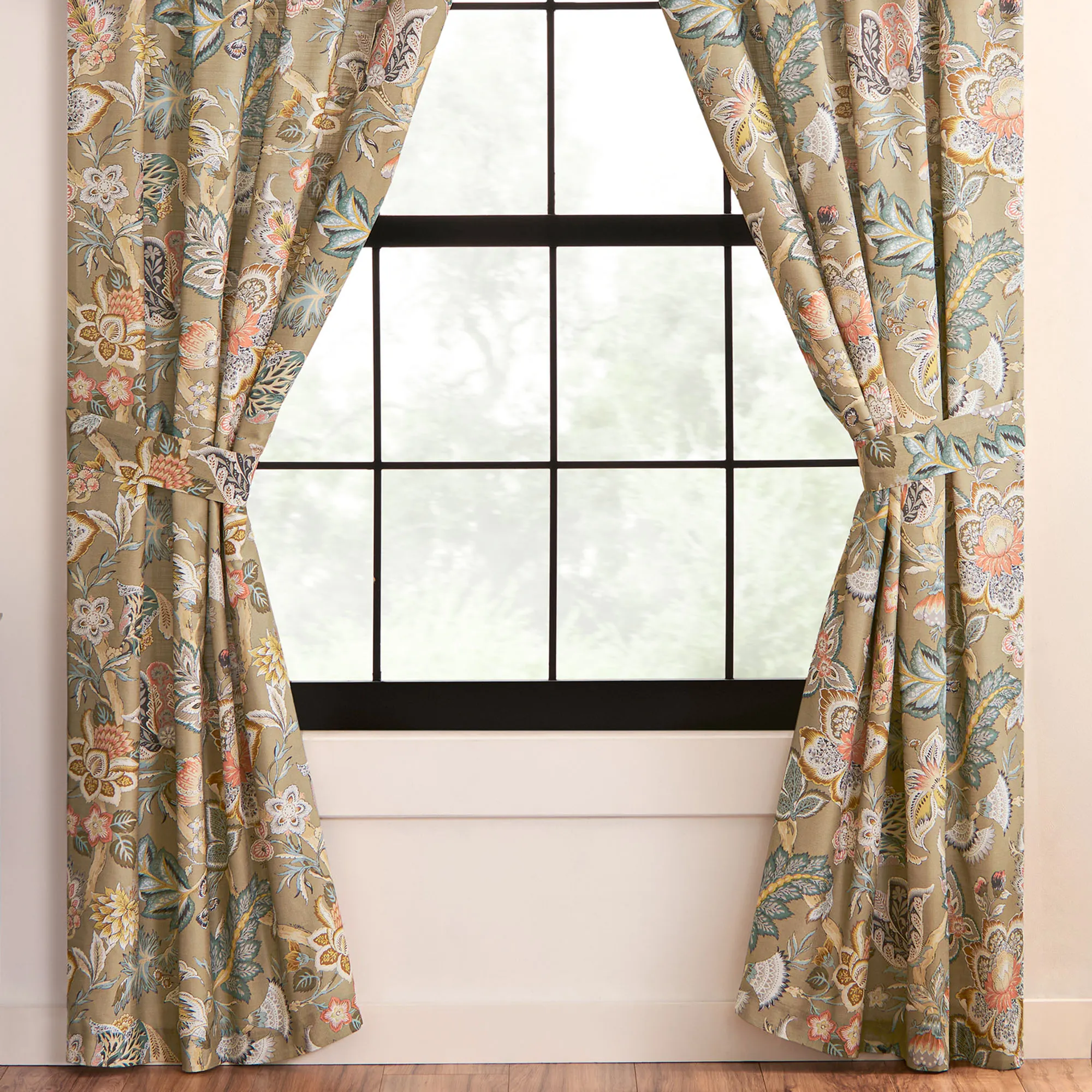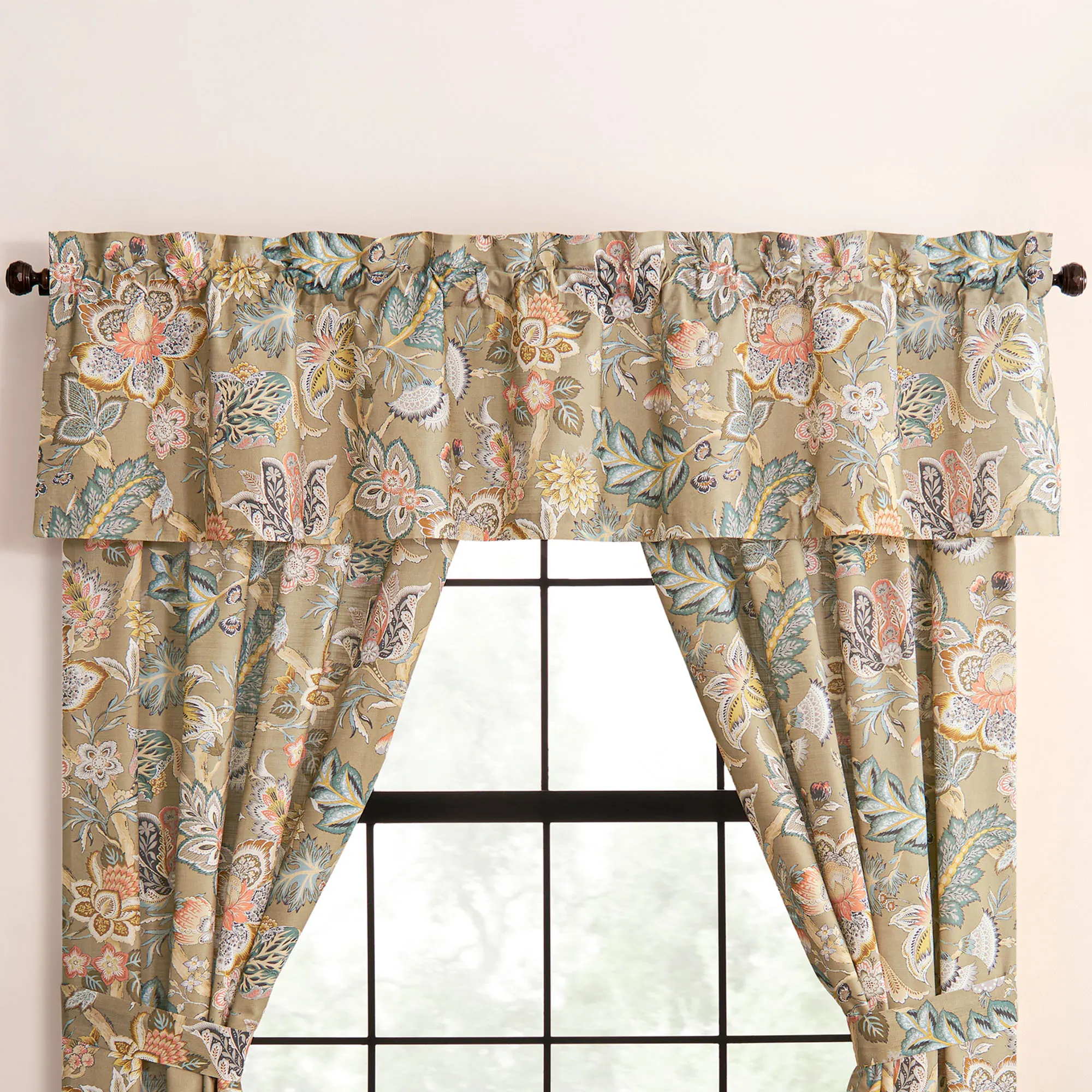 The tailored, lined Window Treatments have printed Jacobean designs and 3" rod pockets. Wide Curtain Pair includes tiebacks. Valance is also available.