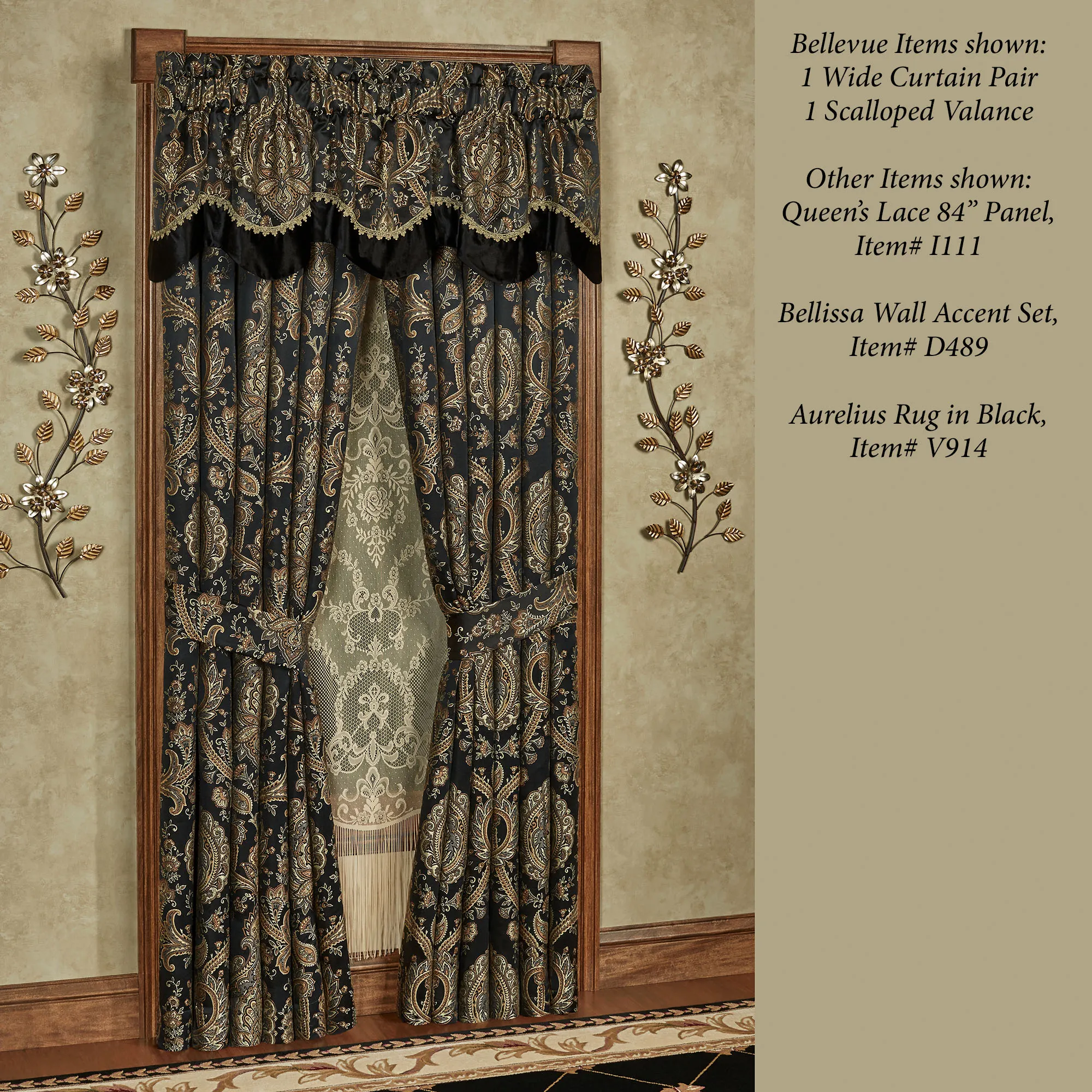 Window Treatments have woven jacquard medallions and 3" rod pockets. The tailored, lined Wide Curtains include tiebacks. Available in two lengths. The lined Scalloped Valance has a black velveteen bottom layer. Tuck Valance has woven stripes on the bottom edge.