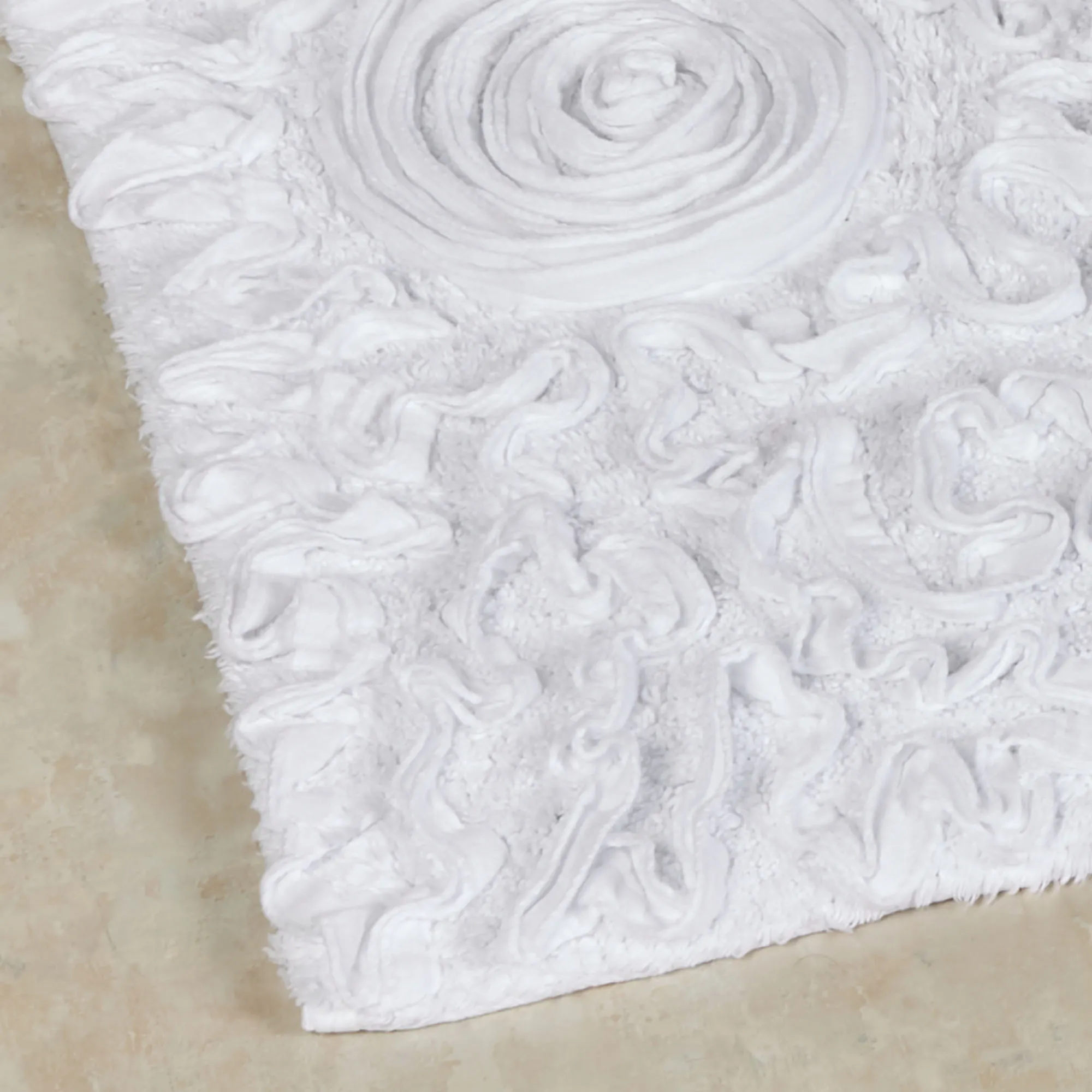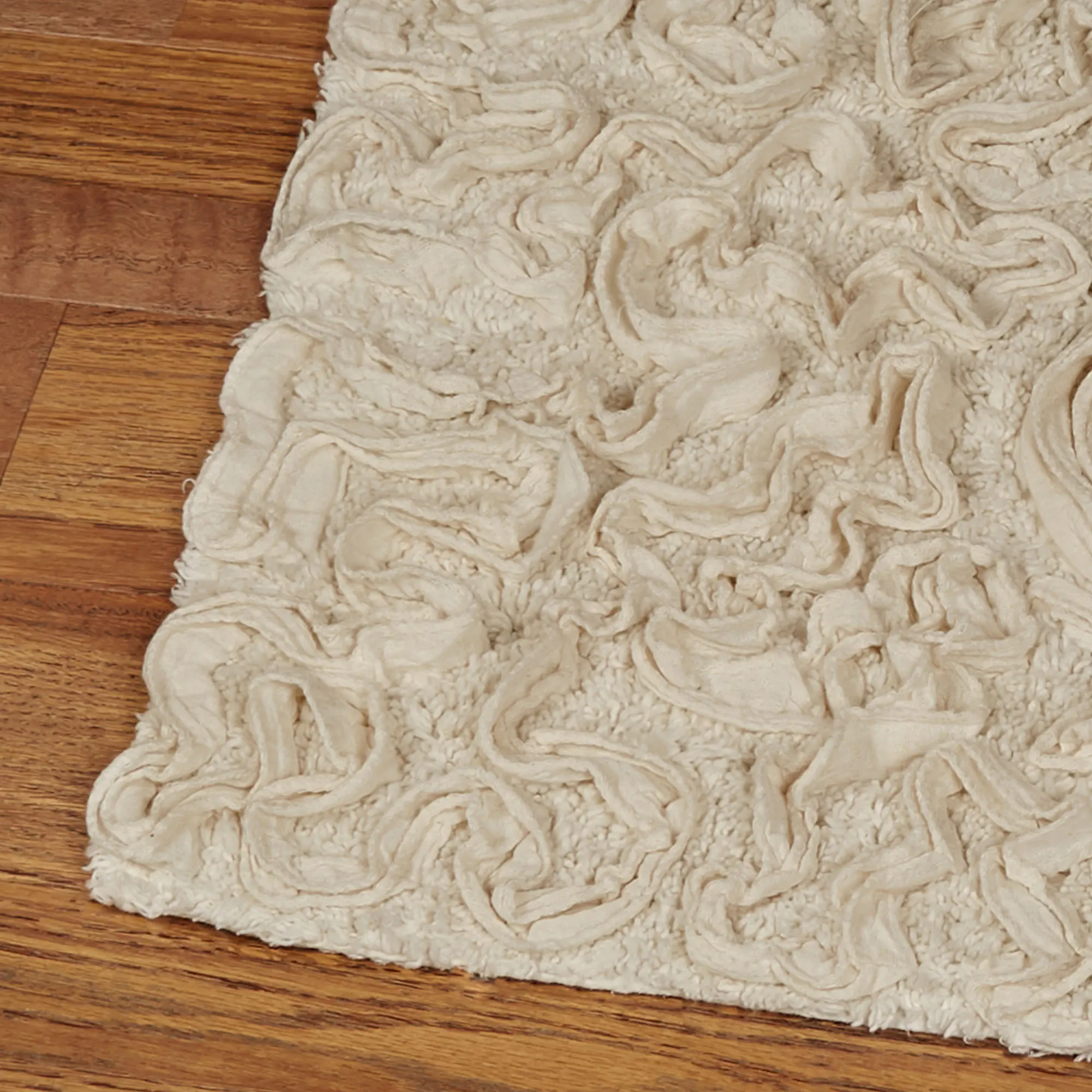 The Bellflower Contour Mat or Bath Rug will blossom with elegance in your bathroom. This handmade rug, .5" thick, has dimensionally shaped rosettes on a tufted cotton canvas and a nonskid latex backing. Toilet Contour Mat is 20"x20". Rectangle Bath Rug is available in three sizes. Bath Runner is 54"x21". Round Bath Rug is 30". Specify Pink, Aqua Haze, Charcoal, Ecru, Golden Yellow, Light Brown, Pear, or White. Machine wash gentle; please see the Details tab for full care instructions. Imported.