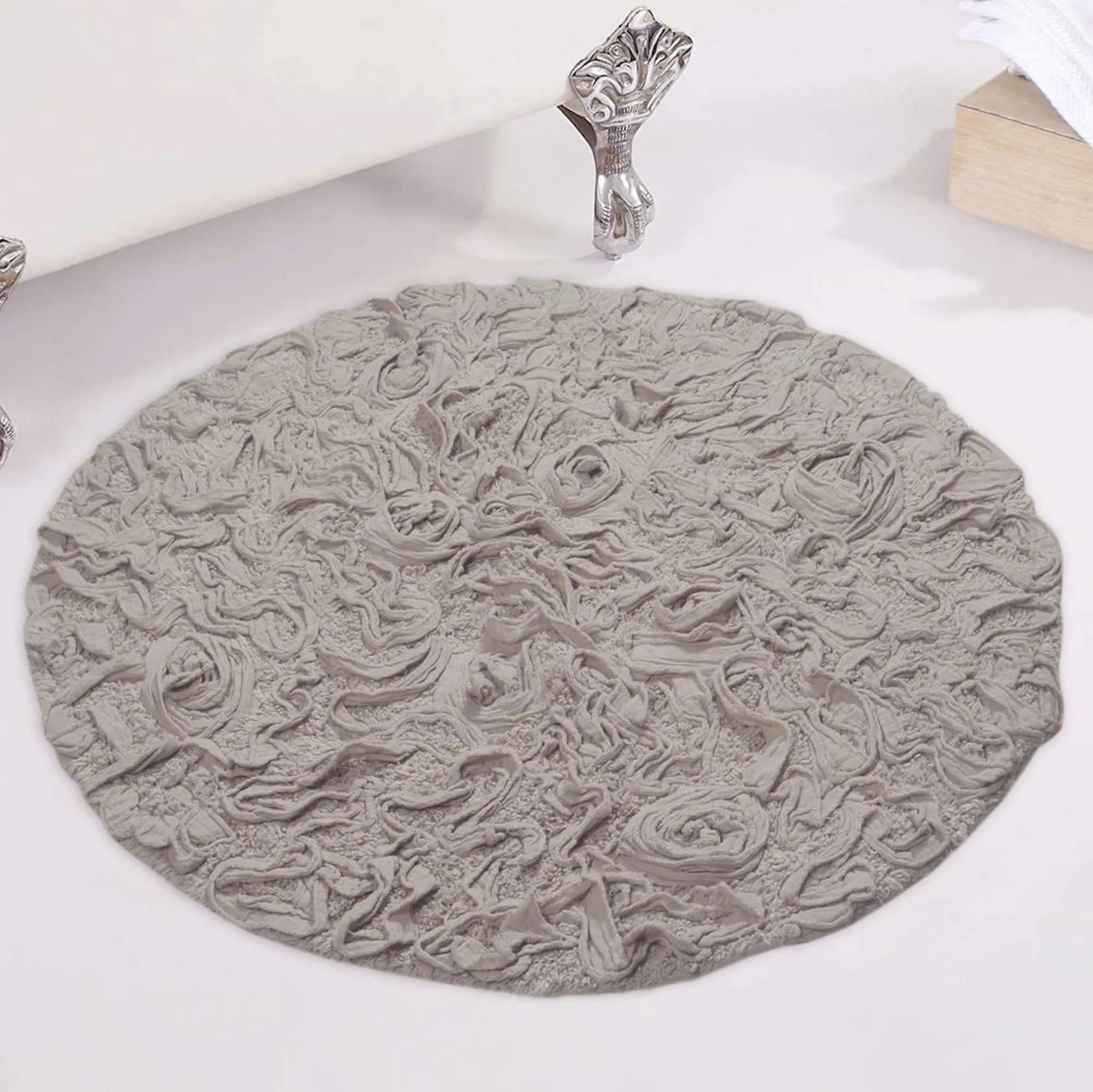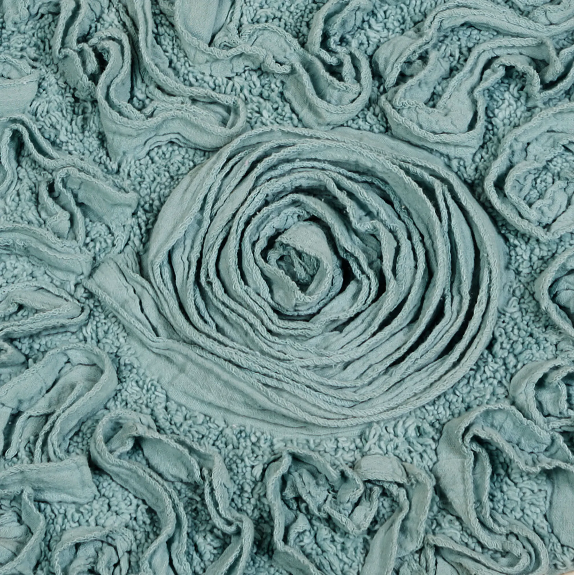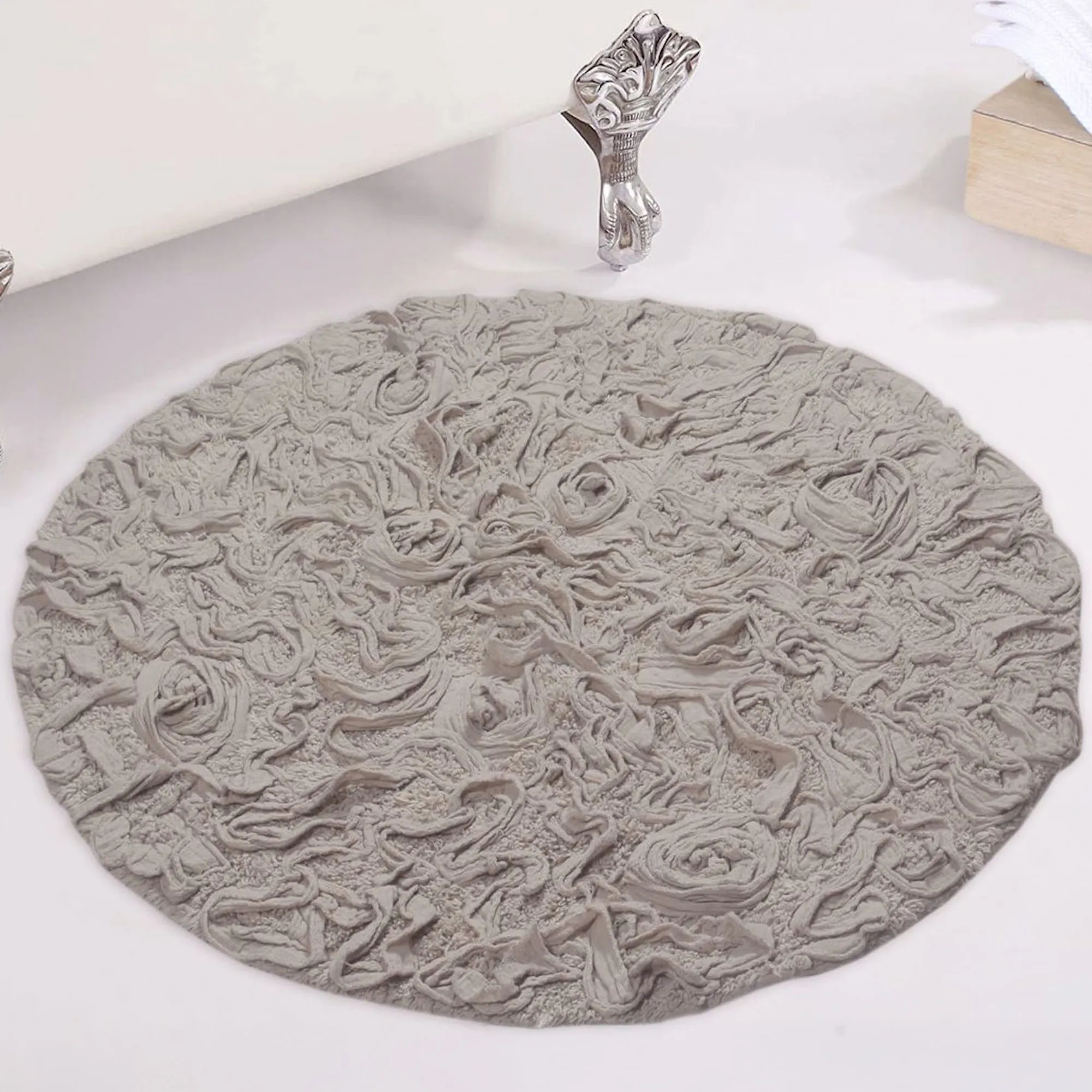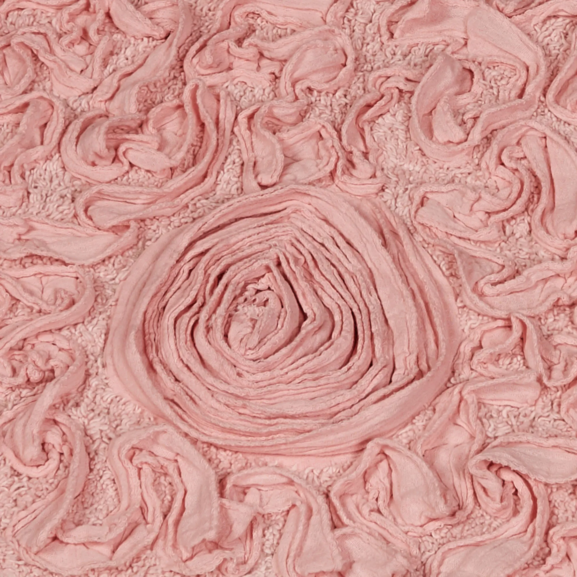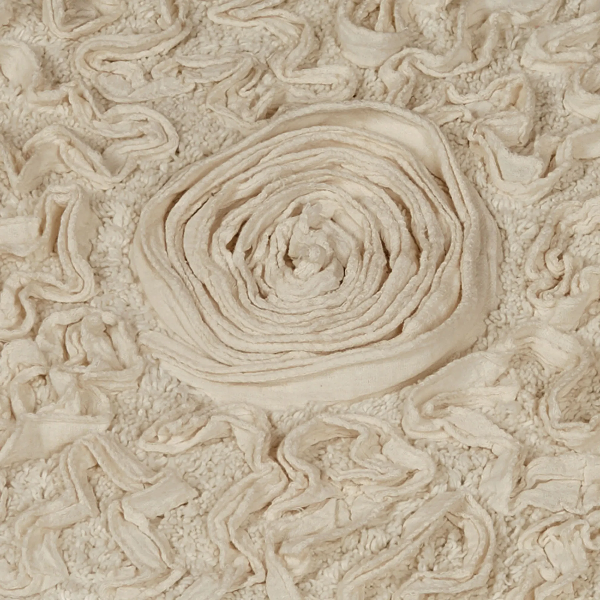 The Bellflower Bath Rug blossoms with elegance. This handmade rug, .5" thick, has dimensionally shaped rosettes on a tufted cotton canvas and a nonskid latex backing. Round Bath Rug is 30". Rectangle Bath Rug is available in three sizes. Bath Runner is 54"x21". Contour Mat is 20"x20". Specify Light Brown, Aqua Haze, Ecru, Golden Yellow, Pear, Pink, or White; limited quantities are available in Charcoal. Machine wash gentle; please see the Details tab for full care instructions. Imported.