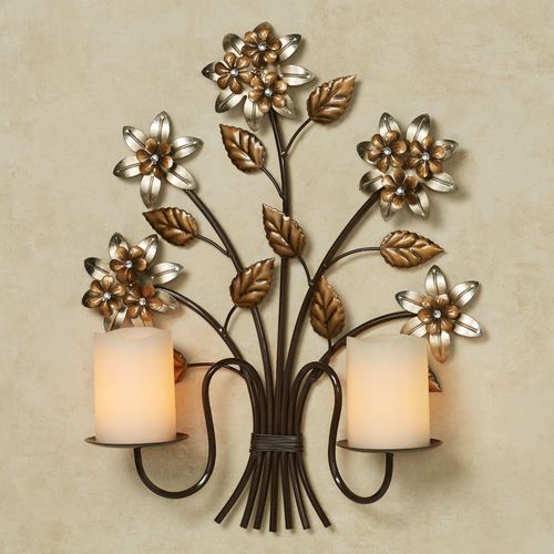 Metallic finishes sparkle with elegance on the Bellissa Wall Sconce. The dark brown metal branches have champagne bronze leaves and flowers, champagne bronze petals with silver leaf detailing, and clear acrylic gem accents. Two candlecups hold your 3" dia. pillar candles. Overall, the wall sconce measures 16"Wx5"Dx19"H.