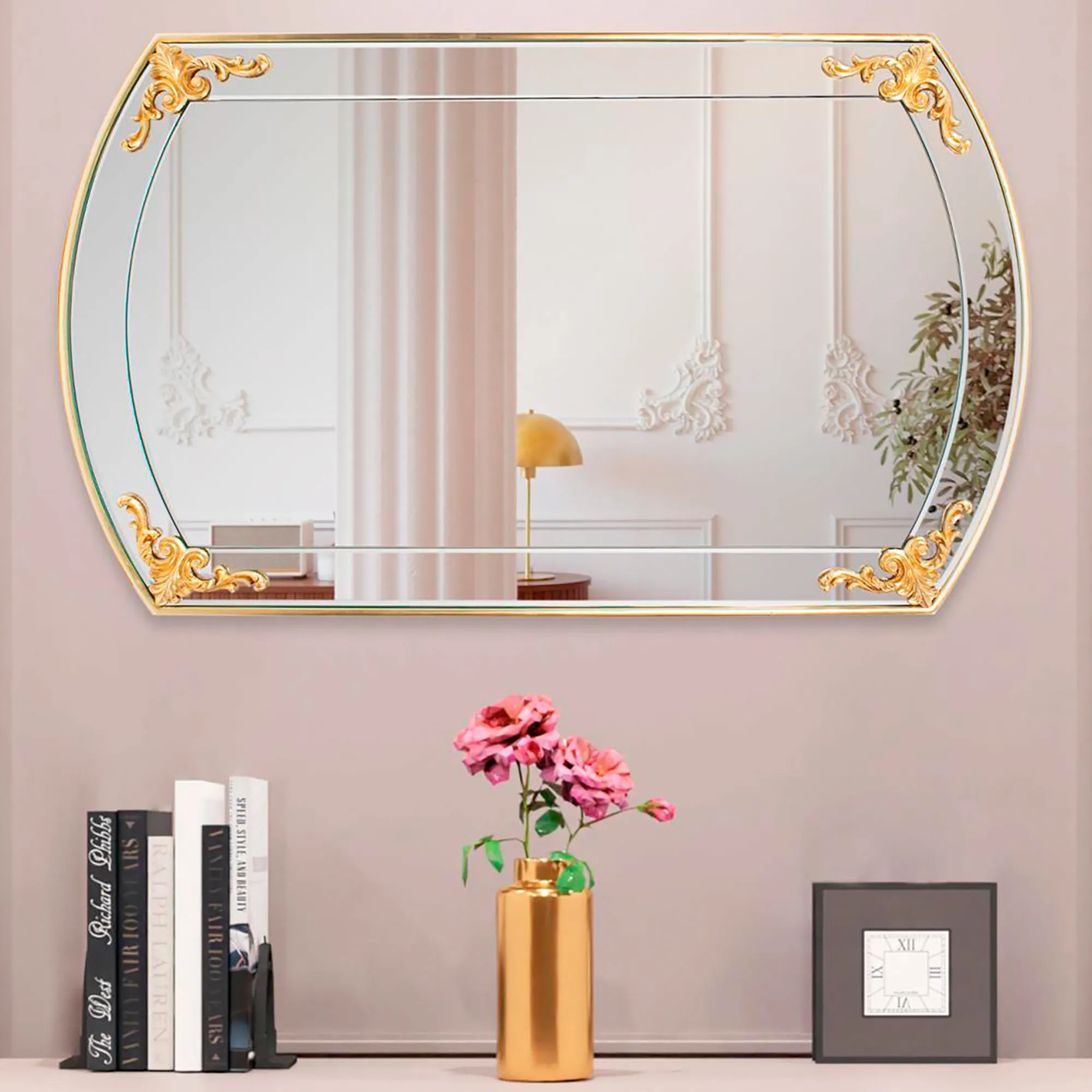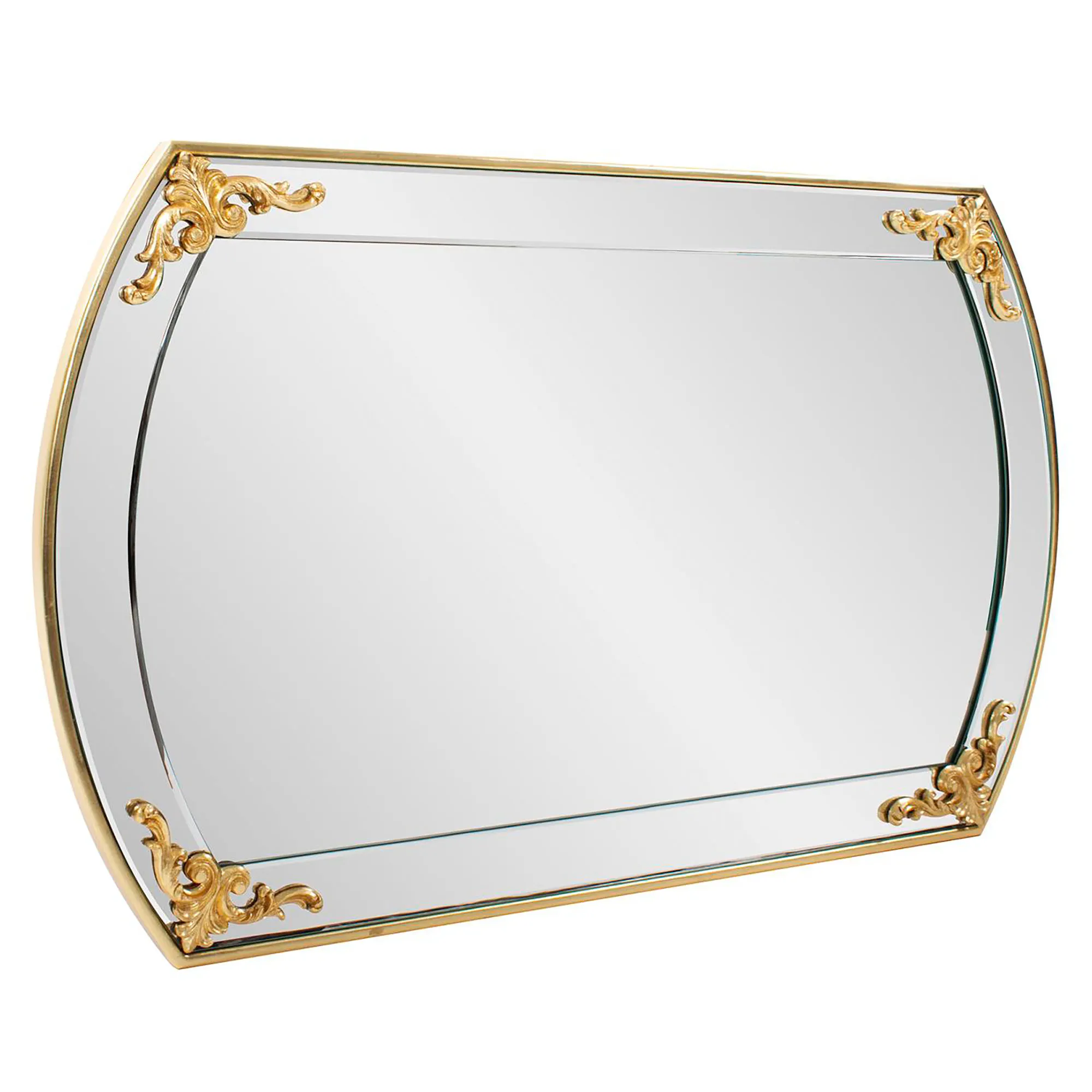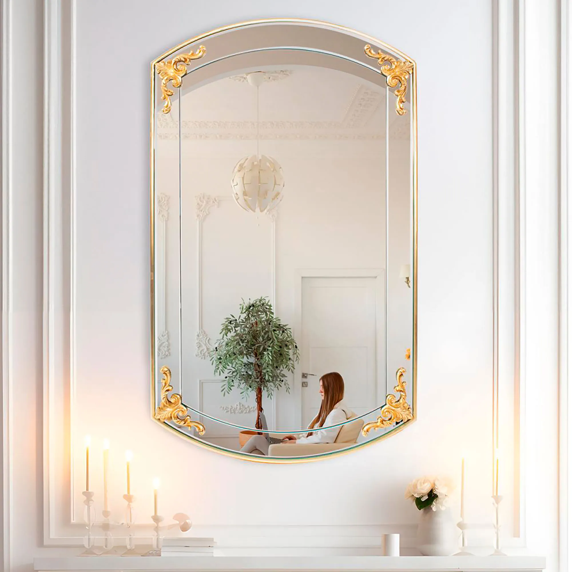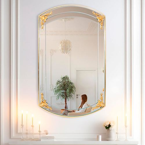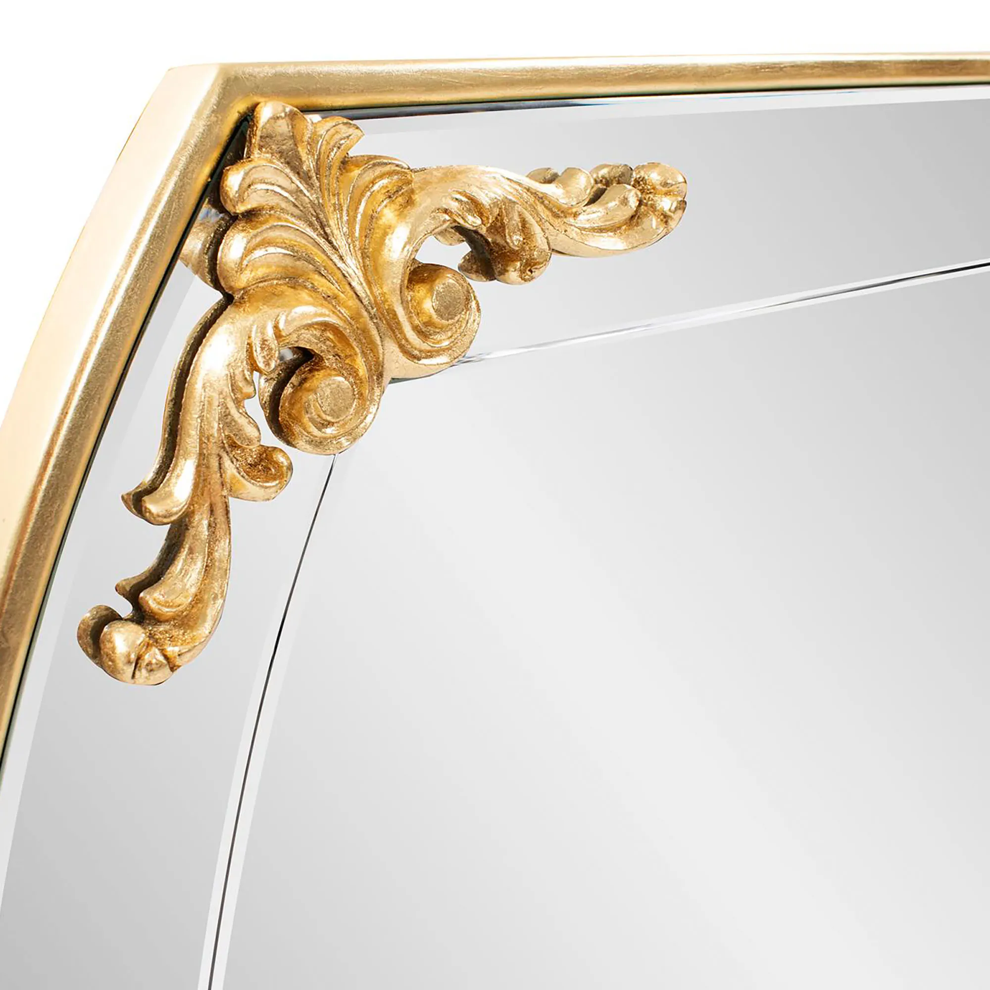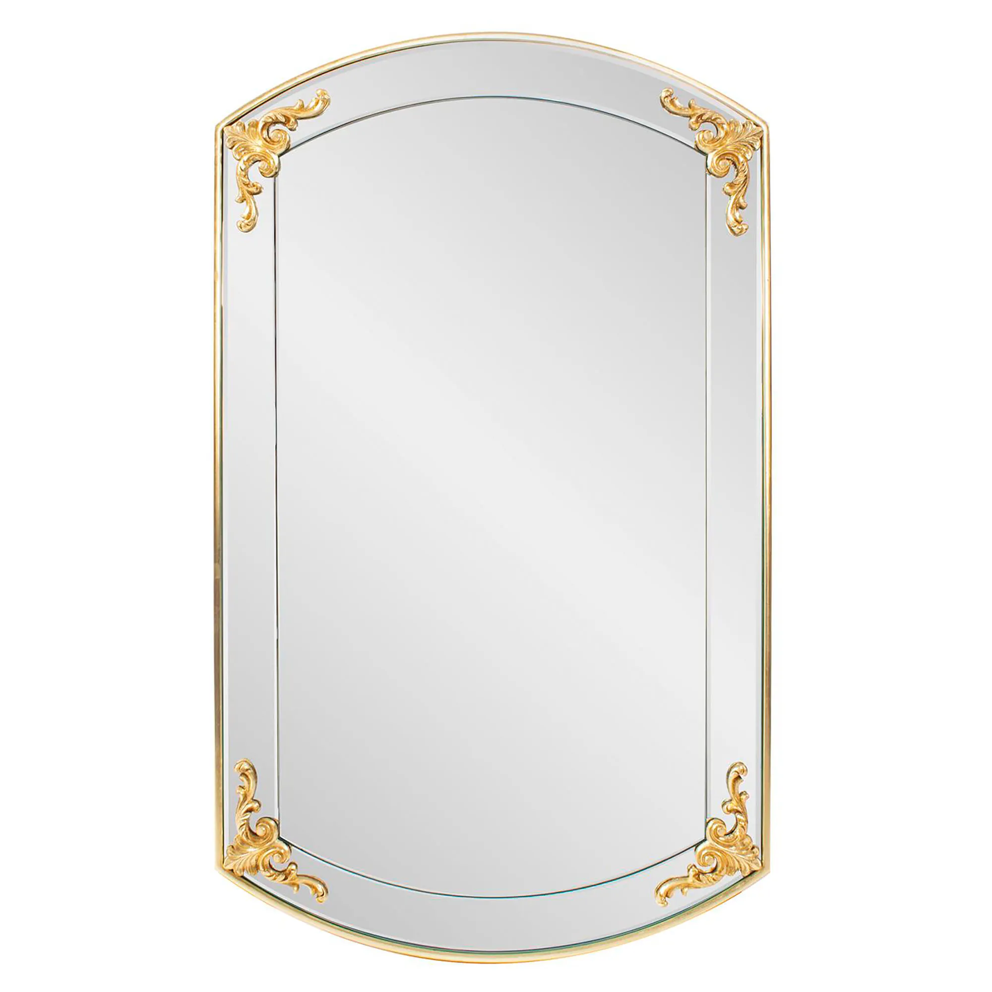 Hang the classy and elegant Bellona Wall Mirror on any wall for a sophisticated display. The stunning glass mirror has a polyurethane frame and features beveled cutting around the edges, a rounded top and bottom, soft corners, and resin gold leaf scroll accents. May be hung vertically or horizontally. Measures 23"Wx1"Dx39"H; weighs approx. 27 lbs.