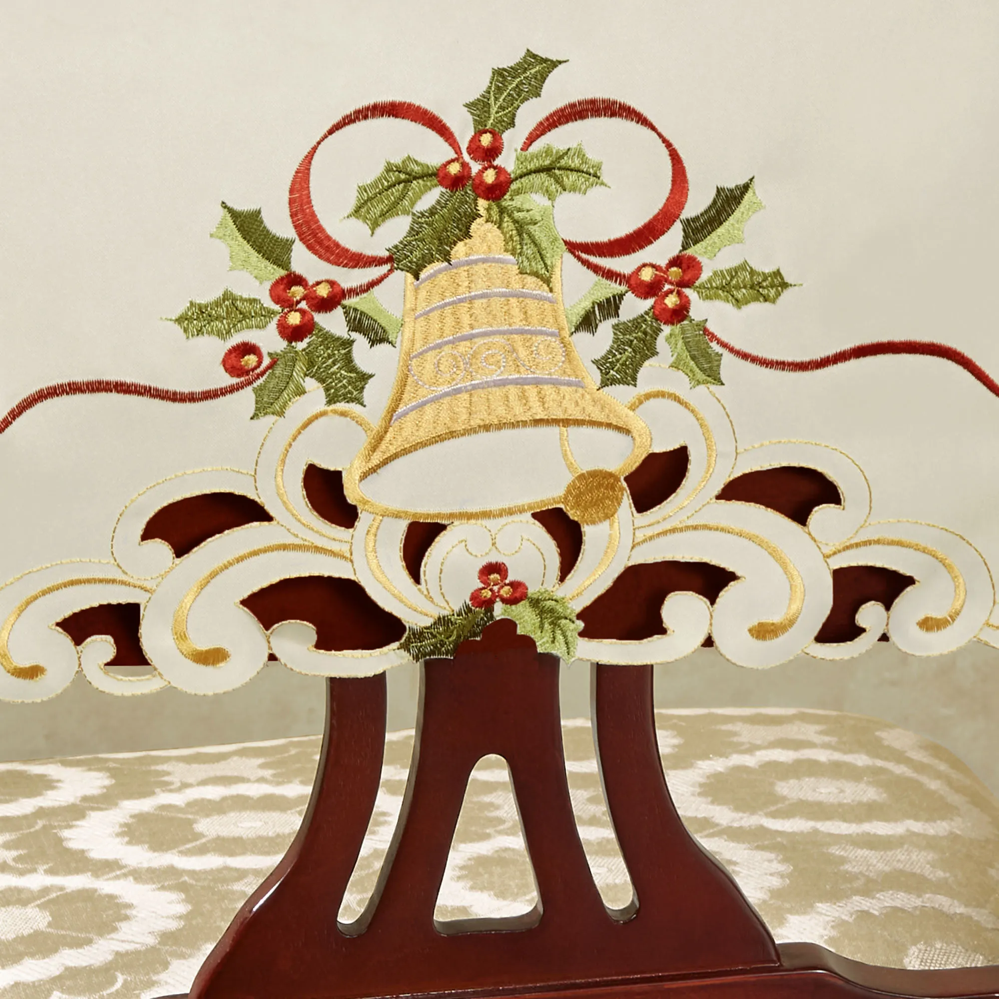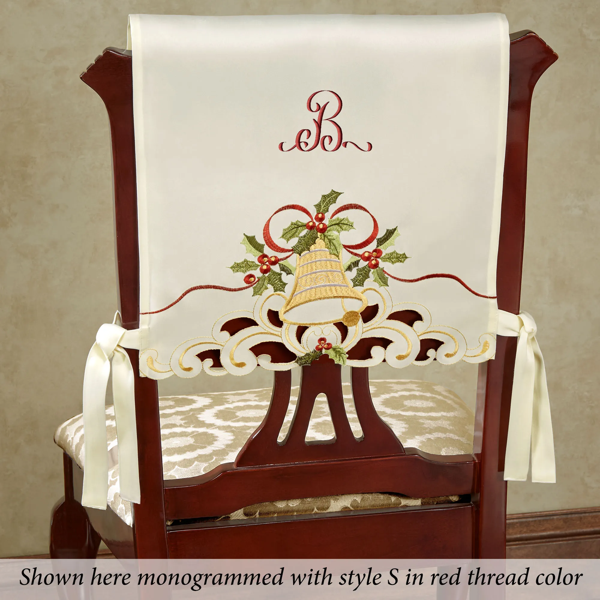 Bells Are Ringing to herald the holiday season! Let them jingle in your home with this festive chair cover set. Detailed with beautiful contour-cut edges, each ivory polyester faux silk design features an embroidered gold holiday bell, green holly, red berries, golden filigree, and draped ribbon motifs. With ties to create a bow, each cover is 16"x16" when styled on a chair. Machine washable. Imported. Chair cover set may be personalized with a name or initial(s) for an additional $14 ($7 per cover); specify up to 11 letters for each cover. You may personalize each cover differently. Click on the burgundy "i" icon below the item name for more information.