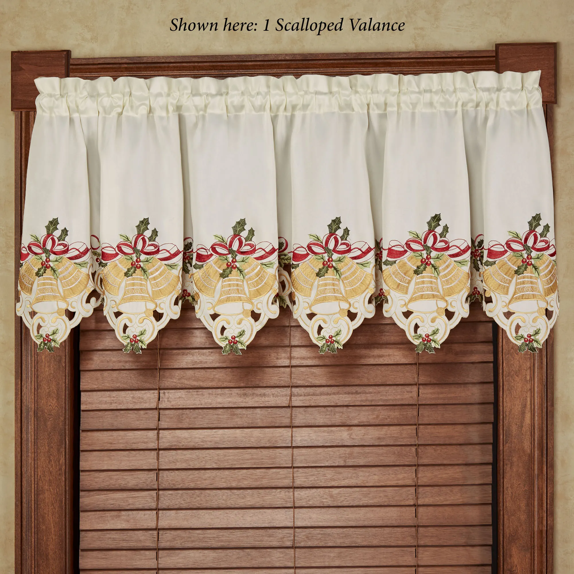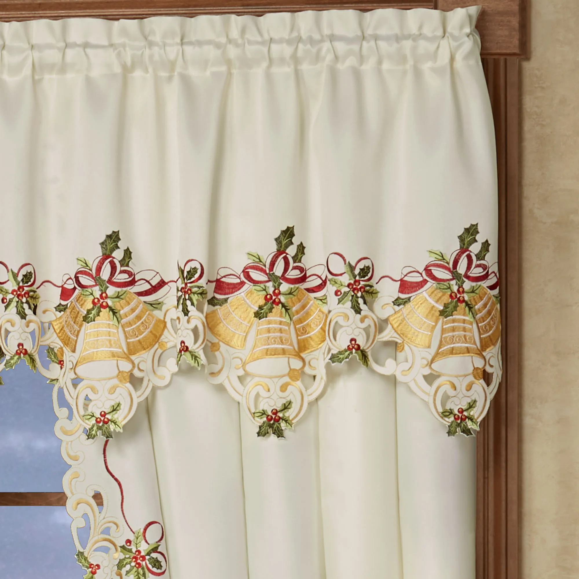 Bells Are Ringing to herald the holiday season! Let them jingle in your home with this festive window treatment. Detailed with beautiful contour-cut bottom edges, each ivory polyester faux silk design features embroidered gold holiday bells, green holly, red berries, golden filigree, and draped ribbon motifs. Specify Scalloped Valance, 72"Wx22"L; or Curtain Pair, 84"W. Scalloped Valance can also be used as a mantel scarf. Curtains also have contour-cut inside edges and tiebacks. Rod pockets are 1.75". Machine washable. Imported. The curtain pair width is the total width of two panels together.