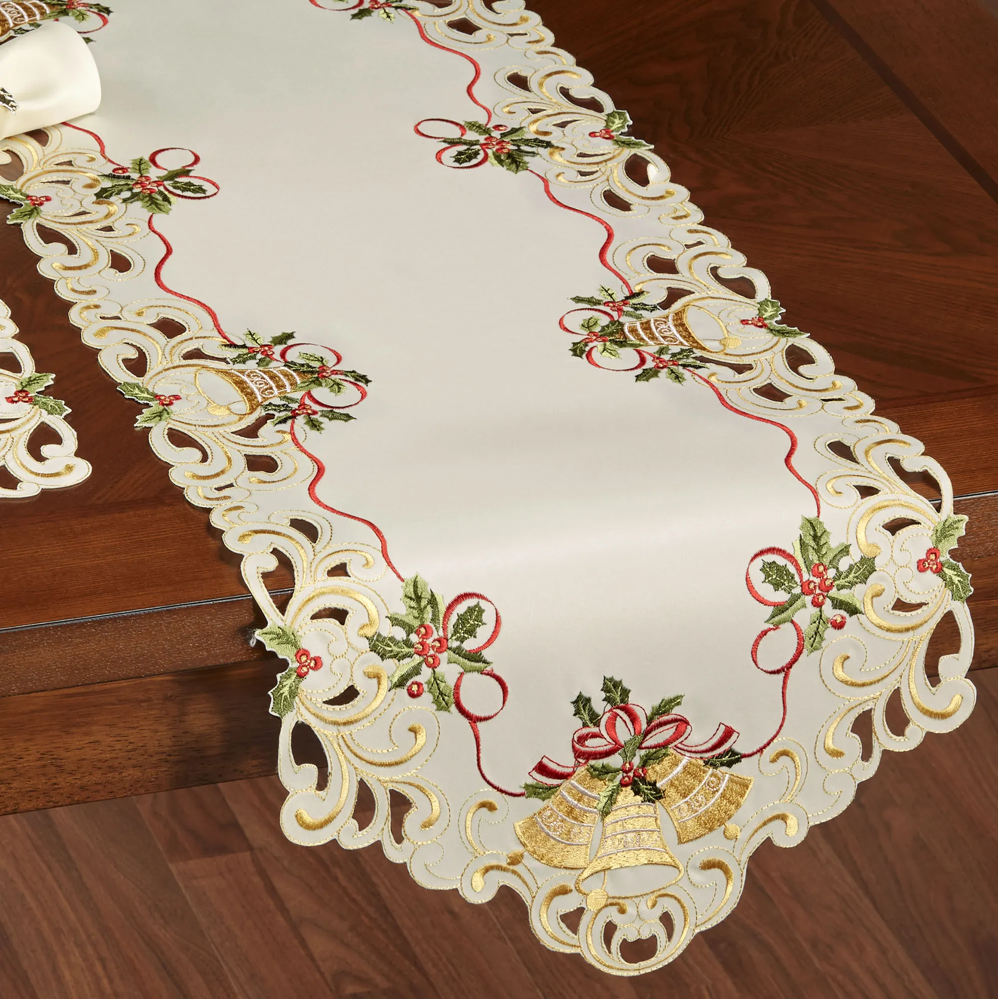 Bells Are Ringing Embroidered Holiday Table Runner and Table Linens