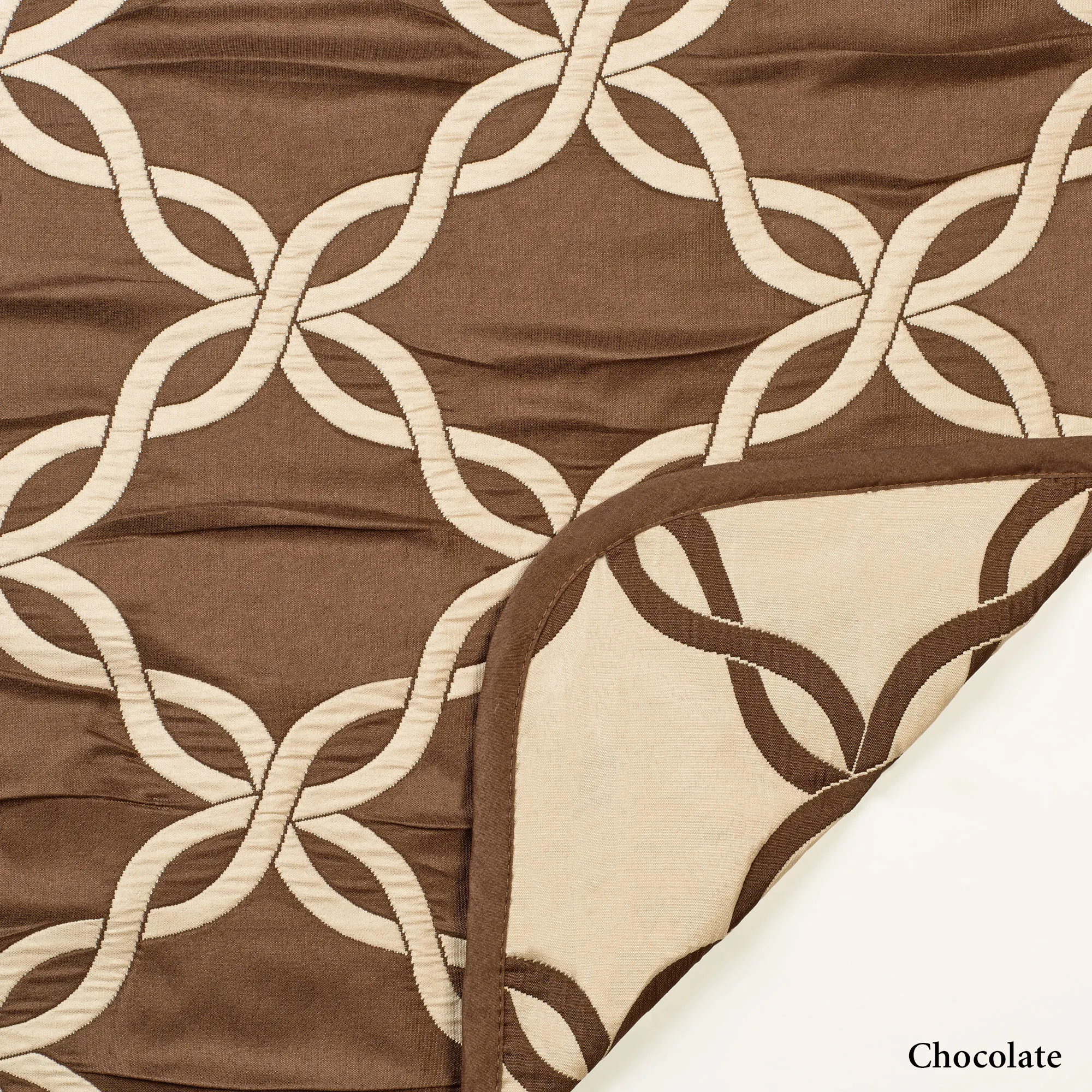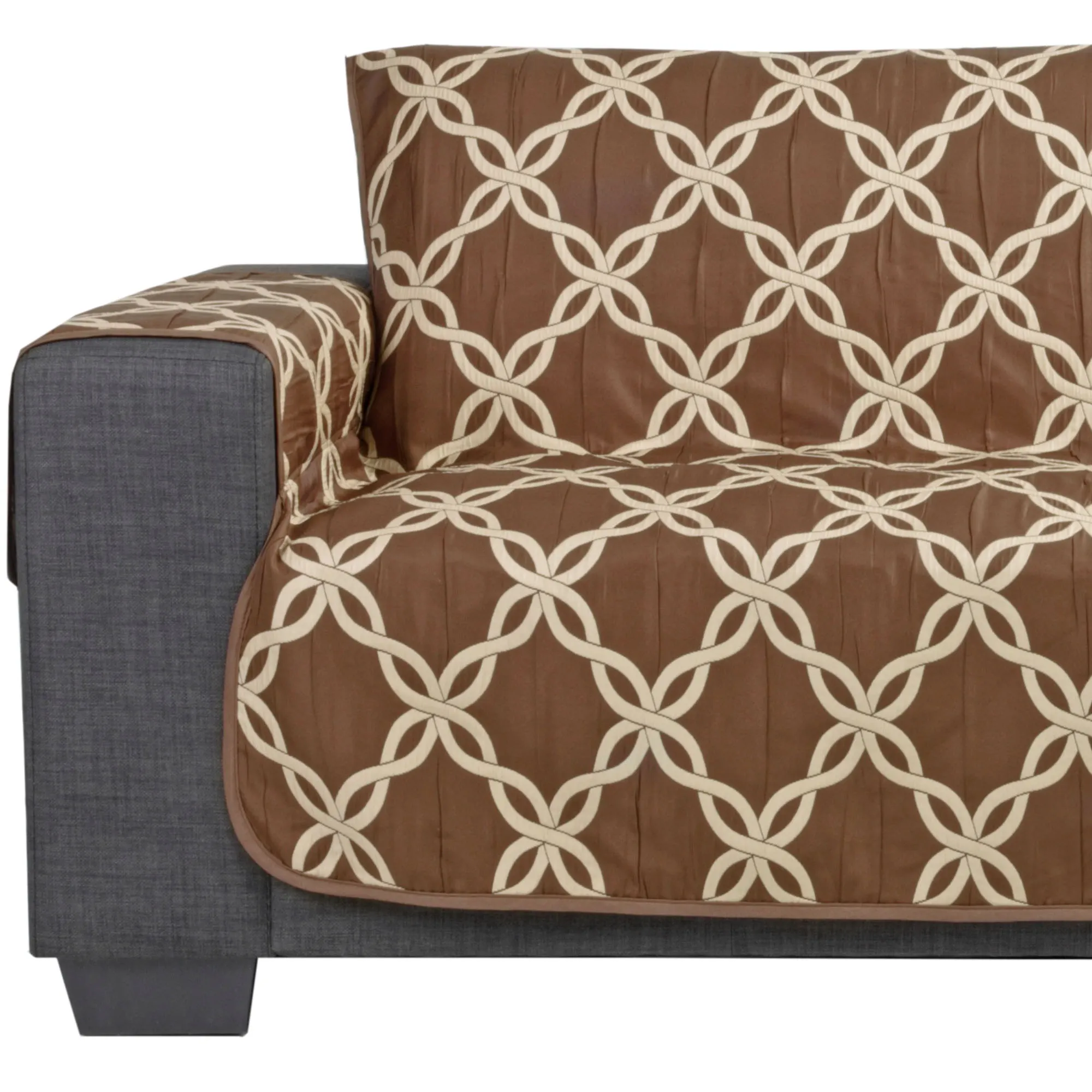 Not only does the Belmont Reversible Loveseat Cover protect your furniture from spills or pet hair, but it also offers two styles for design versatility. This one-piece polyester furniture protector features an interwoven diamond trellis design and has fabric bound edges. The chocolate coloration has a champagne trellis design that is reversible to champagne with a chocolate trellis design. Loveseat cover is 88"Wx70.5"D and fits seats up to 42"W. Arm flaps are 22"Wx22"D; seat-to-floor flap is 34"L; back flap is 36.5"L. Washable. Imported.