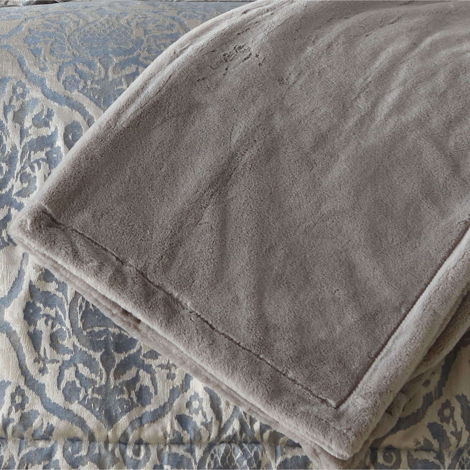 The Mini Comforter Set includes comforter and shams. Oversized comforter fits mattresses up to 15". The flanged comforter has medallion designs on silver and a solid silver cotton backing. The flanged shams mimic the comforter and have French back closures. For mini comforter set, choose Queen, King, or Cal King.