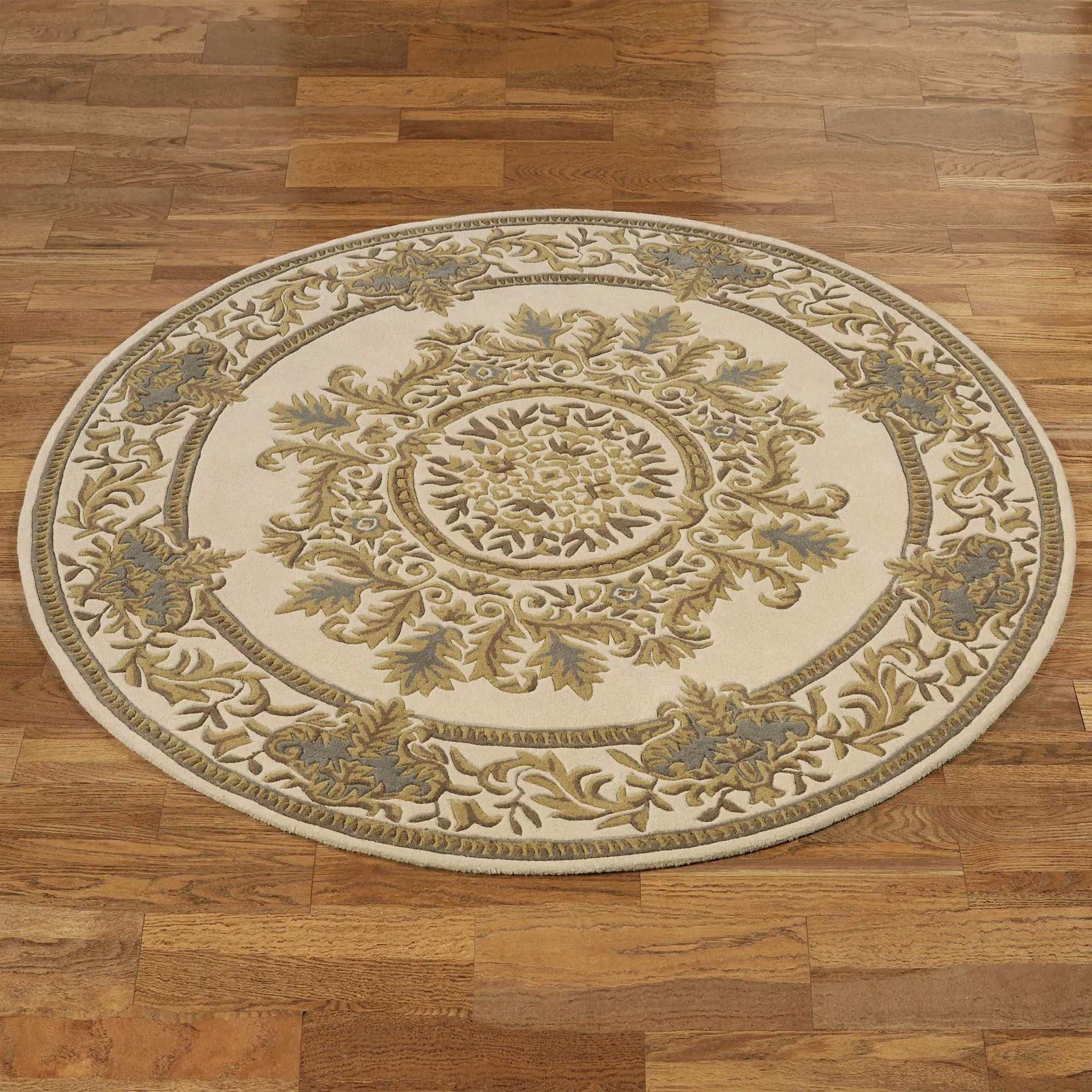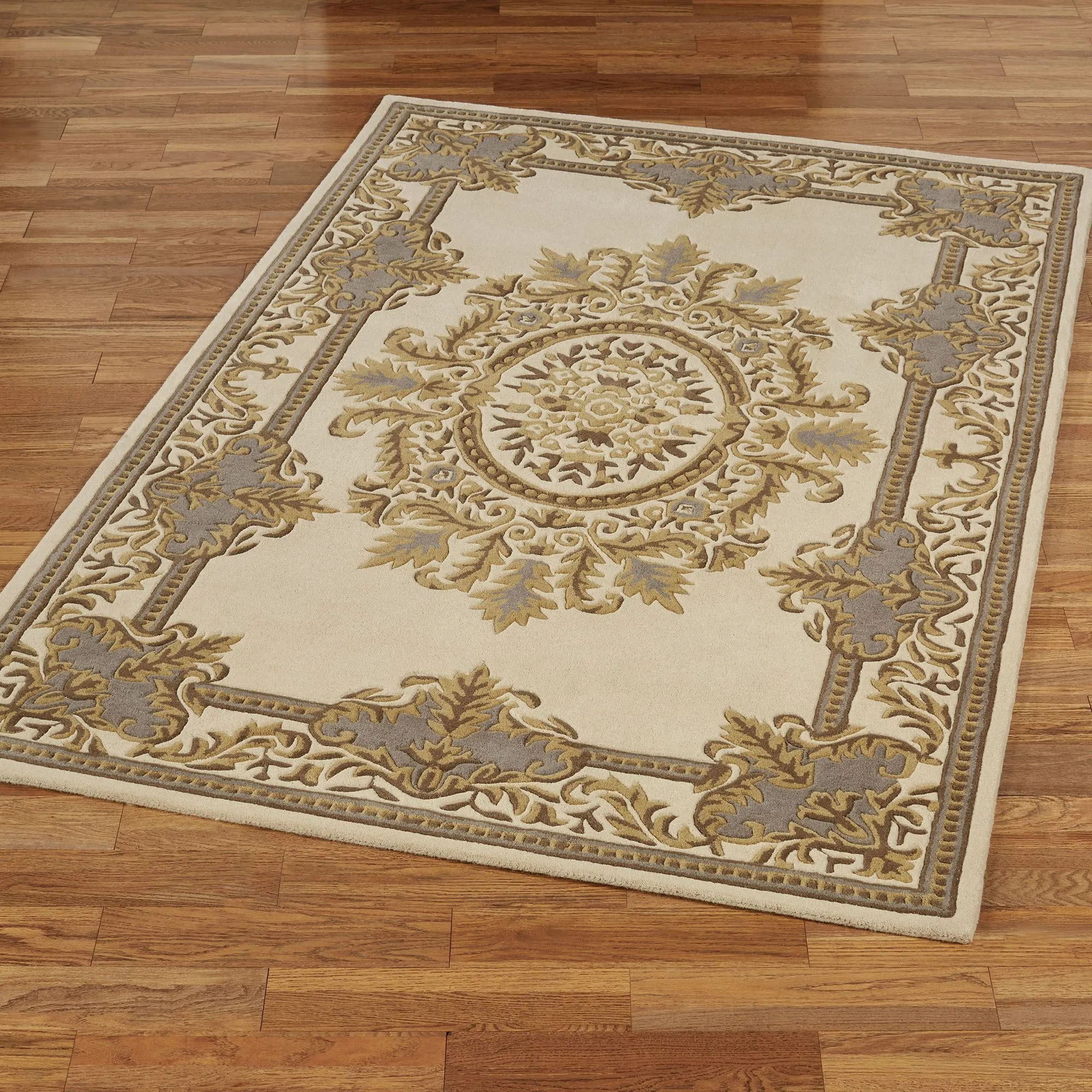 Elegantly enhanced with classic motifs, the Belmont Ivory Area Rug is richly decorated with opulence. This hand-tufted and handcarved wool rug, .5" thick, has exquisite floral medallions and scrolling acanthus leaves; some sizes also have bead designs. Colors include ivory, dark gold, gold, and heather gray. Back is cloth-covered latex. We recommend professional cleaning by a rug cleaner. Imported.