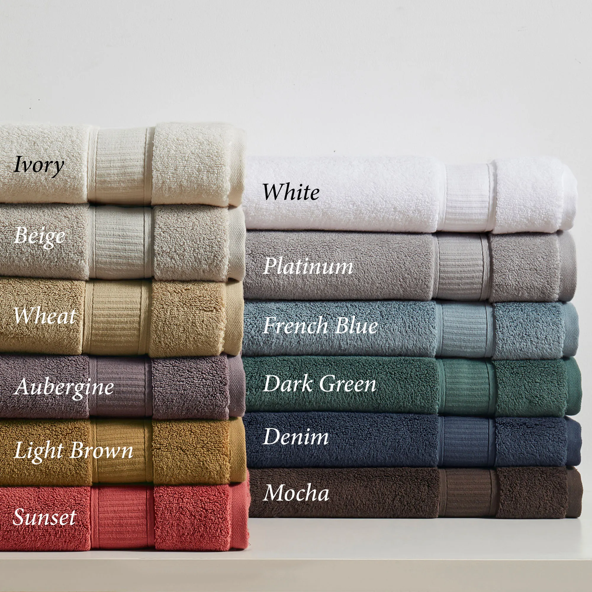 Enjoy the supreme softness and the luxurious feel of the Belmore Bath Towel Set. These exquisite, ultra-absorbent towels, from J. Queen New York, are made with premium, zero-twist cotton and have 600 GSM. Heavyweight towels are durable and have ribbed hem details that highlight the high pile. Towels get softer after each wash. The six-piece towel set includes two bath towels, 30"x56" each; two hand towels, 16"x28" each; and two washcloths, 13" sq. each. Specify Aubergine, Beige, Denim, Dark Green, French Blue, Ivory, Light Brown, Mocha, Platinum, Sunset, Wheat, or White. Machine washable. Handcrafted in Portugal.