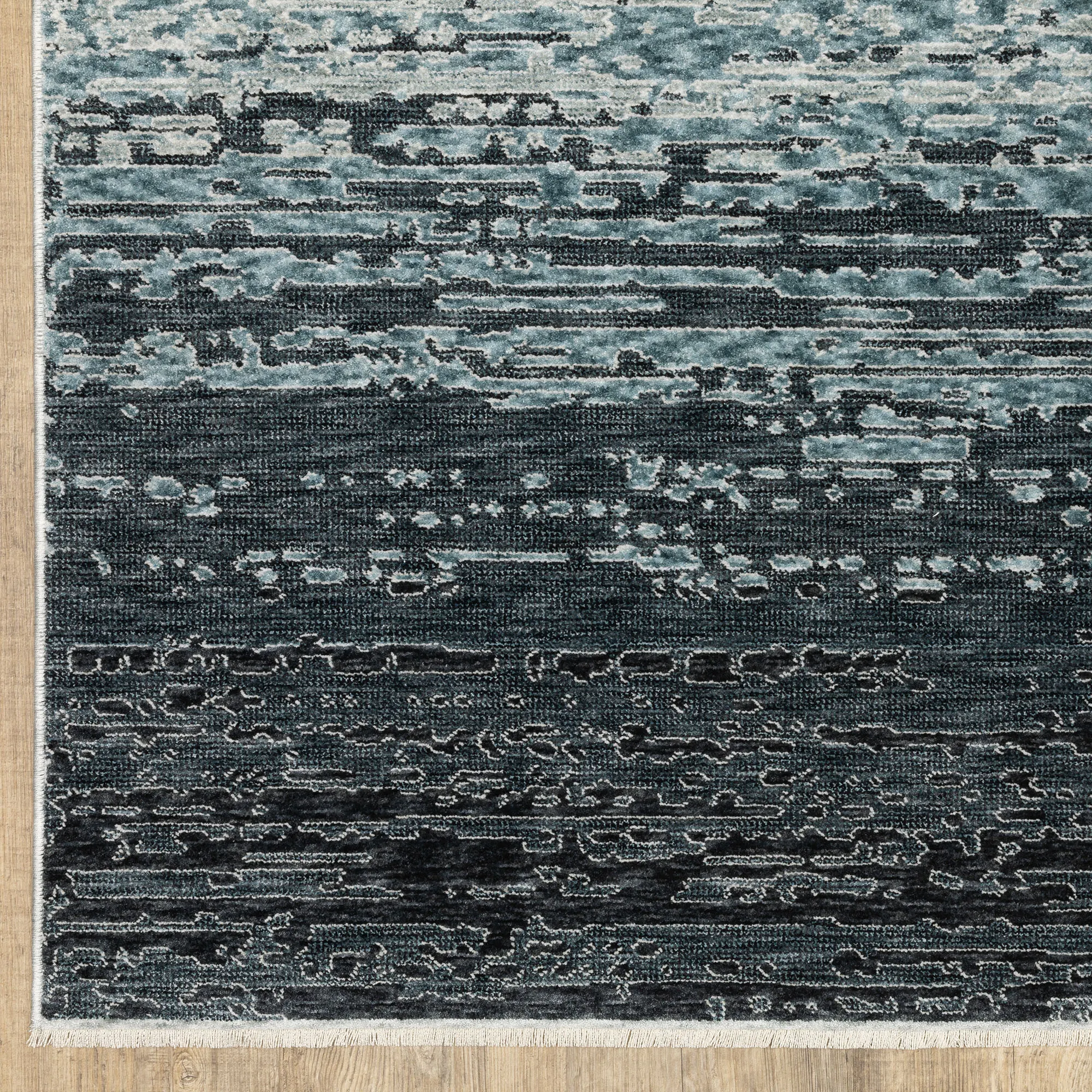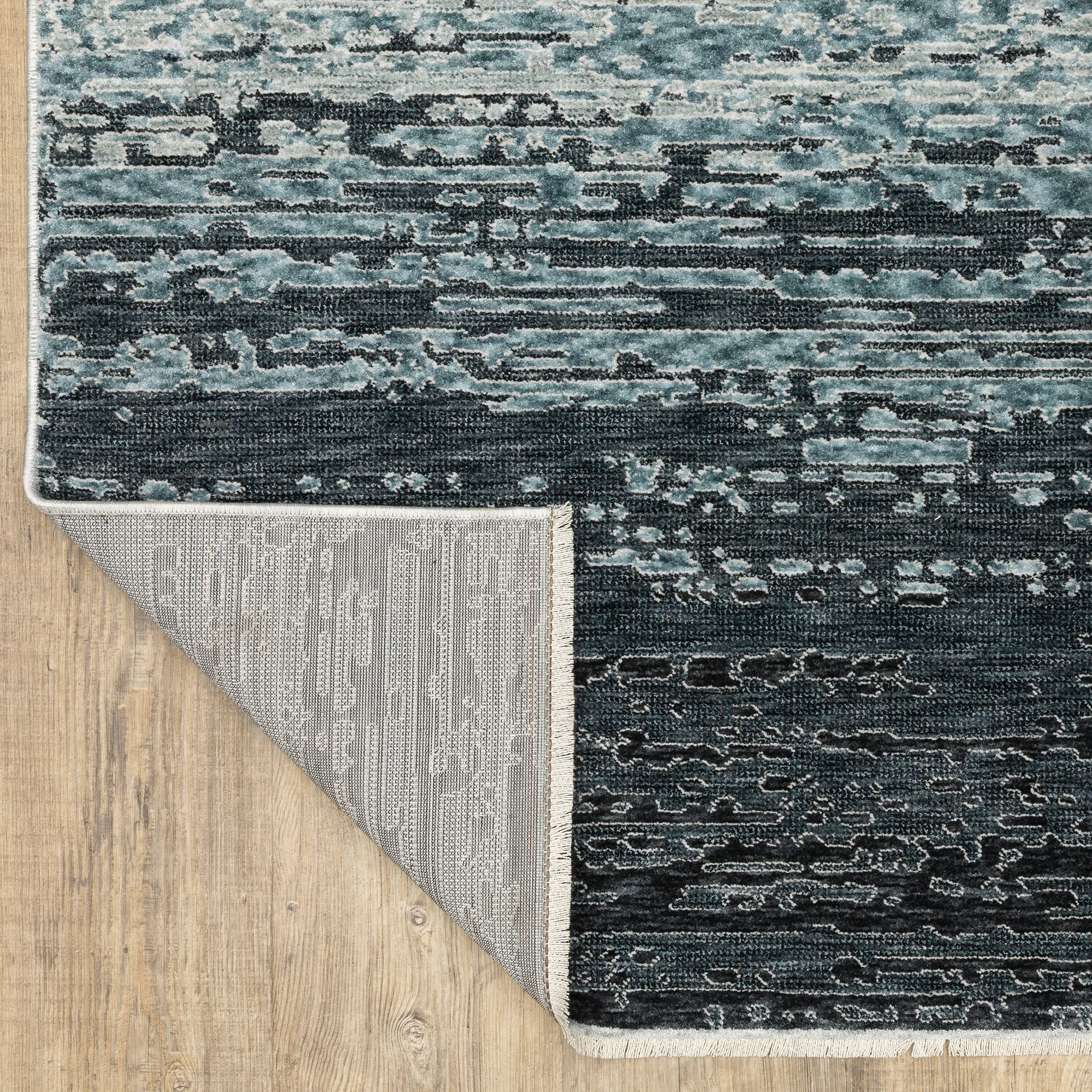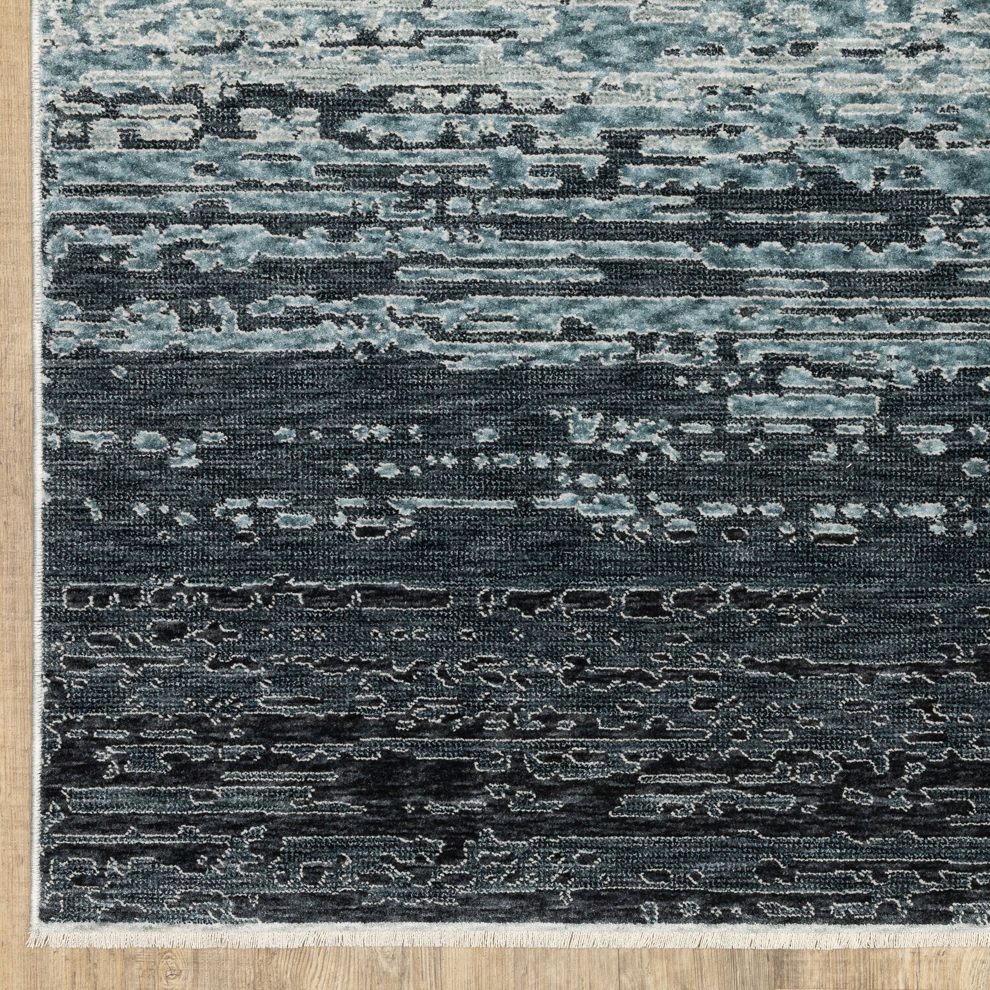 A bold color gradient catches the eye from the Beryl Abstract Area Rug. Power-loomed from polyester, the .32" thick rug features a space-dyed, textural abstract design filled with mottled hues of dark blue, indigo, aqua, silver gray, tan, ivory, and off-white. Fringed ends, .5"L, add extra charm. Backing is woven polyester. We recommend professional cleaning by a rug cleaner. Imported.