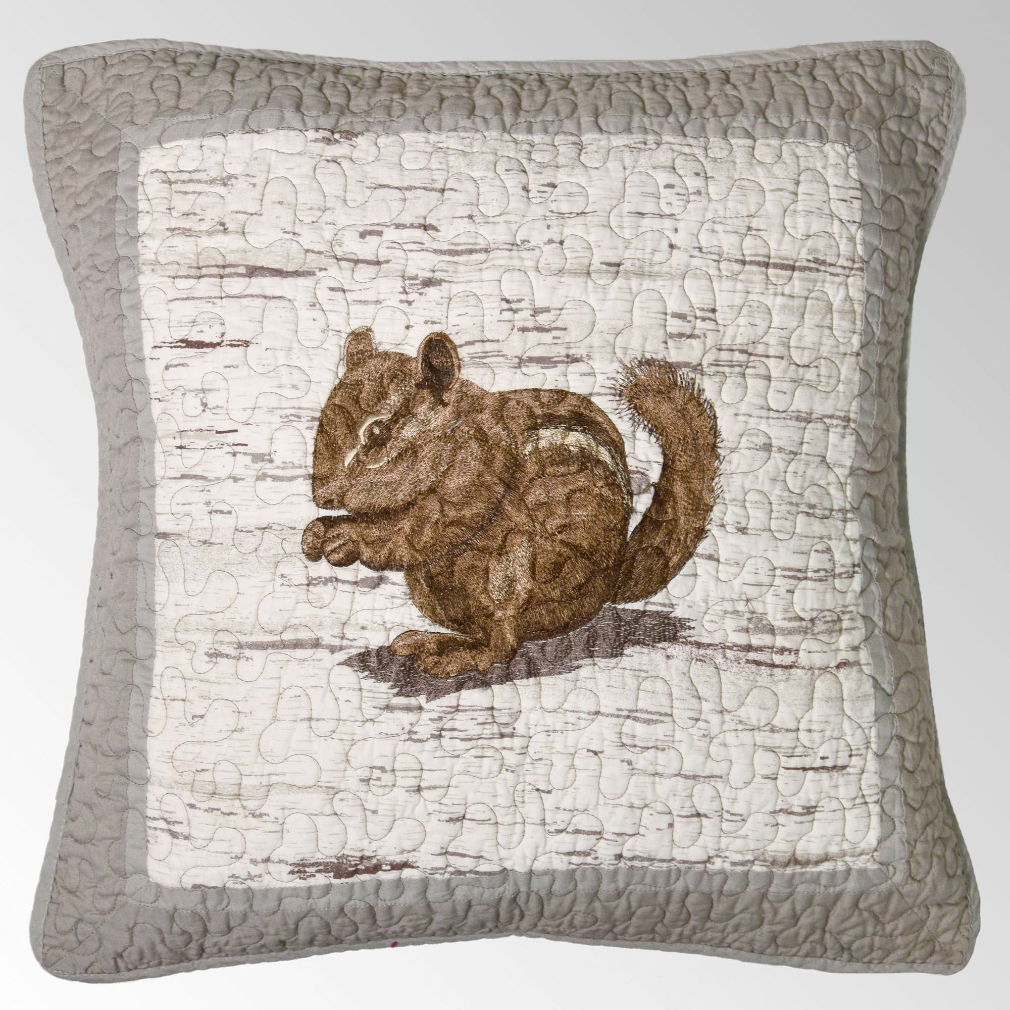 Pillows, except Solid Rectangle, have embroidered motifs on framed birch trees. Inserts are polyester. Piped Embroidered Rectangle features chickadees resting on a pine branch with pine cones; zipper closure. Piped Solid Rectangle is dark silver gray and reverses to birch trees; zipper closure. Chipmunk Square features a chipmunk and bound edges; French back closure with ties. Cabin Square has a log cabin and bound edges; French back closure with ties.