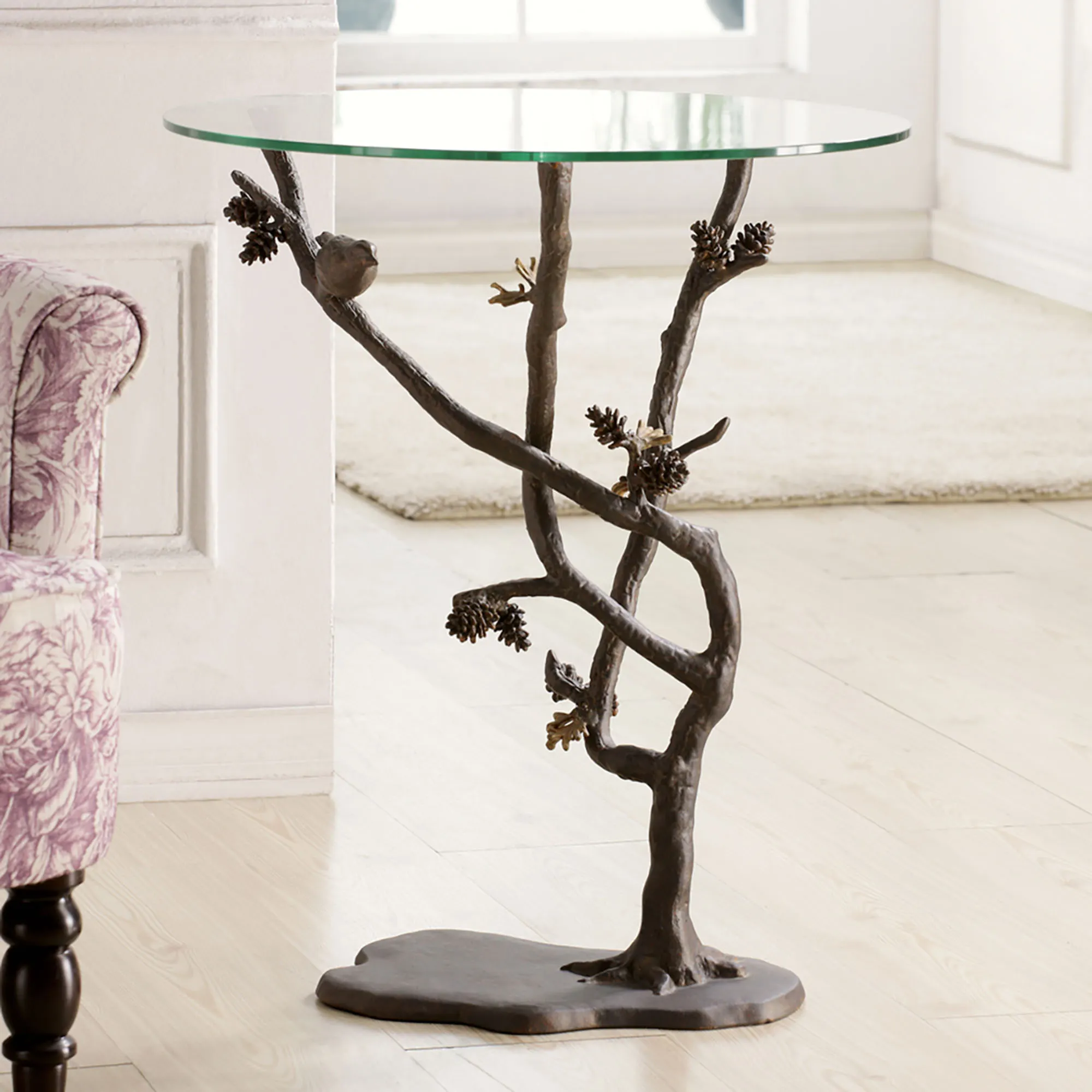 Bird and Pine Cone Rustic Branch Art Sculpture Accent Table with Glass Top