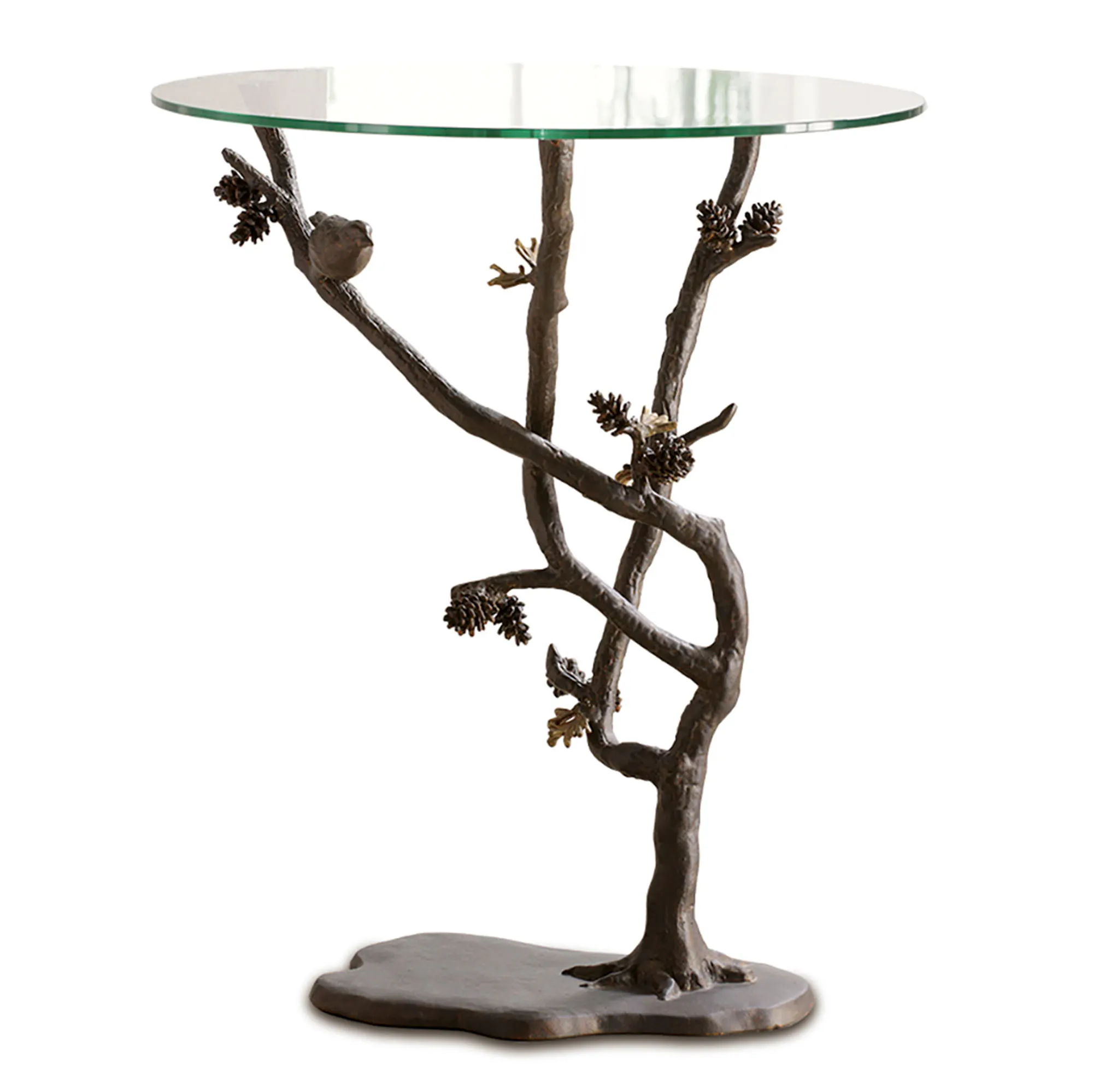 Let nature style your home with the charming Bird & Pine Cone Table. With a shaped, flowing base, the dark brown aluminum table design mimics the look of a realistic branch with bare textured twigs, pine cones, and light brown leaves. A bird is perched in the branches for further rustic beauty. The clear glass tabletop allows you to glimpse the nature-inspired design from any angle. Overall, the accent table measures 22"dia.x26"H and weighs approx. 17 lbs.