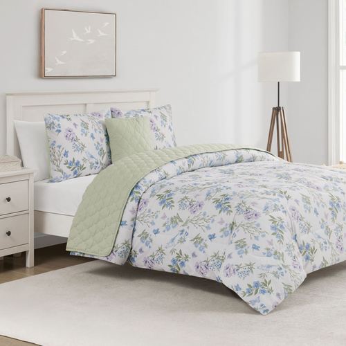 Comforter has florals and tailored edges. The pale green quilt has bound edges. Shams have florals, tailored edges, and a French back closure. Reversible square pillow is quilted pale green with tailored edges; spot clean.