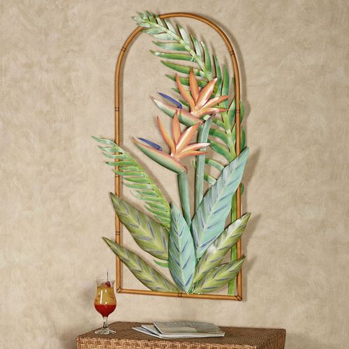 Pick out the perfect exotic locale for the Tropical Florals Bird of Paradise Arched Wall Art. This handcrafted and handpainted metal wall art, by artist Joanne Ferrara, has an arched bamboo-style frame, two birds of paradise flowers, and leaves. Wall art may be used outdoors under a covered patio or porch. Due to the handcrafted nature, slight variations may occur. Measures 23"Wx2.5"Dx40"H.