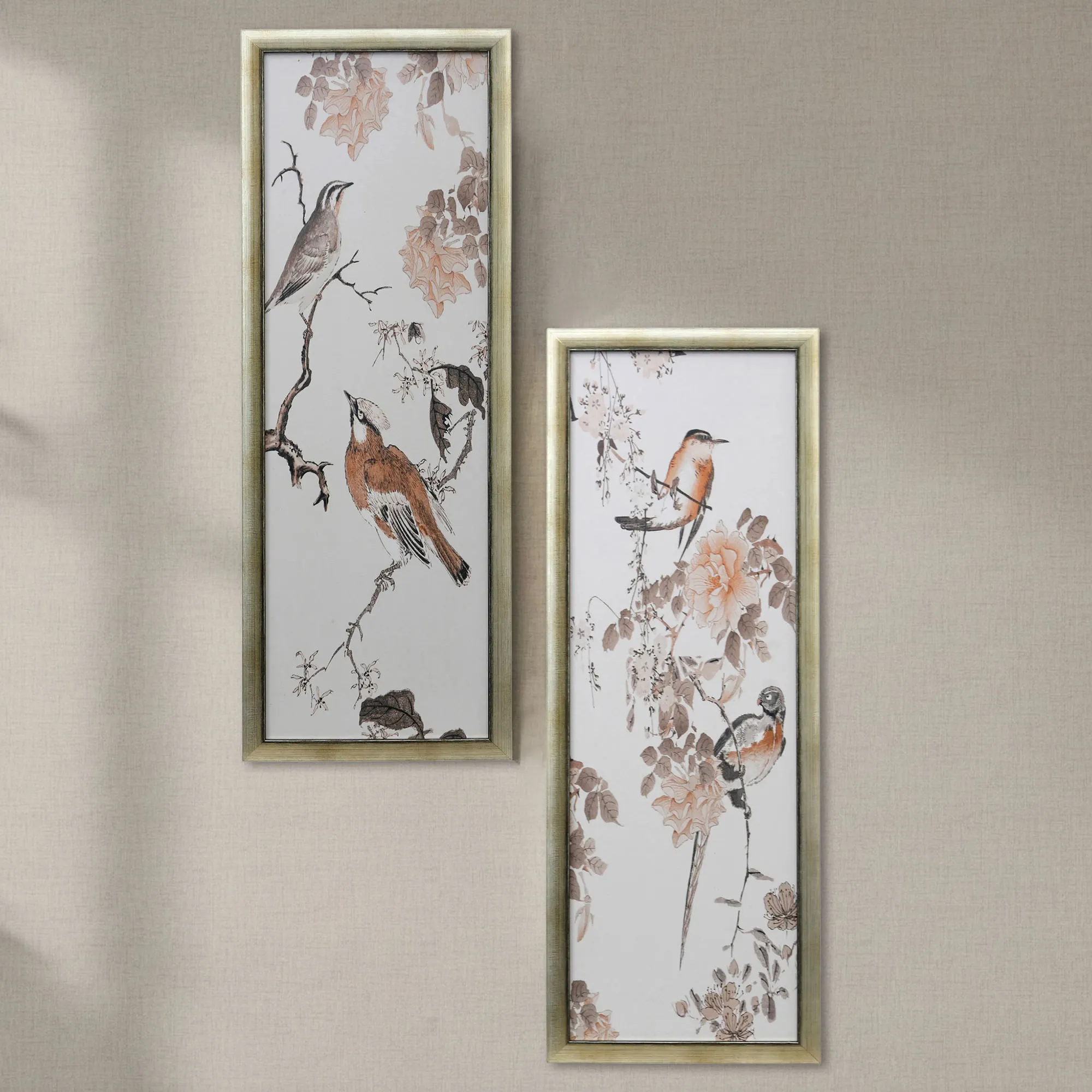 Everyone loves to see sweet Birds in Blossoms. Each charming, nature-inspired wall art is a textured paper print with a gel coating and features birds sitting among flower blooms. Colors include charcoal, copper, pale apricot, taupe, and ivory. The polystyrene frame is champagne gold. Birds I has a charcoal bird at the top. Birds II has a rust and charcoal bird at the top. Each framed bird wall art measures 15"Wx1.5"Dx39"H.