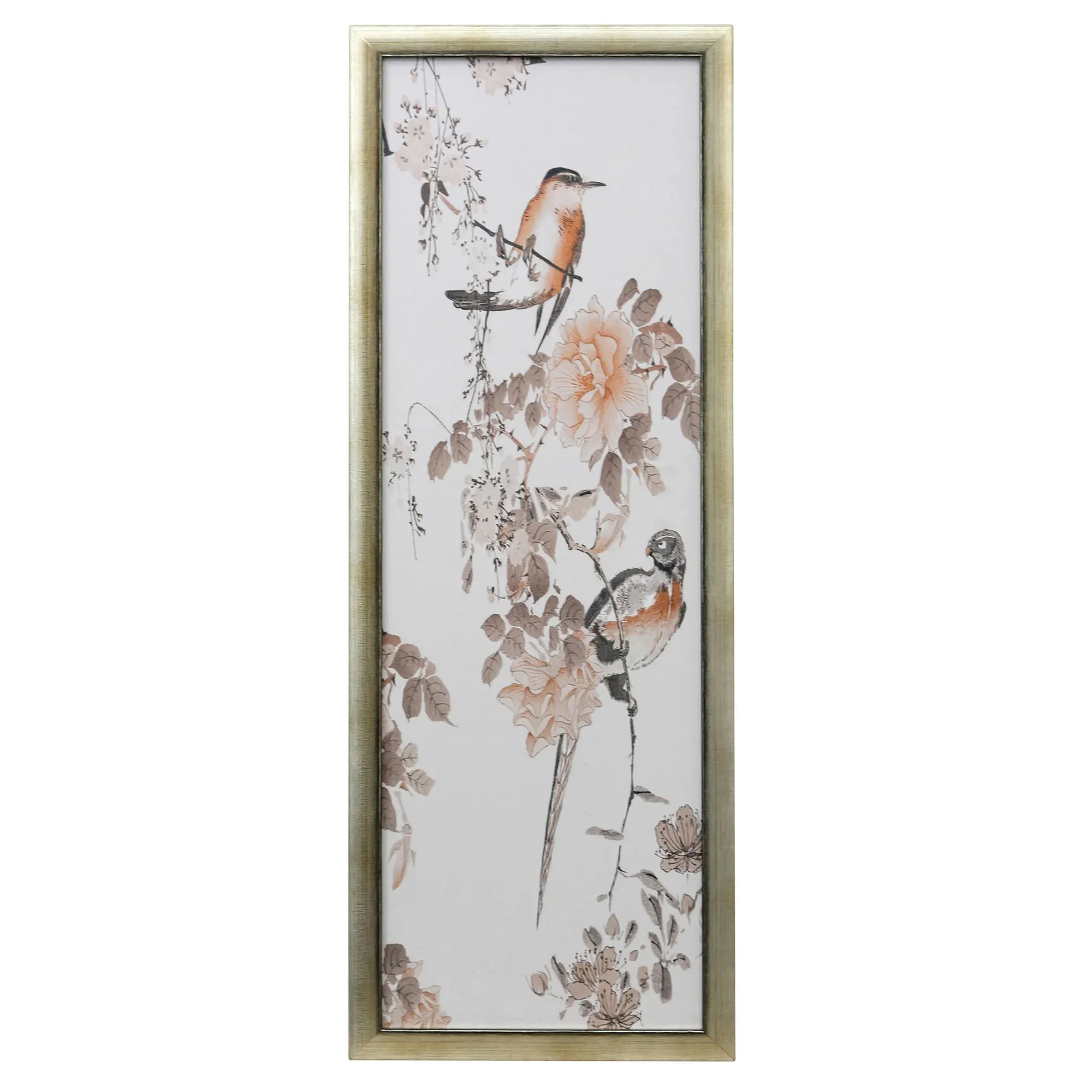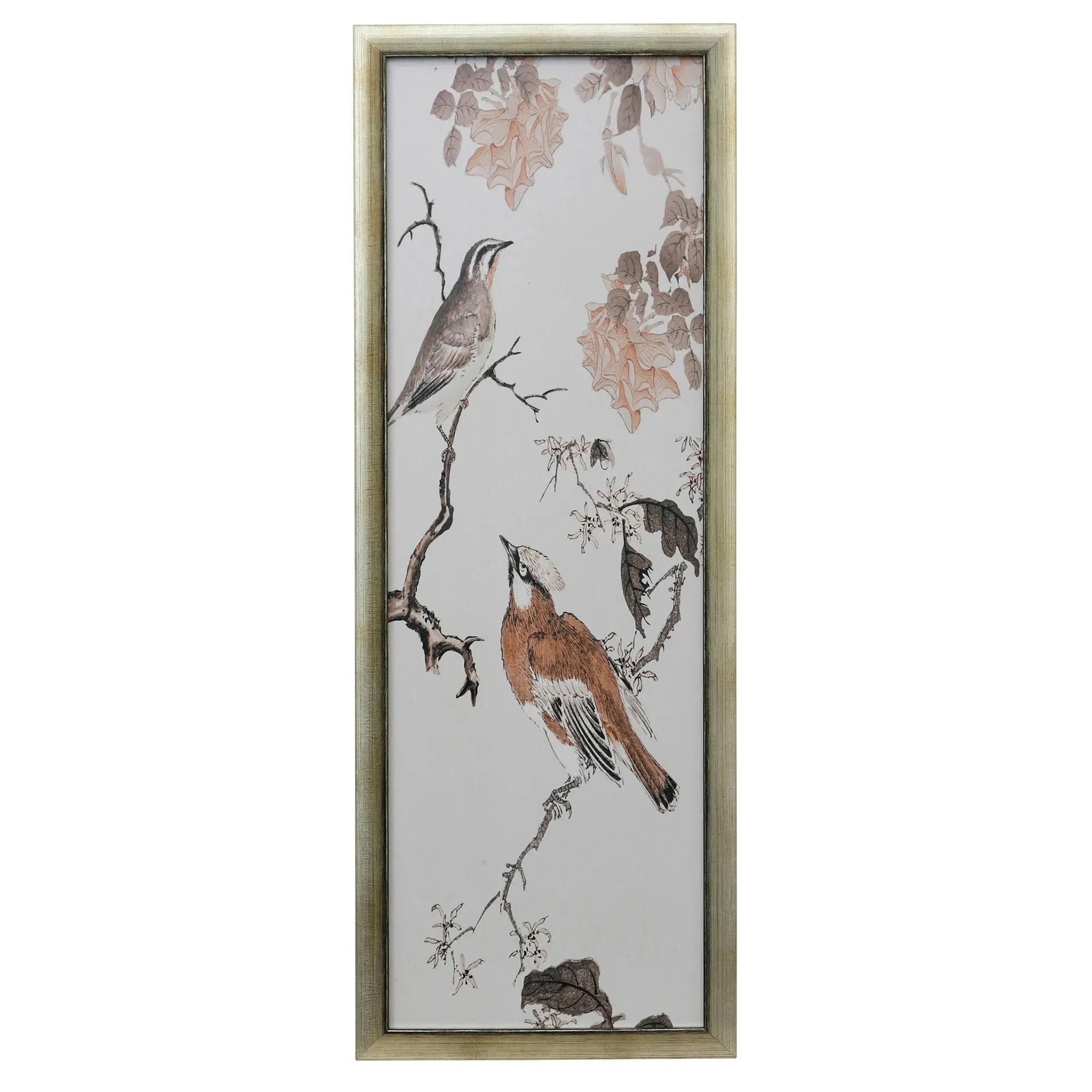 The Birds in Blossoms Framed Wall Art is a textured paper print with a gel coating. The frame is polystyrene. Made in the USA.