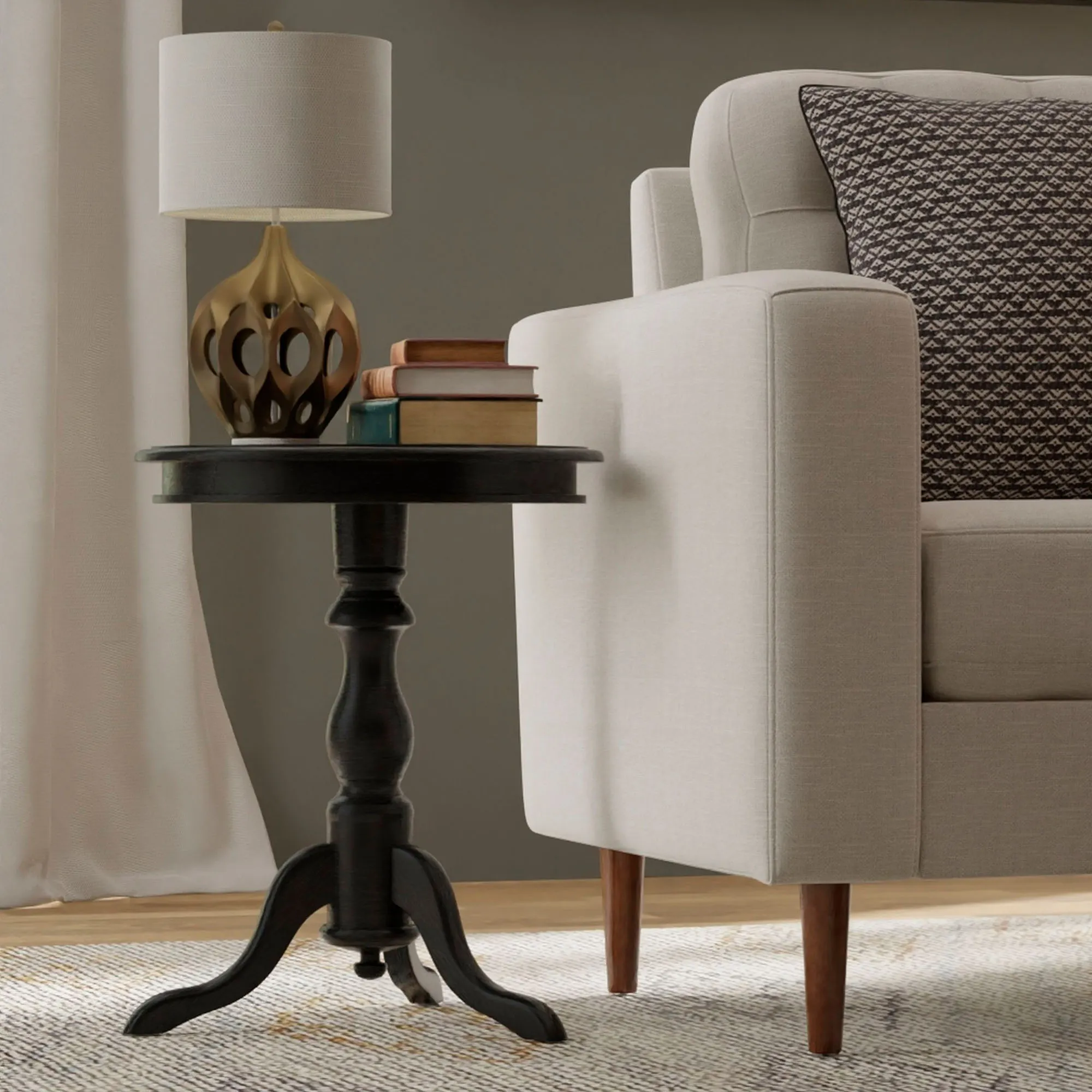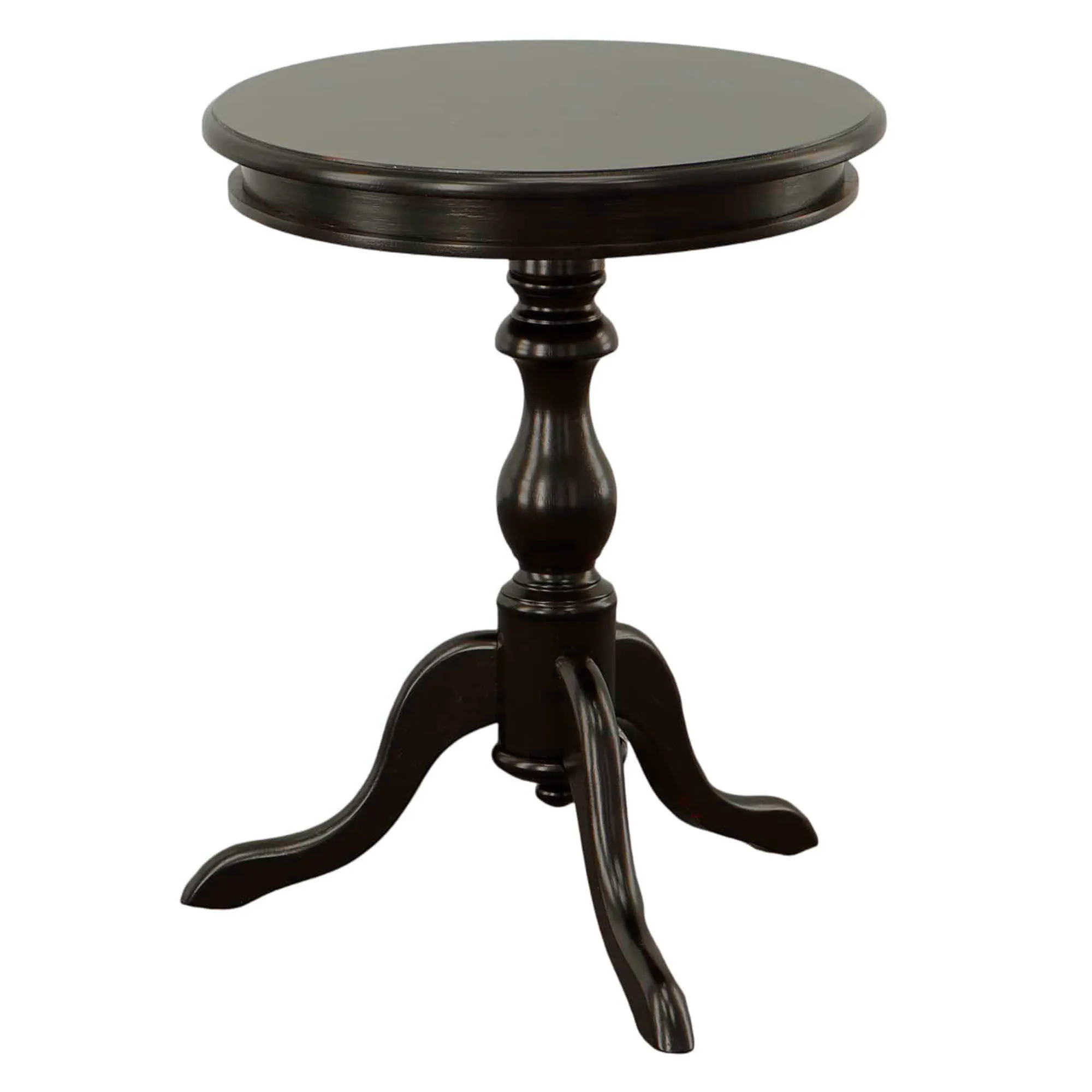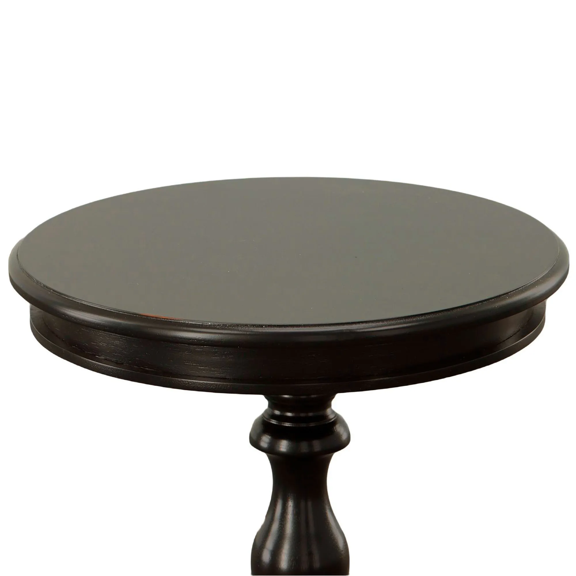 A lathe-turned pedestal-style body and contour legs make the Bishop Round Accent Table look sophisticated. This wooden table is hand-finished in black and has a beveled top. The maximum recommended weight is 50 lbs. Measures approx. 20"dia.x25.5"H; weighs 15 lbs.