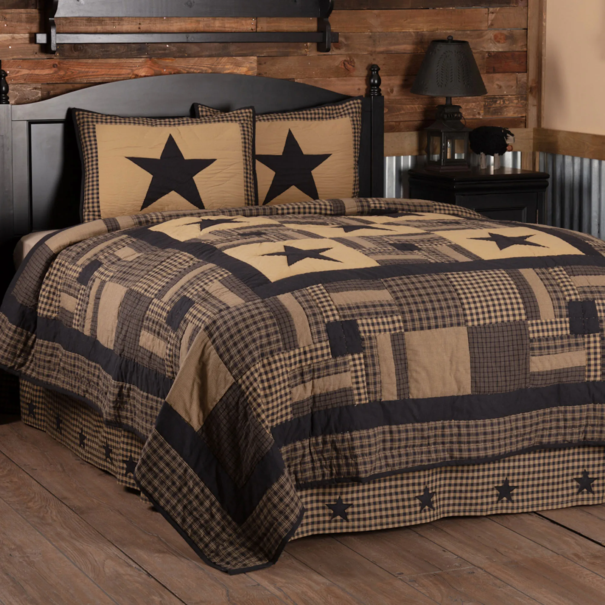 The 16" drop Bedskirt is black and tan plaid cotton with appliqued black stars and split corners. Choose Twin, Queen, or King.