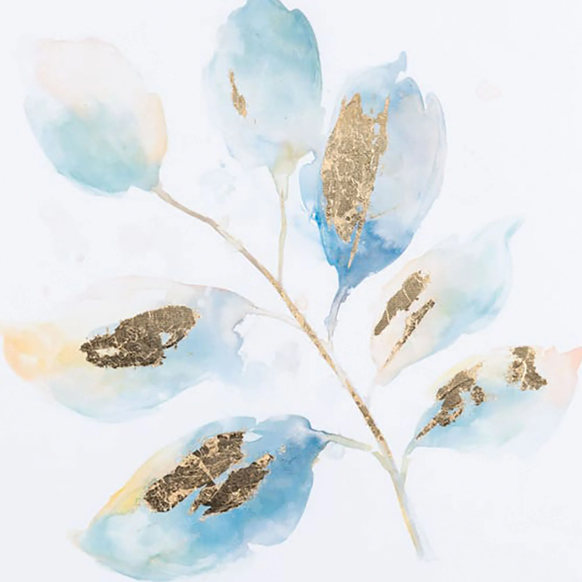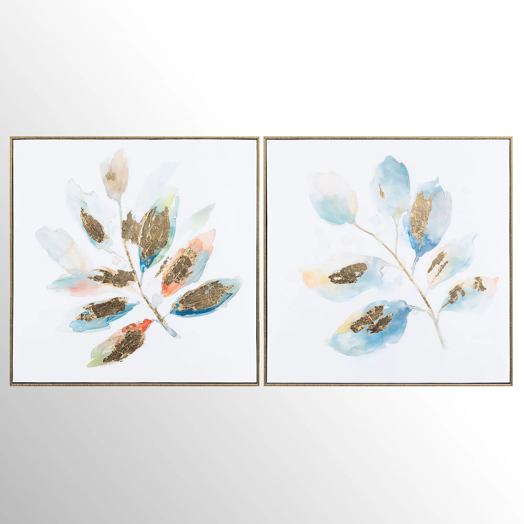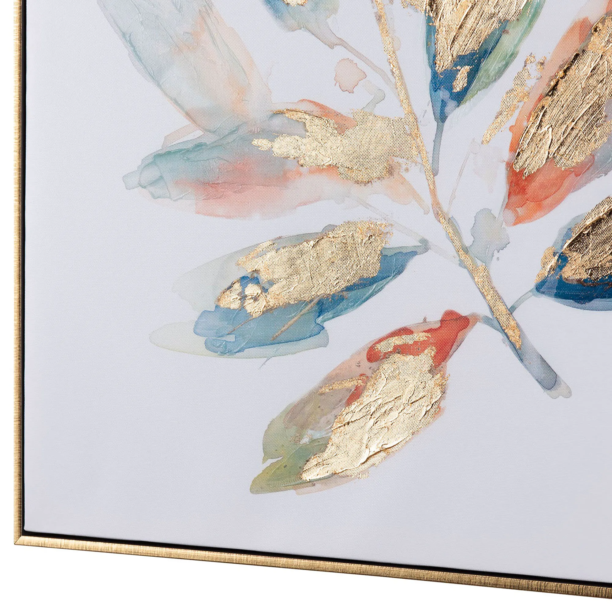 Enjoy the abstract look of the Blair Leaf Canvas Art Set. This canvas wall art has a watercolor effect in hues of blue and russet along with gold foil embellishments. Canvas art is wrapped around a wooden frame and inset into a gold shadowbox-style frame. Each is 24"sq.x2"D.