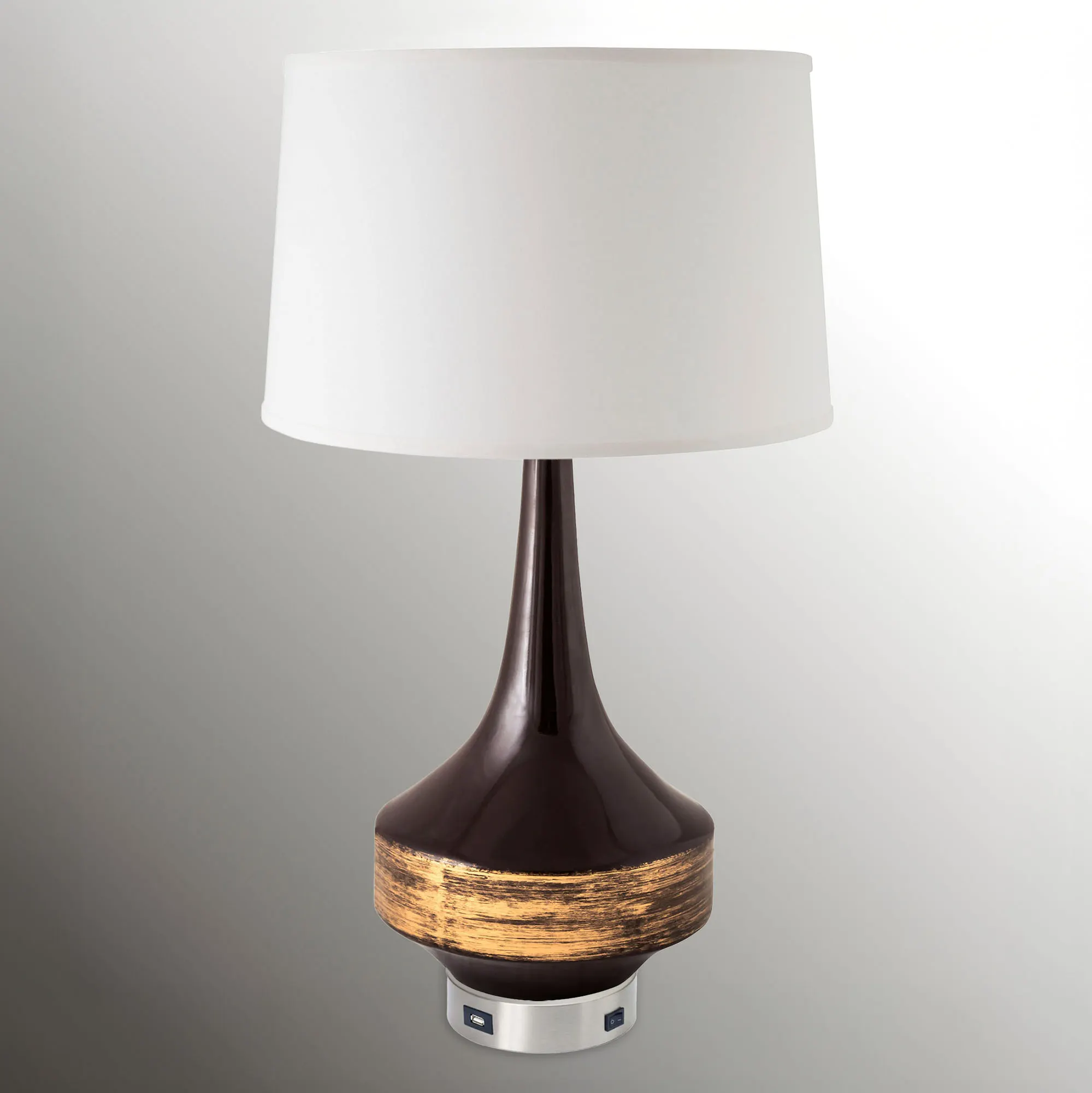 Sleek sophistication defines the Blaise Table Lamp. Handcrafted in the USA from local ceramic clay, the lamp features a flared base hand-finished in dark brown with a metallic band of brushed gold. An optional brushed steel mounting base, 6.5"dia.x1.5"H, adds further convenience with a built-in USB port, outlet, and on/off switch. A chic white linen drum shade tops the lamp. UL listed. Requires one 100W max. bulb. Overall, the table lamp measures 18"dia.x30"H.