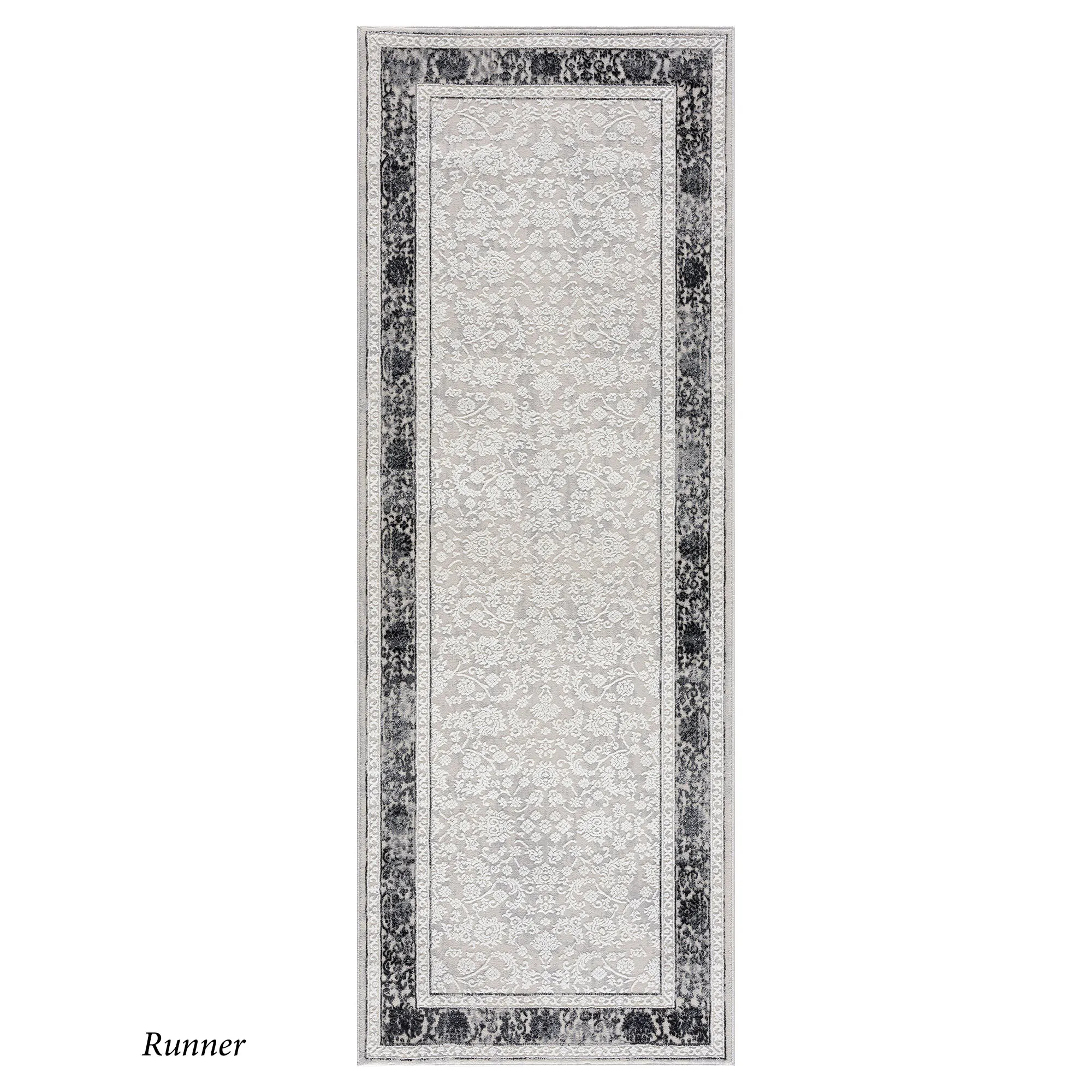 Scrolling motifs classically embellish the Blanche Rug. Power-loomed olefin/polyester area rug, .39" thick, includes shades of charcoal, gray, and off-white. We recommend professional cleaning by a rug cleaner. Imported.