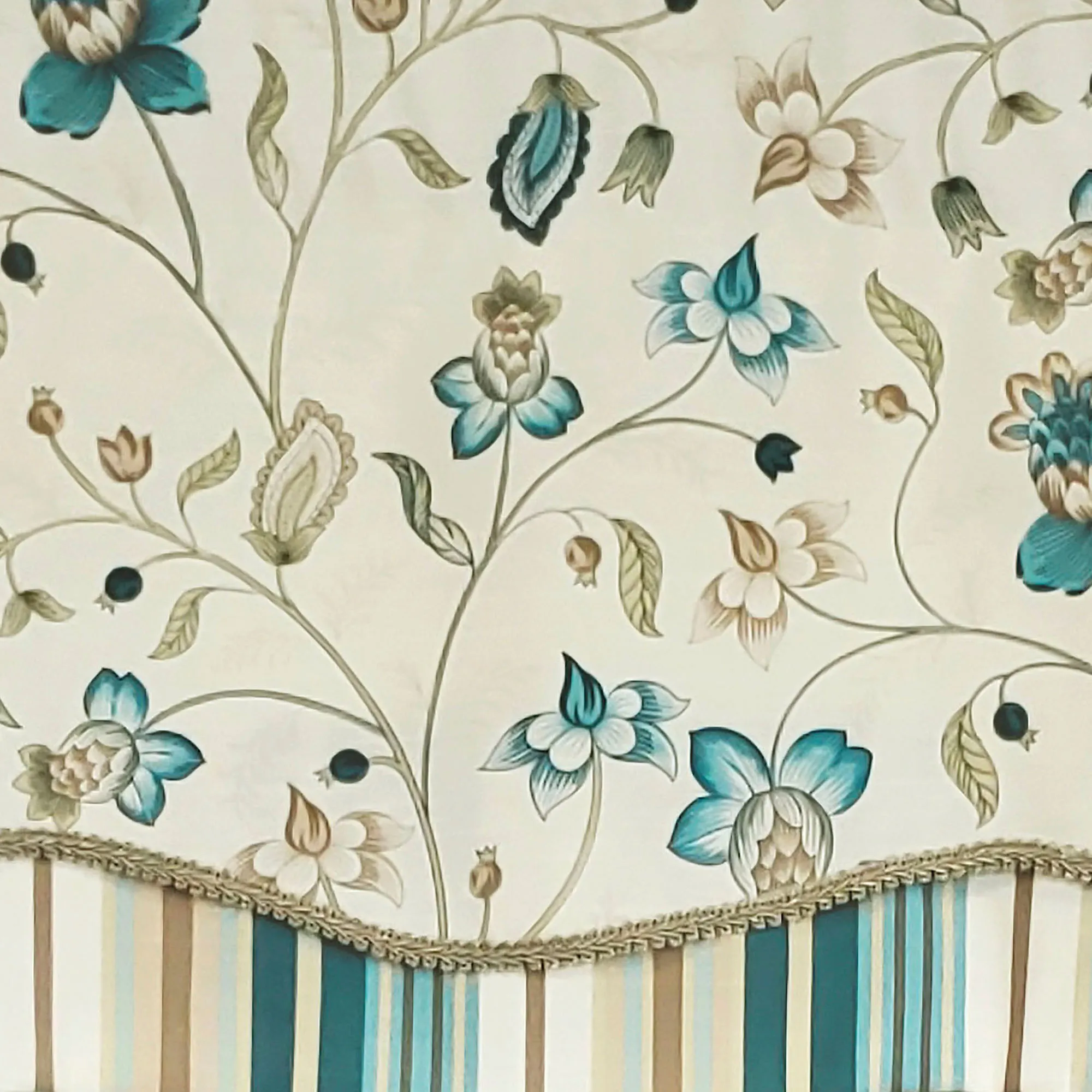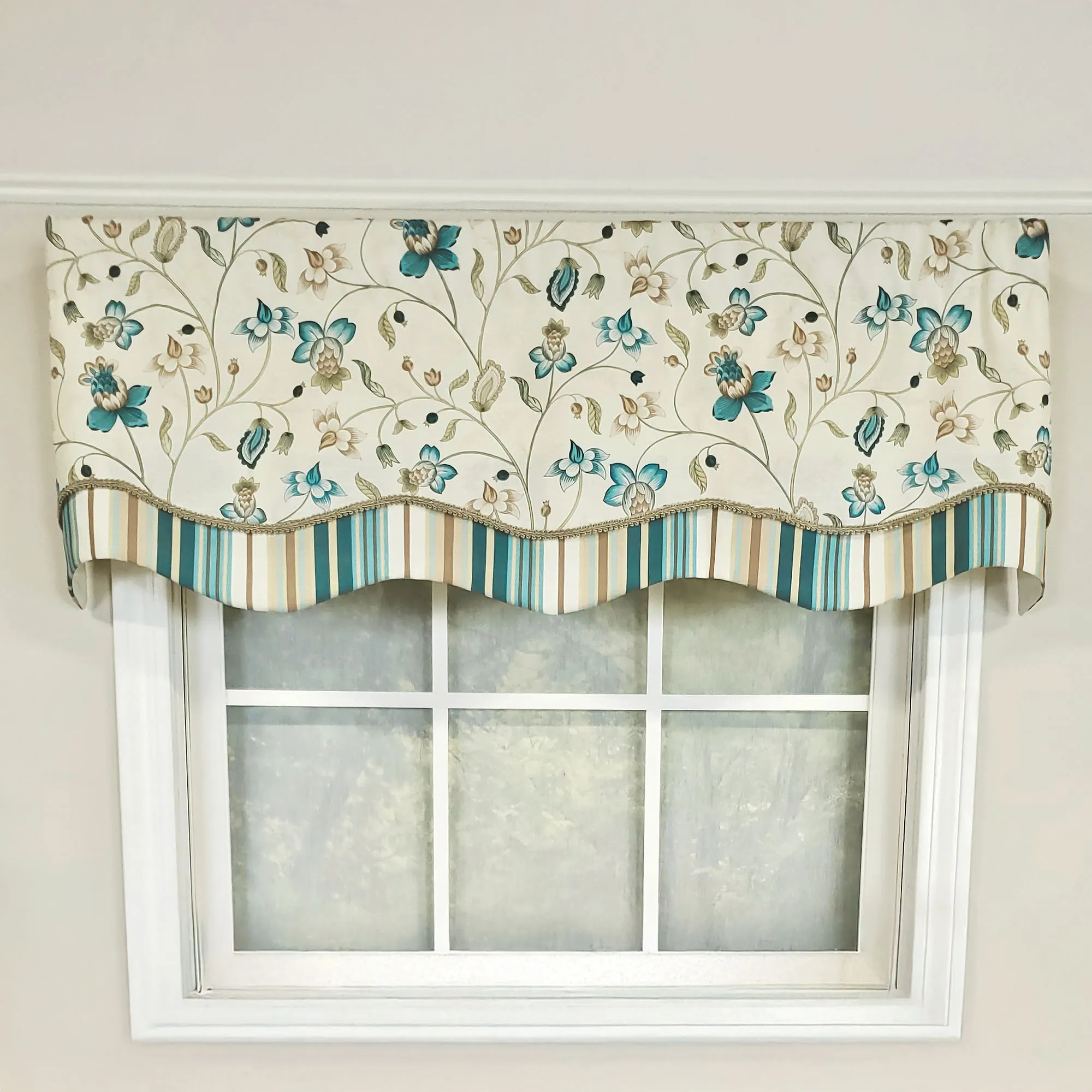 Flirty florals lend a sweet ambiance to the Blanford Window Valance. This layered, cotton valance has a vining flower design on eggshell, gimp trim, a 3" rod pocket, a scalloped edge, and a striped bottom layer. Colors include shades of blue, sapphire, glacier, pastel blue, apricot, light brown, straw, and ivory. Lining is polyester/cotton. Measures 50"Wx16"L. Spot clean.