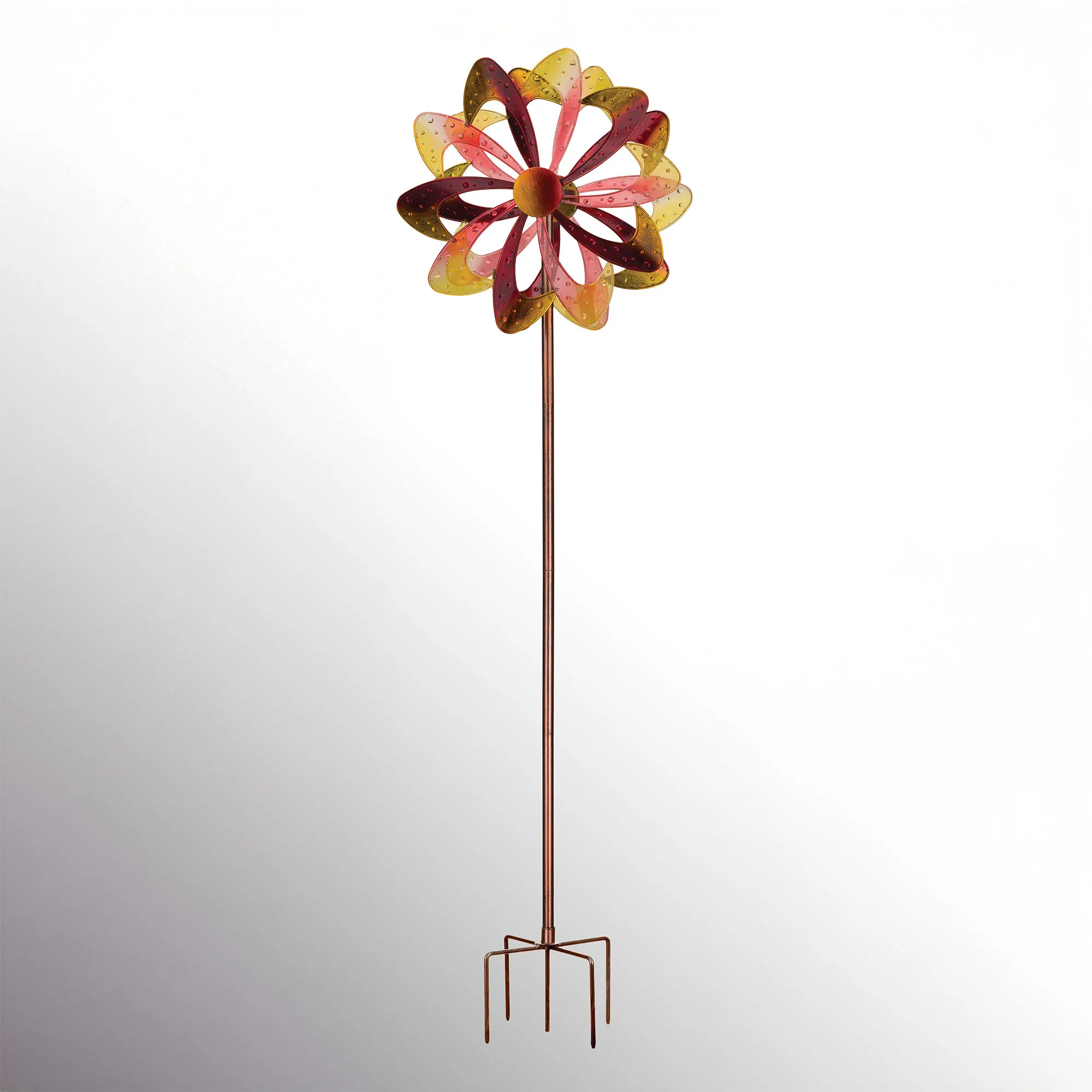 The Blaze Rotating Solar Wind Spinner adds a rustic look to any garden or landscape. Made of metal, this wind spinner has solar-powered LED lights on the edges of the large 24" acrylic blades that spin in opposite directions. The top pole of this double wind spinner can turn a full 360 degrees. The weather- and fade-resistant colors include red and yellow. The waterproof solar panels and the included replaceable, rechargeable 18650 3.2V 1200mAh battery, when fully charged, can provide up to 6-8 hours of continuous light. The wind spinner has a thick and strong five-prong ground stake. Outdoor year-round use. Measures 24"Wx10"Dx79"H.