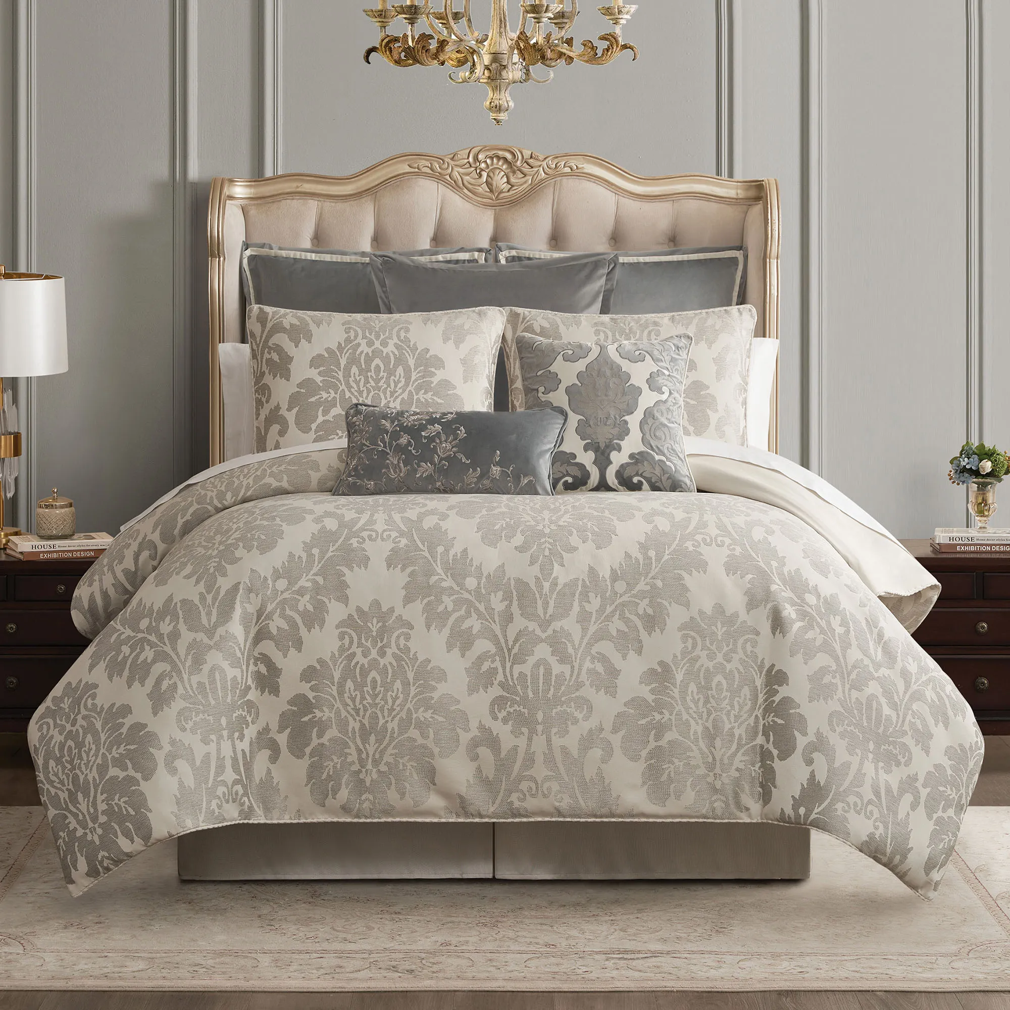 Blenheim Platinum and Warm Ivory Damask Comforter Set Luxury Bedding by Waterford Linens