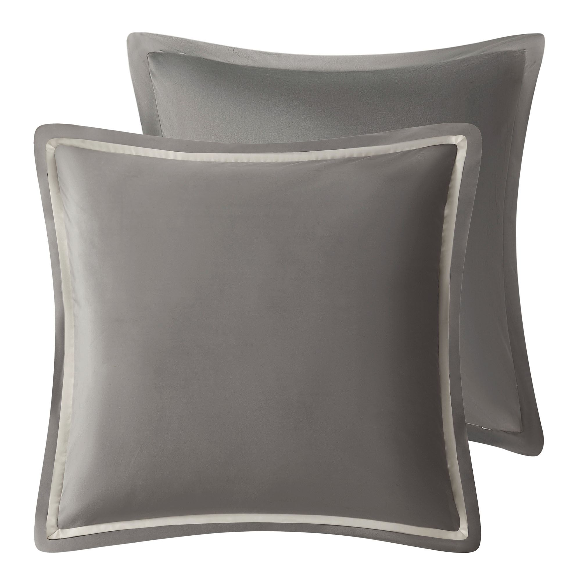 The gray velvet European Sham has a platinum gray and warm ivory double flange, zipper closure, and reverse of solid gray velvet.