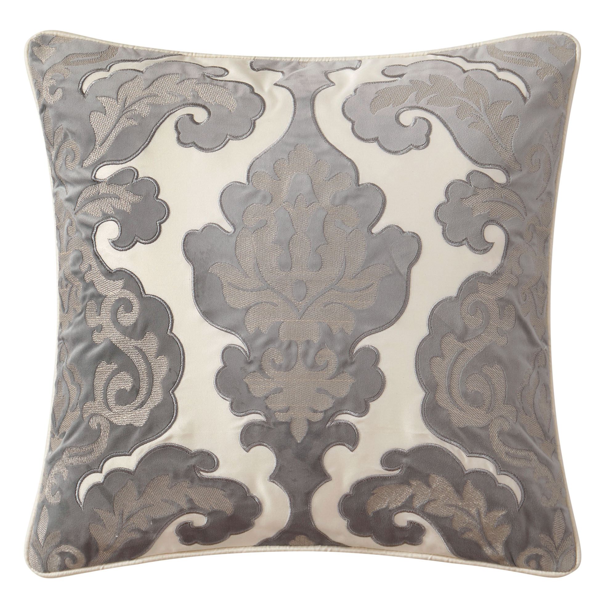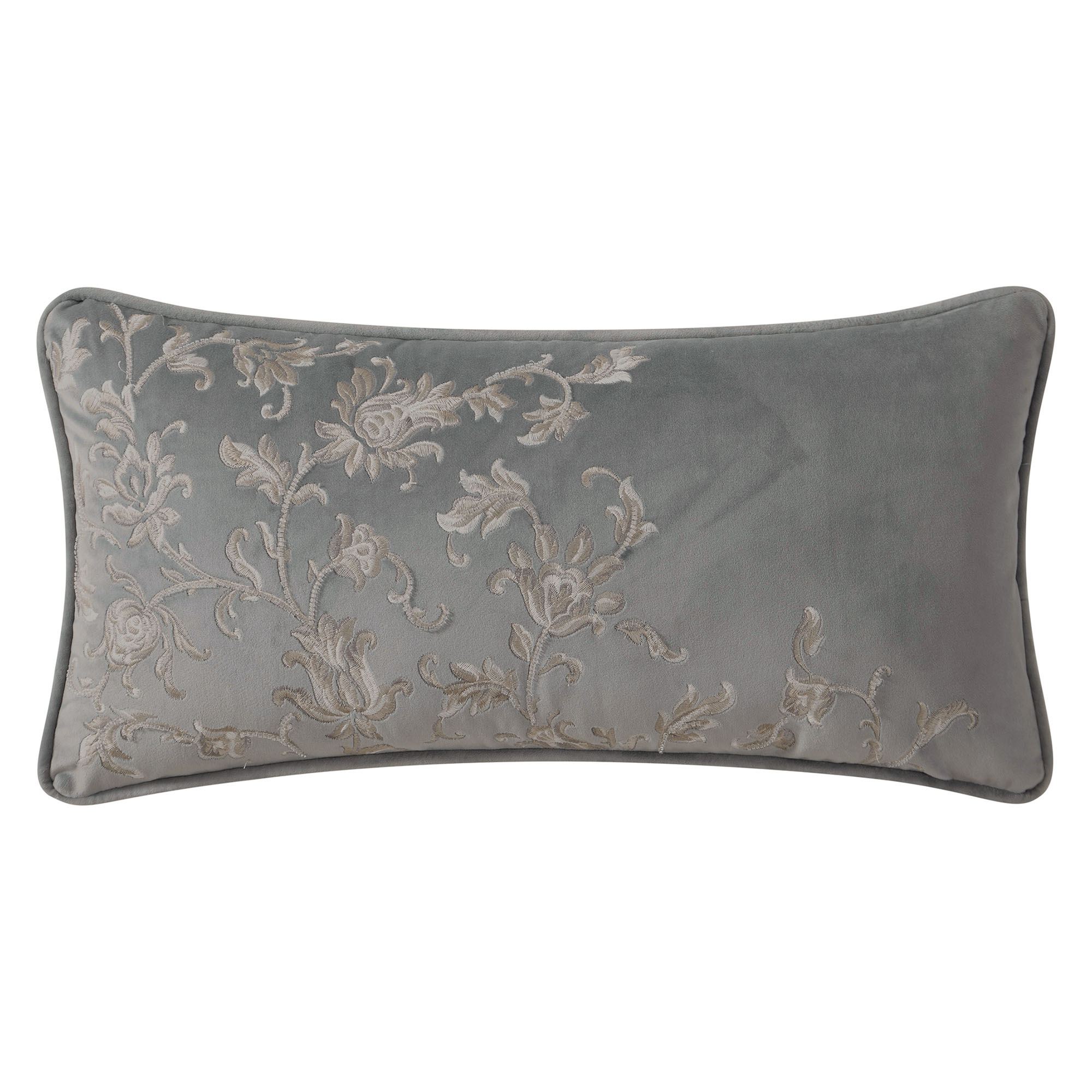 Piped Pillows: Spot clean. Rectangle is gray velvet with floral embroidery and subtle bead detailing. Square has gray velvet applique and platinum woven-jacquard detailing on a warm ivory sateen background.
