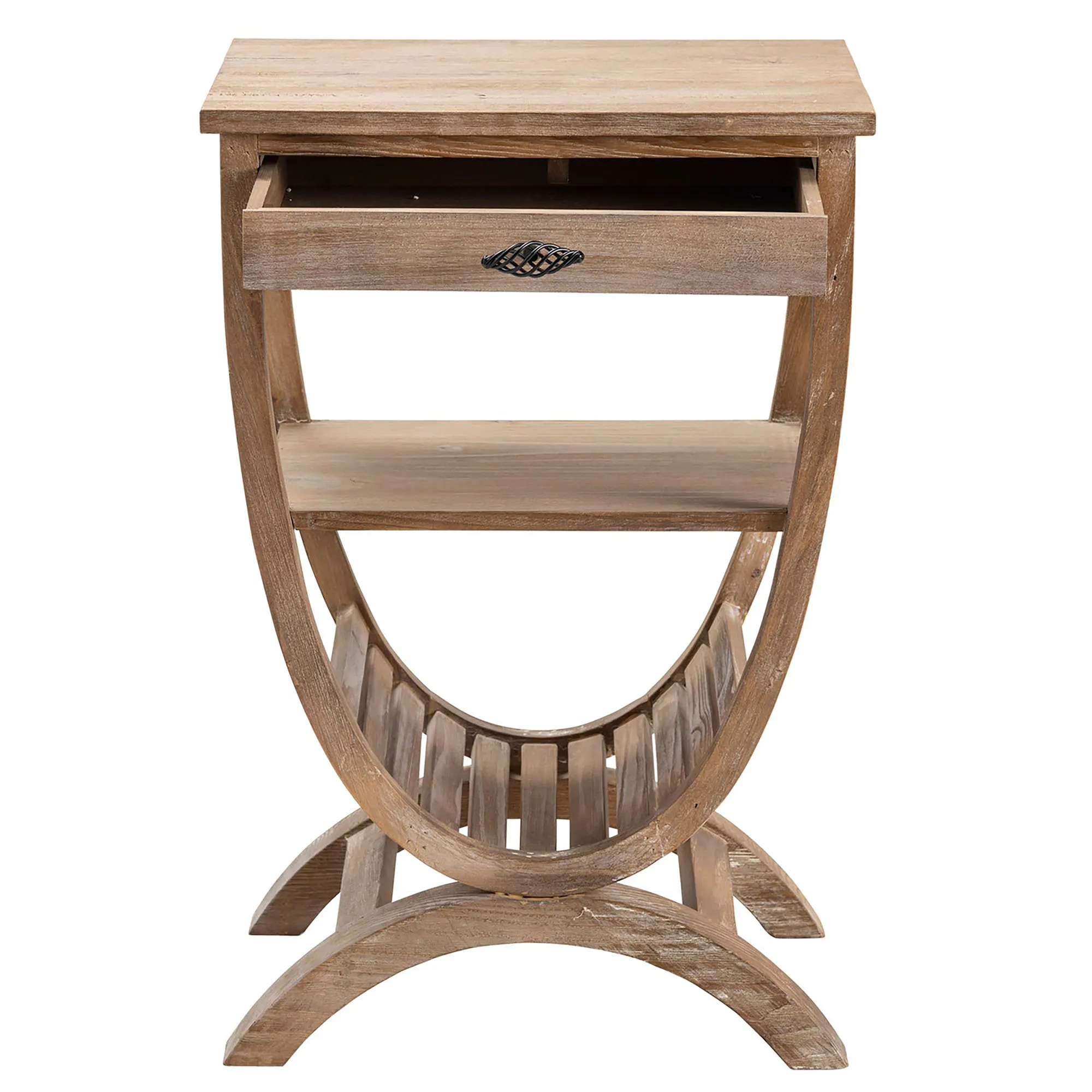 The Blondelle Accent Table has a rustic and unique style that you will love. Made of poplar wood, this table has a light brown finish and a slatted, curved wood bottom to hold reading materials. The drawer with metal pull and solid middle shelf also provide extra storage. Table would look great next to your favorite chair. Measures 20"Wx16"Dx30"H; weighs approx. 16 lbs.