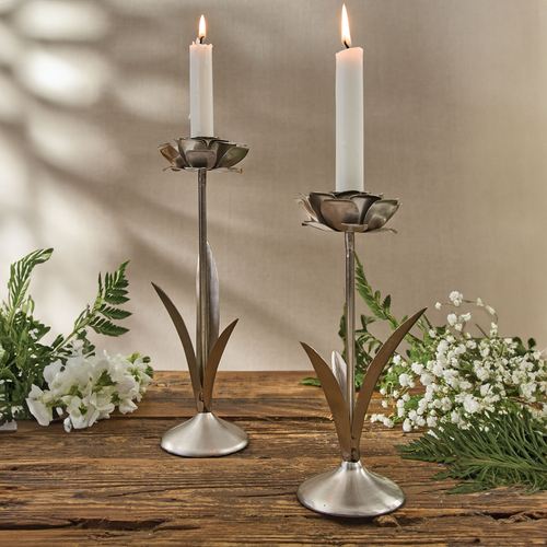 Whimsy, romance, and charm Bloom from this unique taper candleholder set. Finished in satin nickel, each metal candleholder resembles a blossoming rose with flaring leaves and base. The lovely roses hold your taper candles in the center. We suggest use with LED taper candles. Each measures 3" dia. Set includes small, 8"H; and large, 10"H.