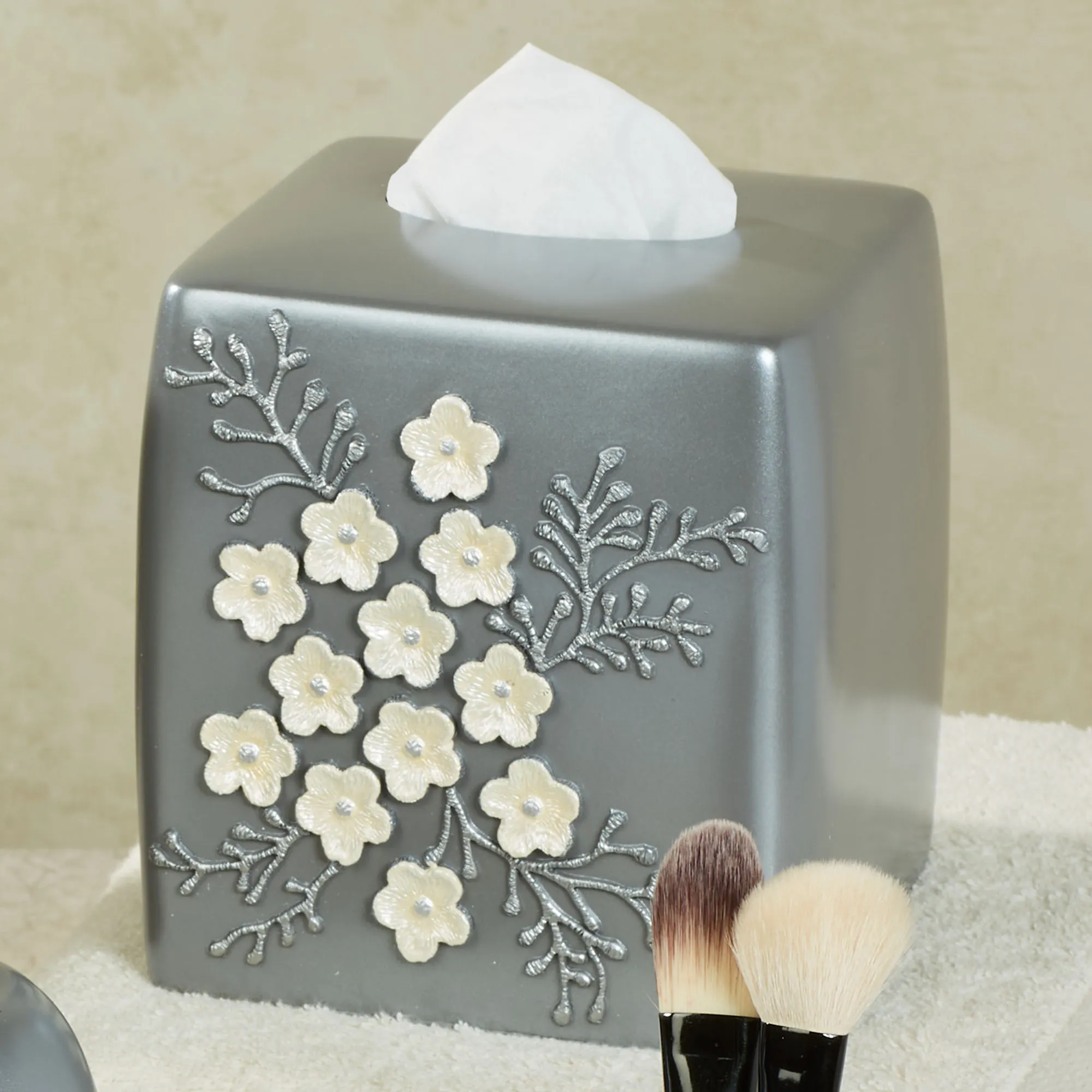 Sweet florals blossom upon the Bloomfield II Bath Accessories. These handpainted resin bath accessories feature raised cream blooming florals and branches on gray. The Brush Holder can be used to hold your toothbrushes or makeup brushes. Specify Wastebasket, Tissue Cover, Lotion/Soap Dispenser, Brush Holder, or Soap Dish.