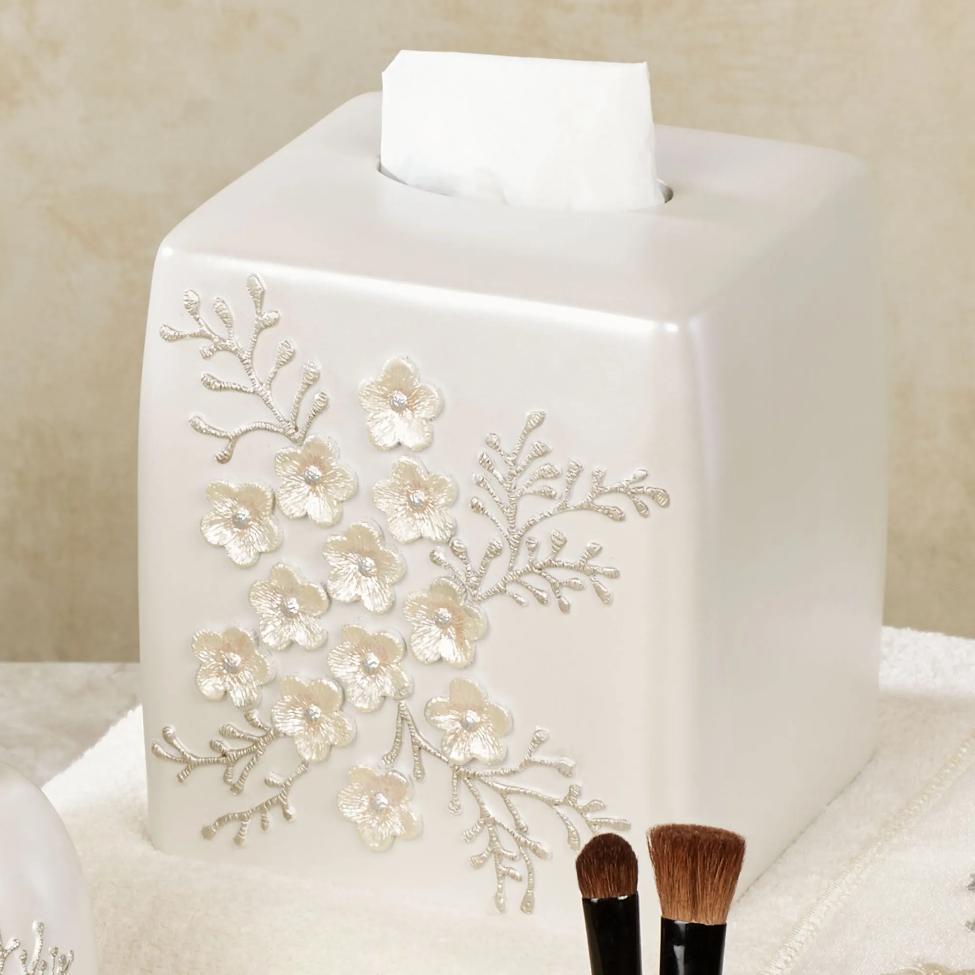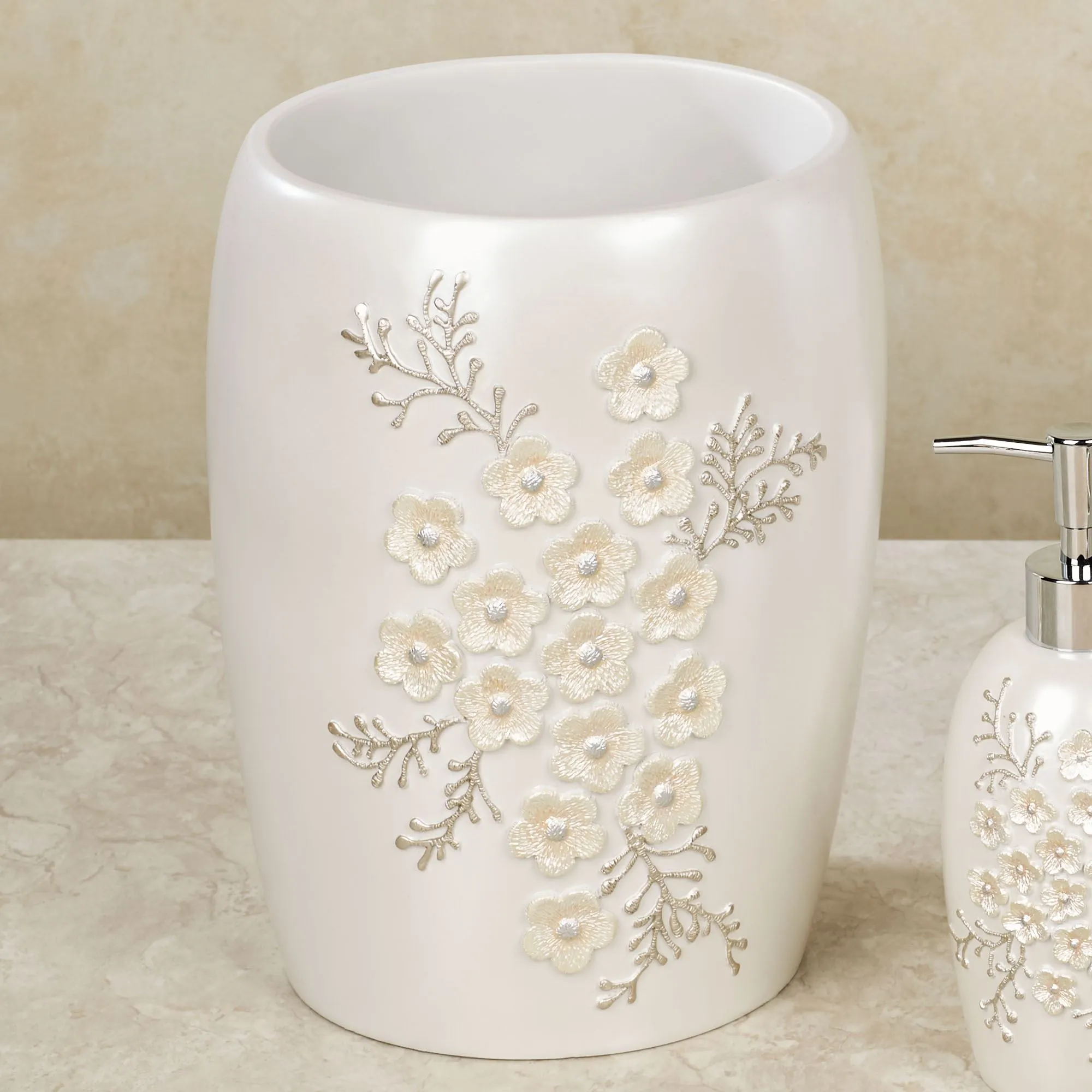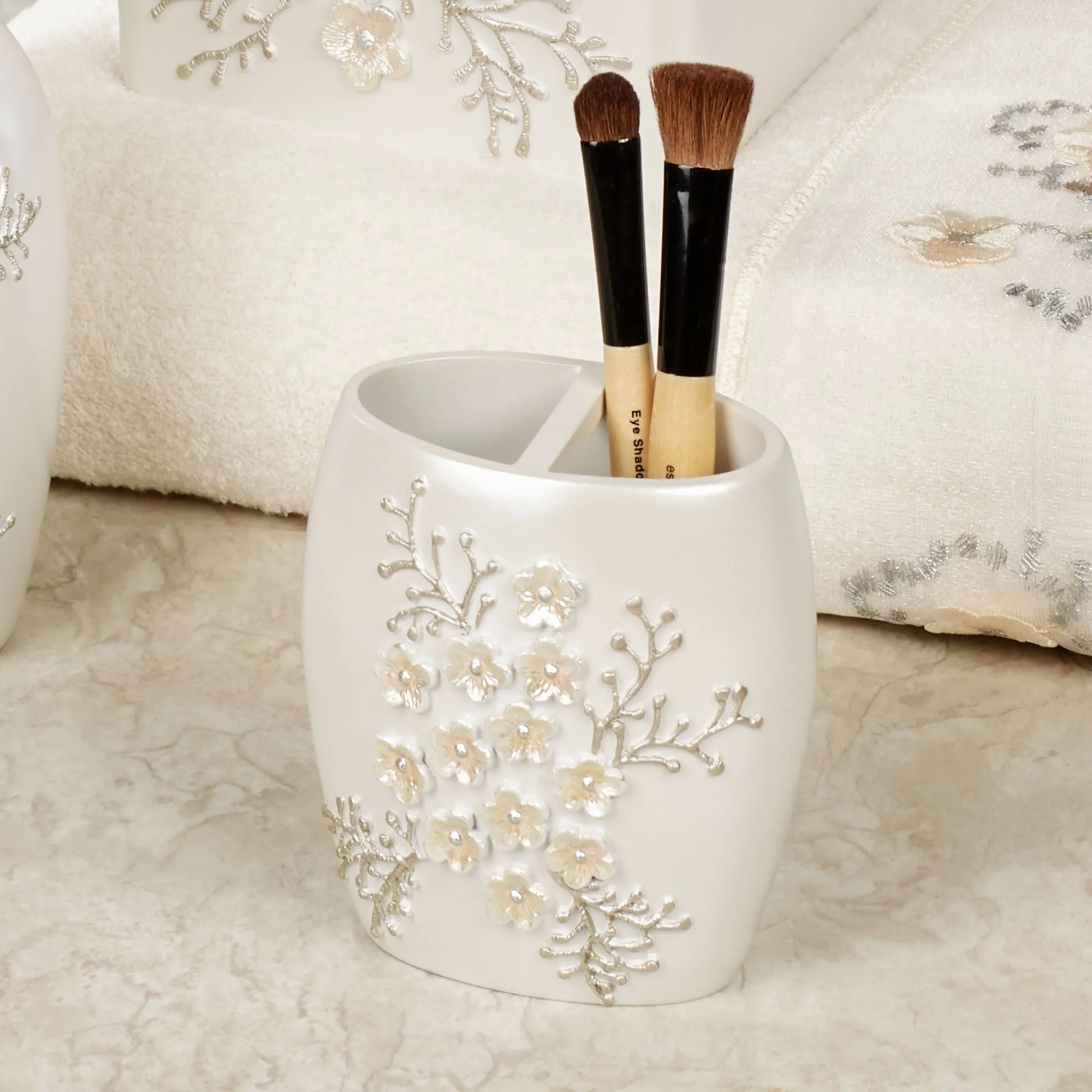 Sweet florals blossom upon the Bloomfield Bath Accessories. In champagne and light bronze hues, each eggshell resin bath accent features abundantly blooming branches. The Brush Holder can be used to hold your toothbrushes or makeup brushes. Specify Lotion/Soap Dispenser, Tissue Cover, Wastebasket, Soap Dish, or Brush Holder.