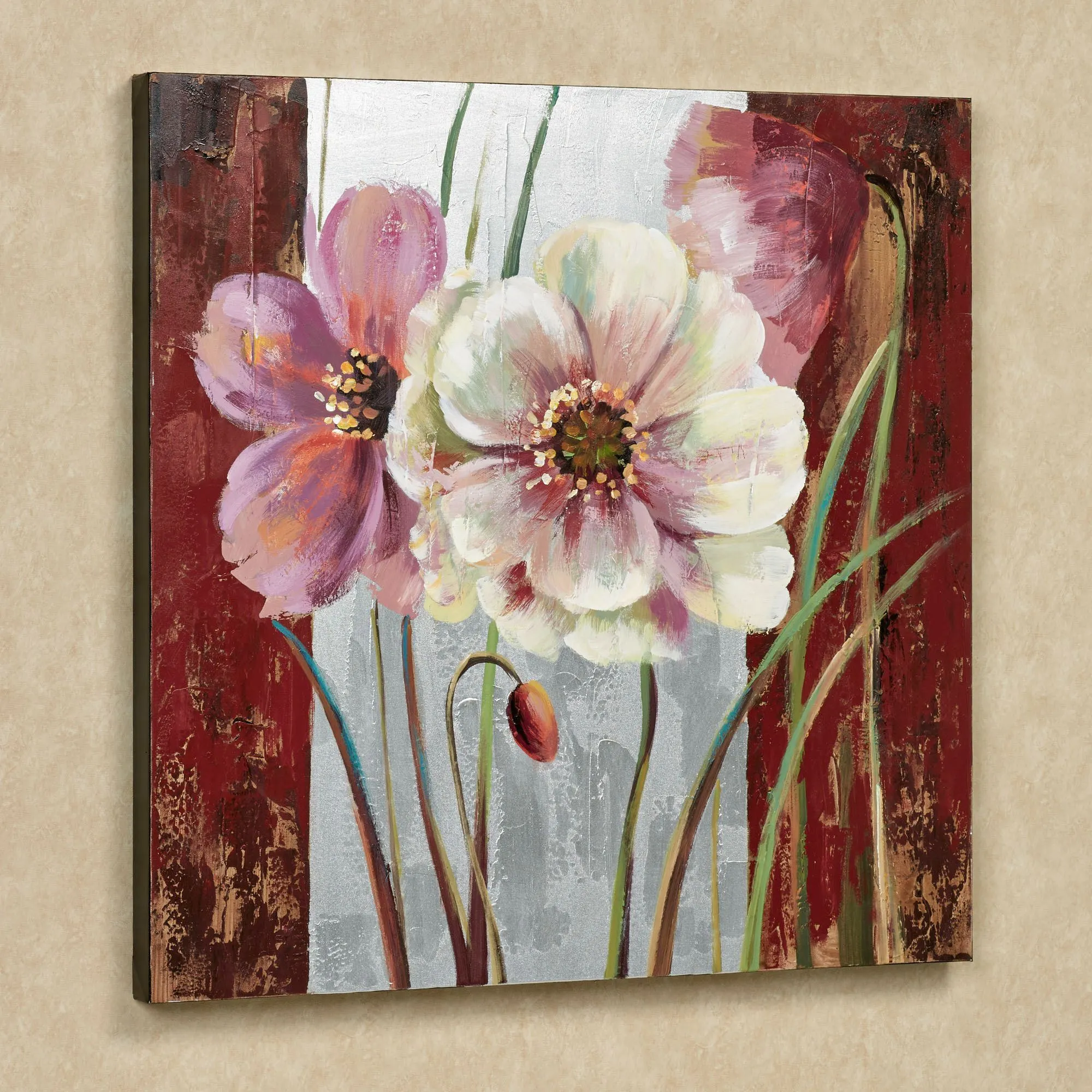 The Blooming Beauties Floral Canvas Wall Art will adorn your wall with a deeply rich vision of loveliness. Handpainted oil painting on canvas features three blooming flowers done in multiple color shades of rose pink, blush, soft pink, mauve, orchid, purple, violet, pale yellow, white, and burgundy over a background of burgundy, merlot, and metallic silver. Canvas is gallery-wrapped over a wood frame. Due to the handpainted nature of this item, minor variations may occur. Floral wall art measures 32"sq.x2"D.
